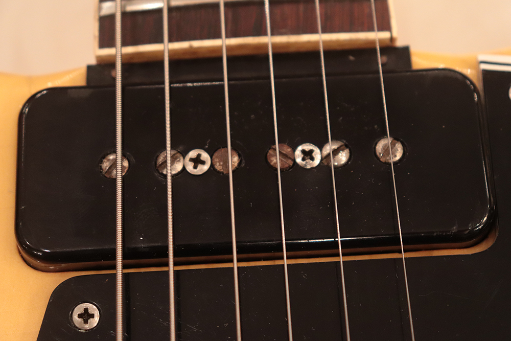 勿論、サウンドは後の”SG“モデルとは比較しても、厚めのスラブ・ボディから生まれる、太いロー・ミッドと、ハムバッカーよりもパワフルで倍音豊かな”P-90“ピックアップとのマッチングは、裏切る事の無いファット・トーン!