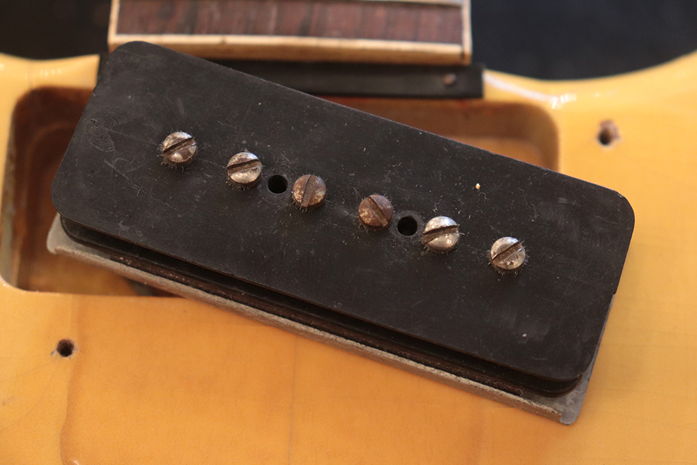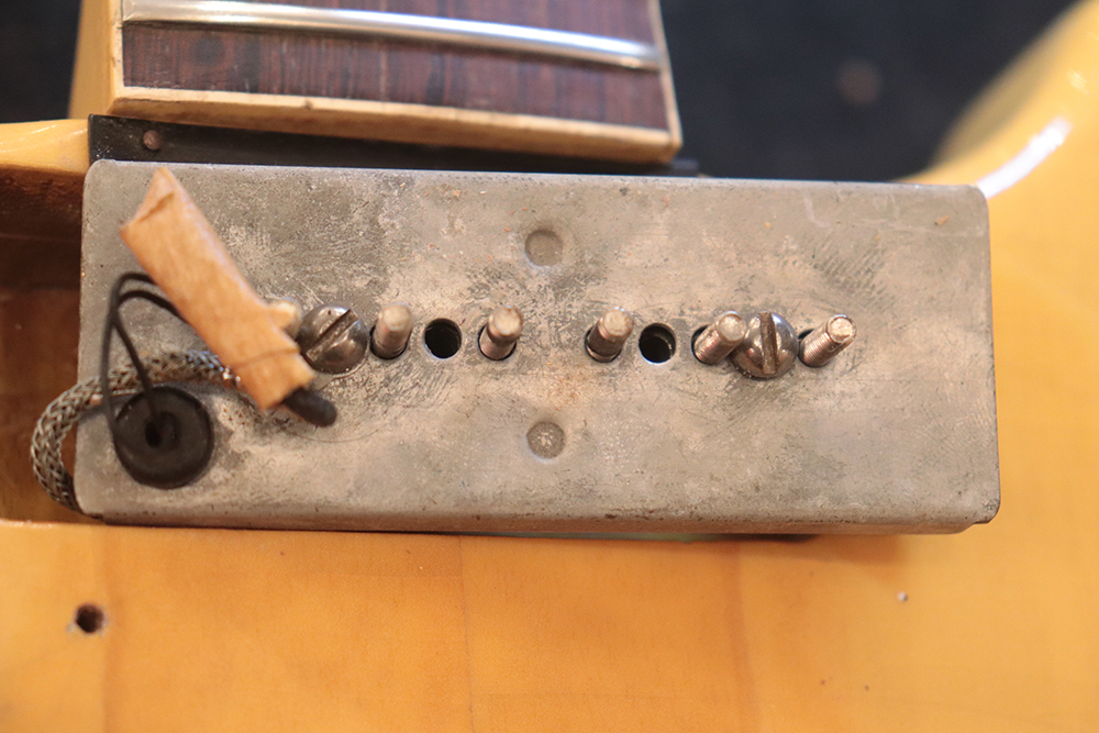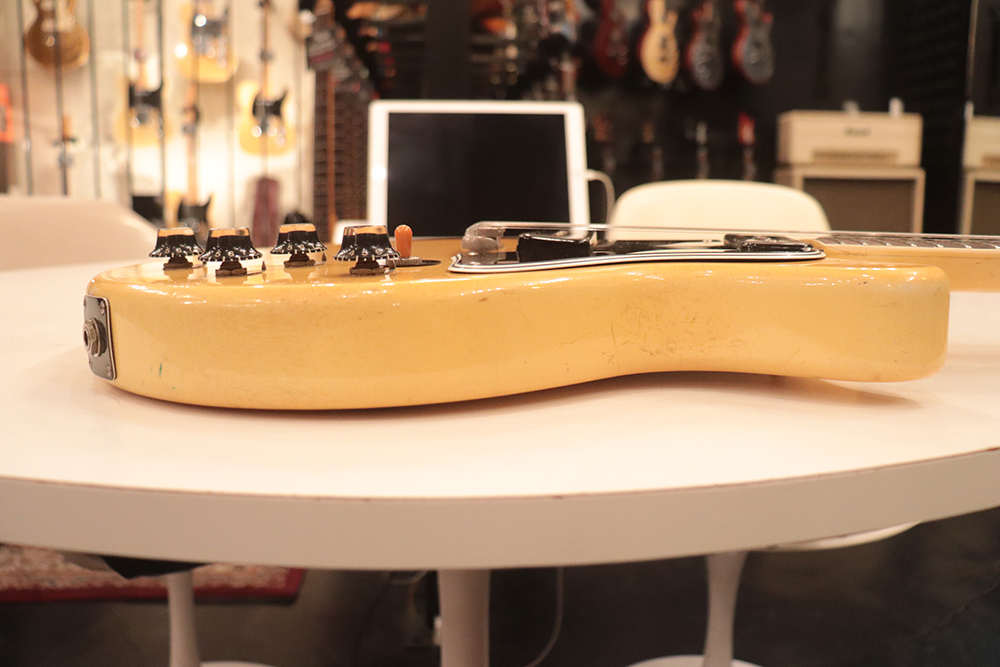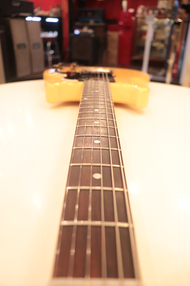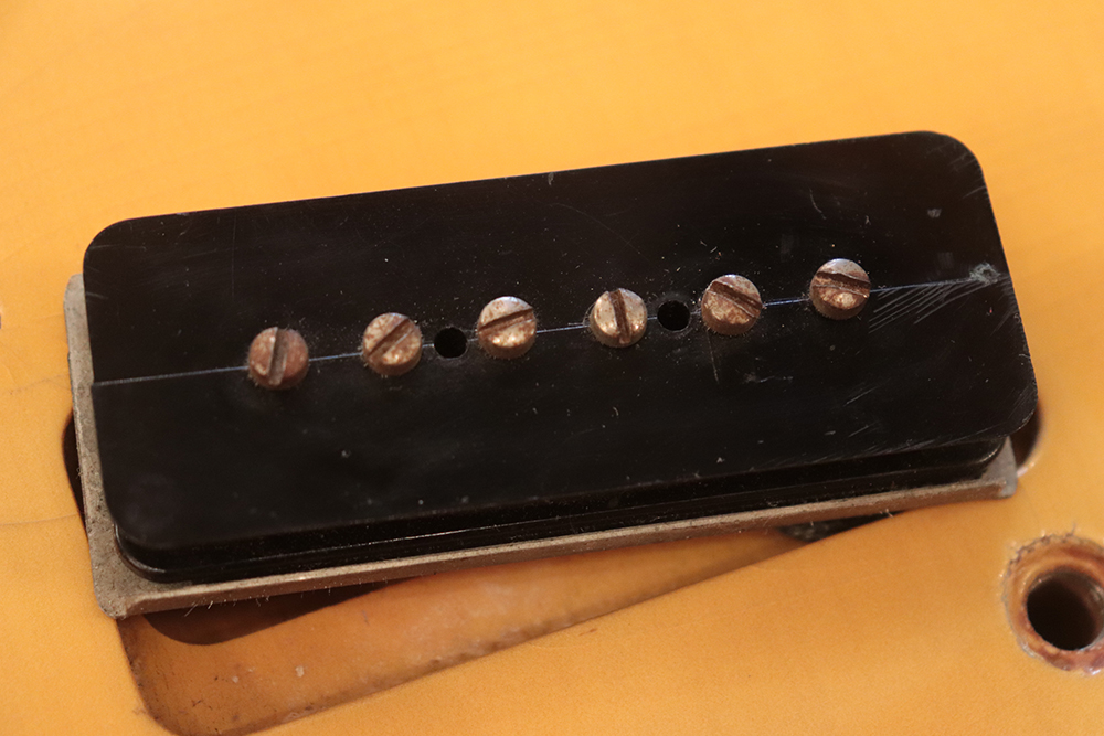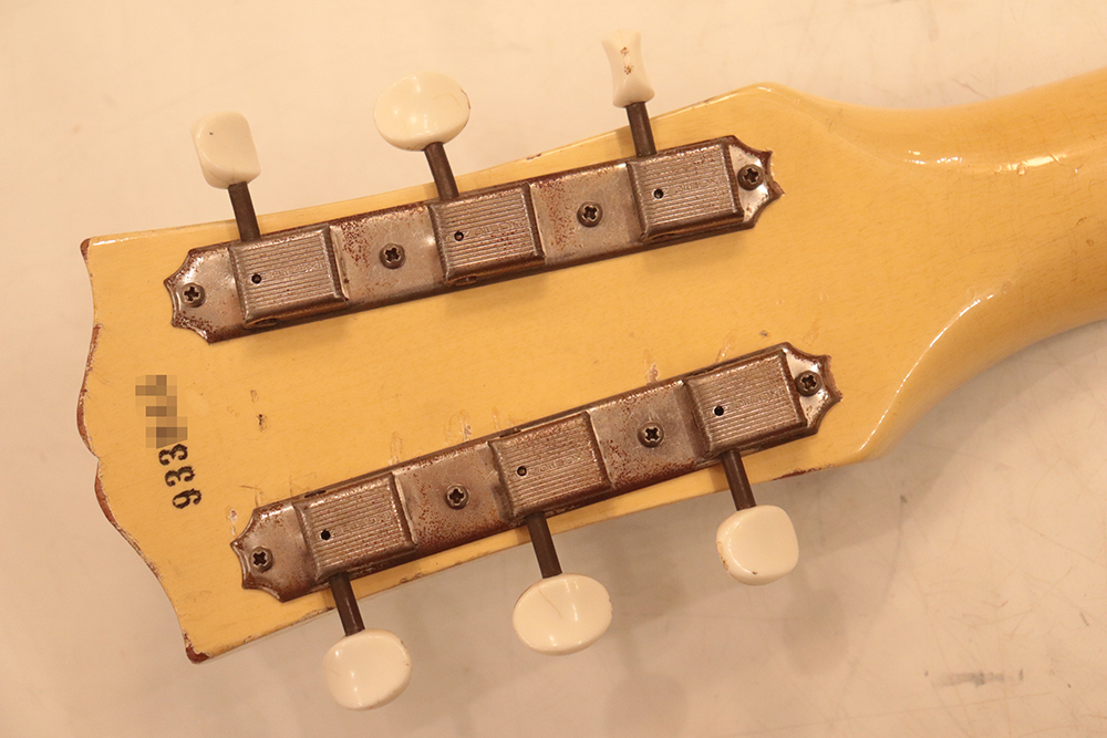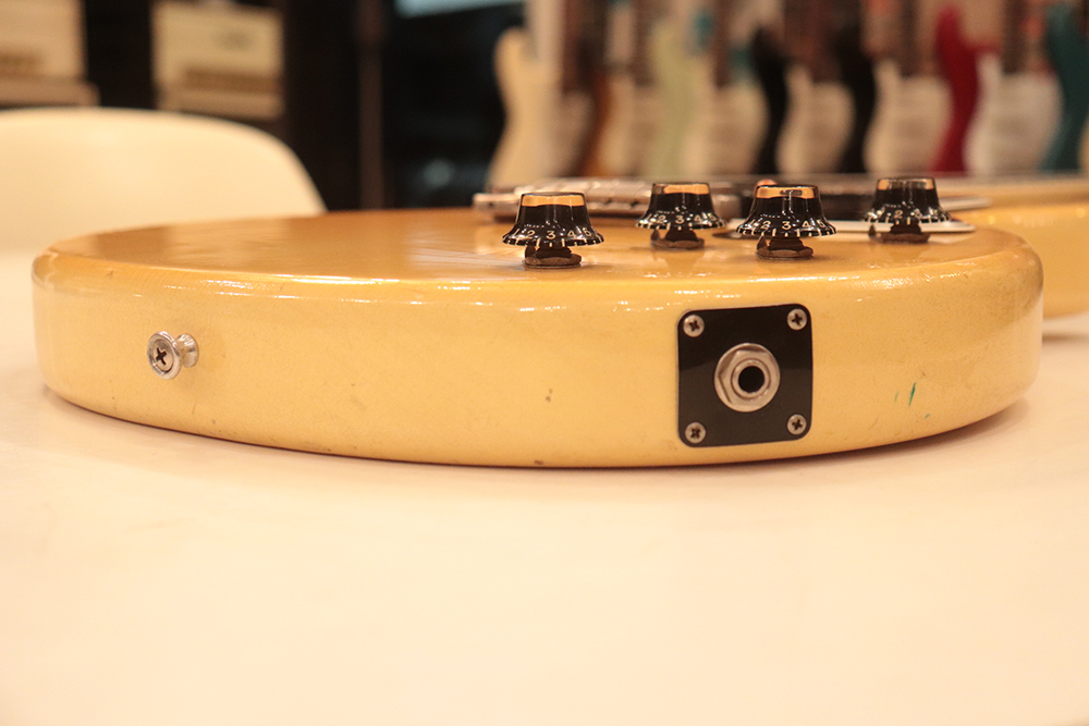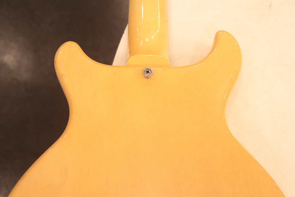 60年頃には、フロント・ピックアップの位置が下げられる仕様となりますが、マイナーチェンジ前のピックアップ・レイアウト仕様では、倍音的にも良い位置に配置されたフロント・ピックアップのトーンと、この時期ならではなファットながら握り易い独特なネック・グリップで人気の高い59年製です