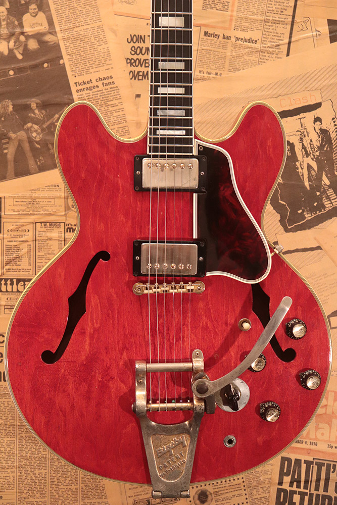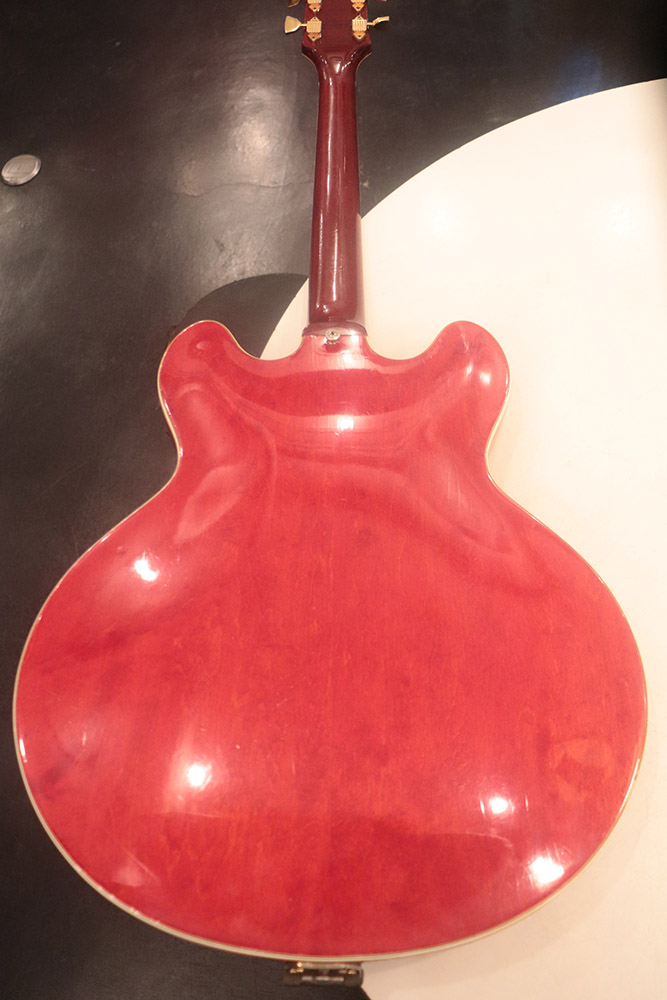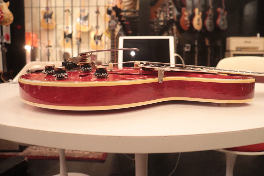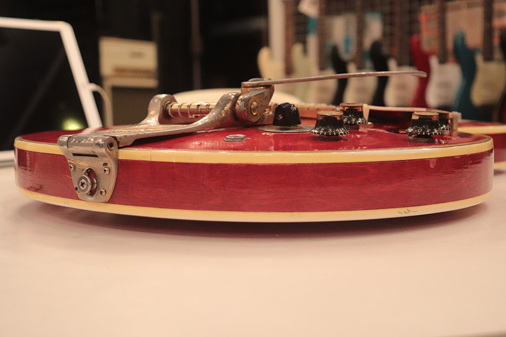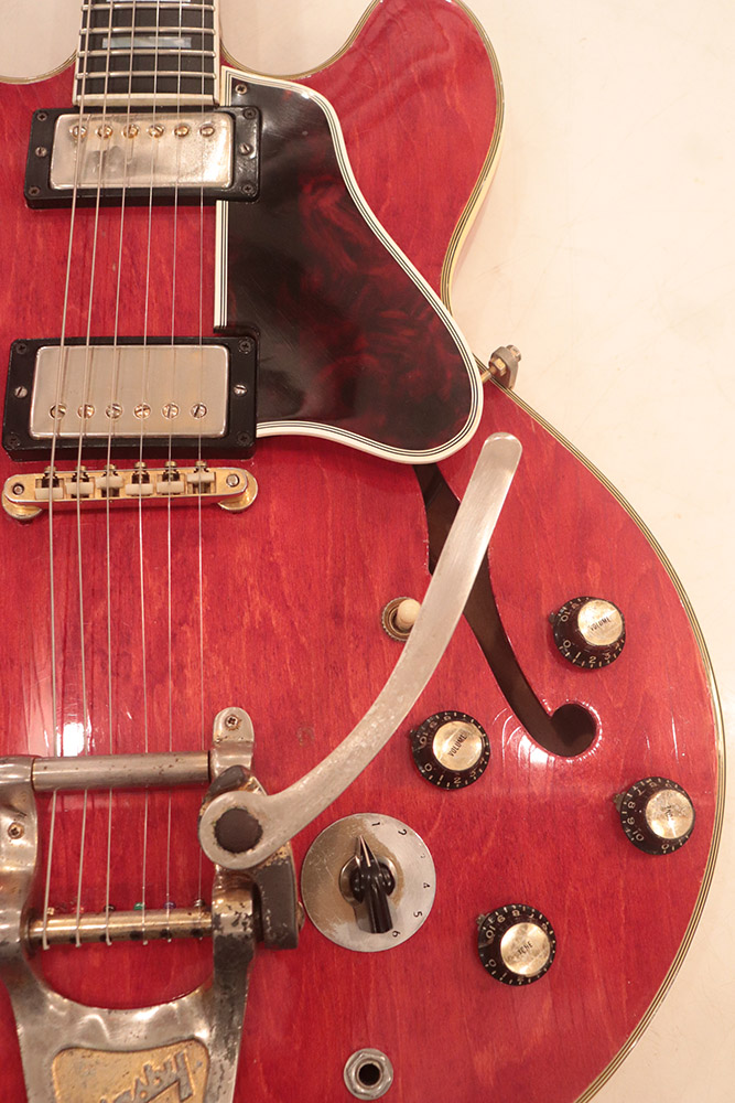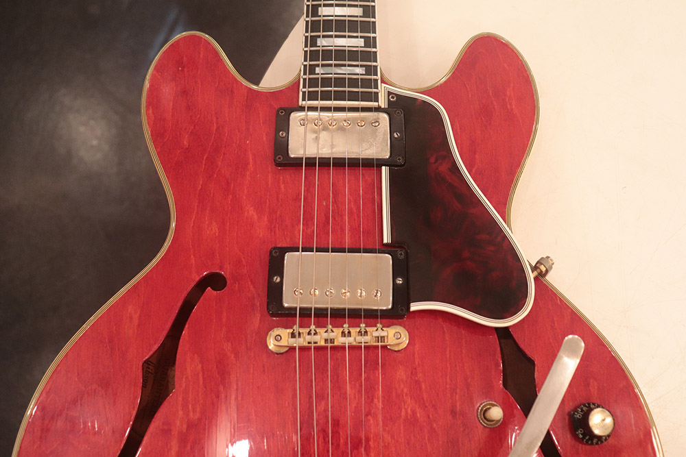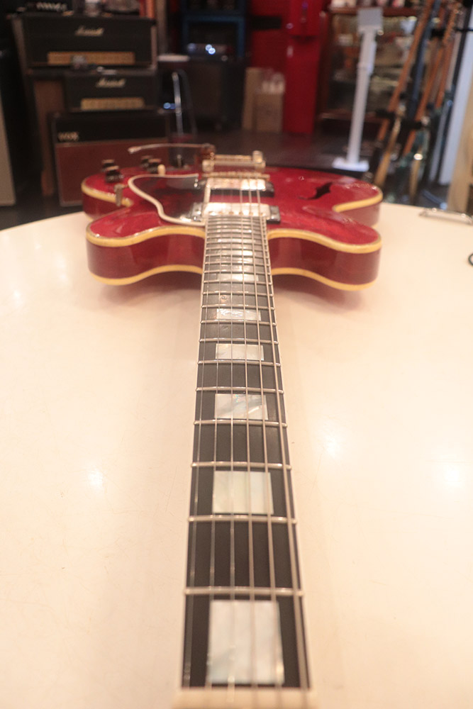 前年、62年迄よりも太めのネック形状を持ち、立ち上がりの早いエボニー指板と初期ナンバード・ピックアップのマッチングは、”Rock“を感じるルックスとサウンドを持った“ES-355”です