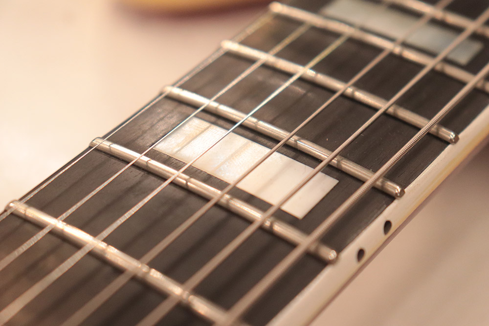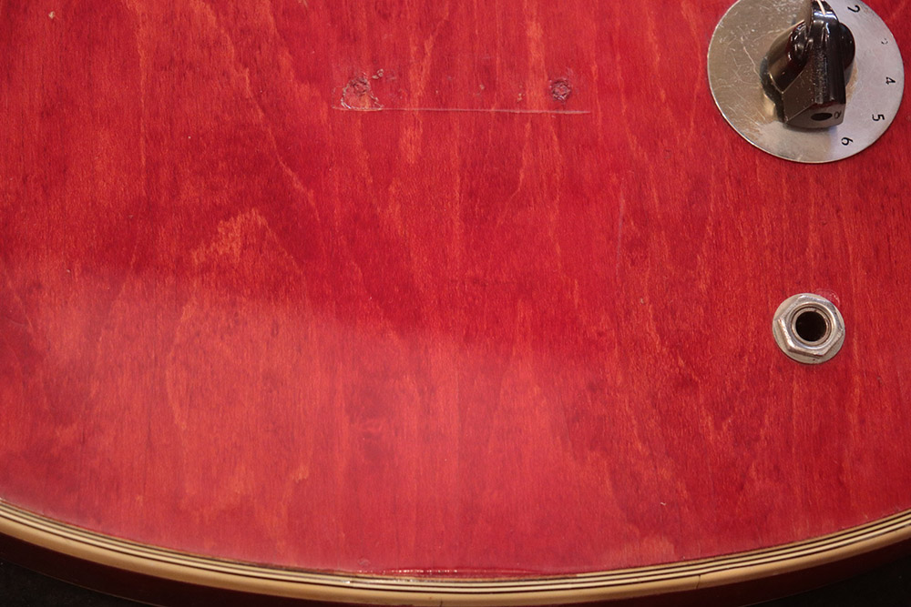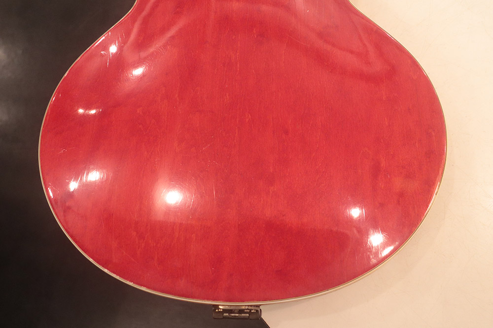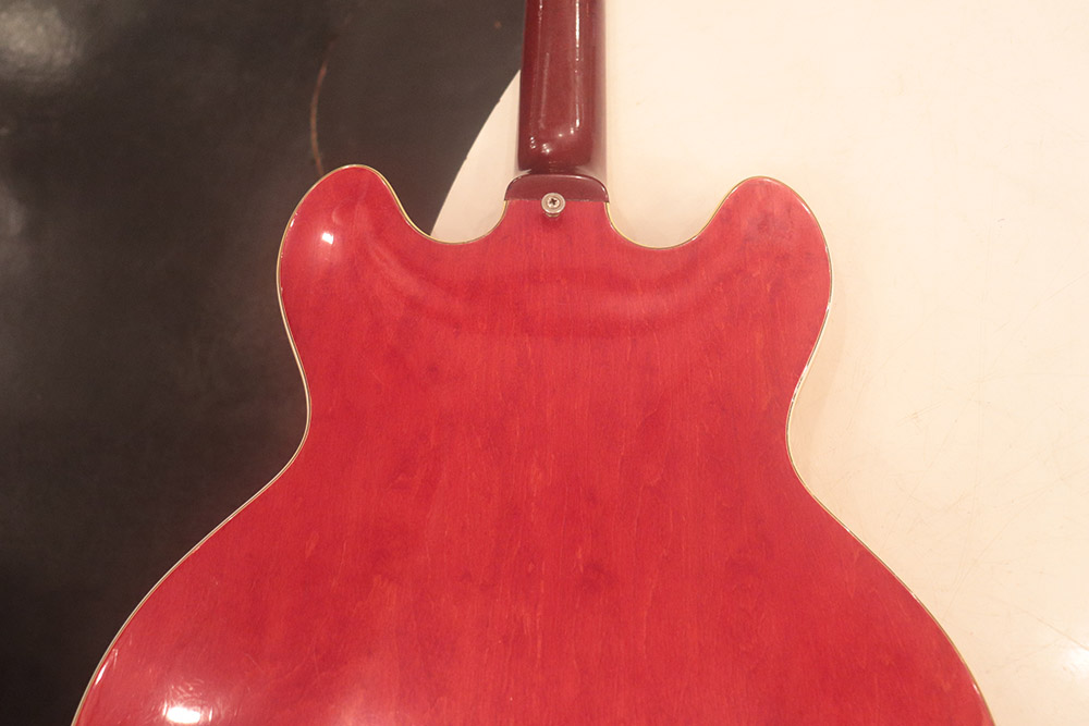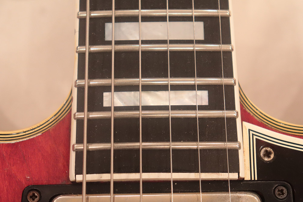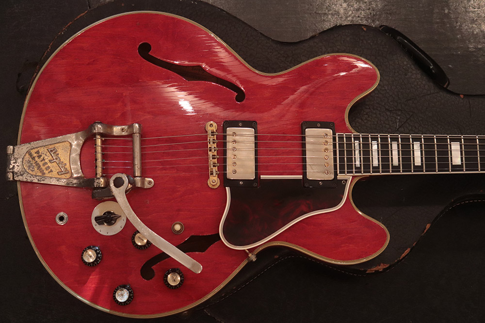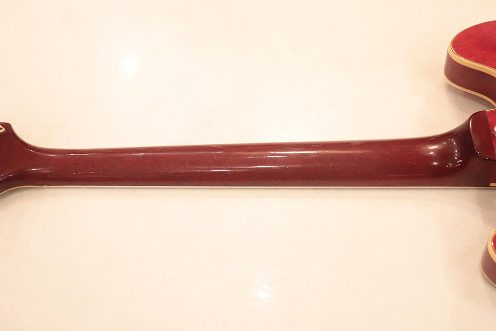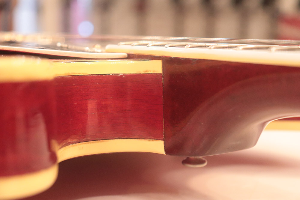 前年、62年迄よりも太めのネック形状を持ち、立ち上がりの早いエボニー指板と初期ナンバード・ピックアップのマッチングは、”Rock“を感じるルックスとサウンドを持った“ES-355”です