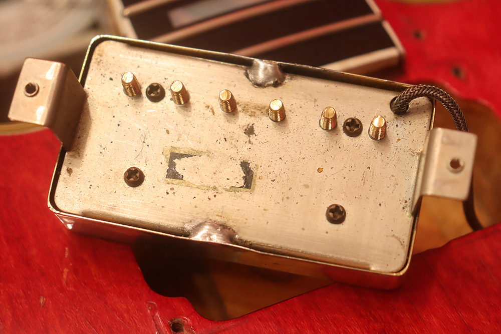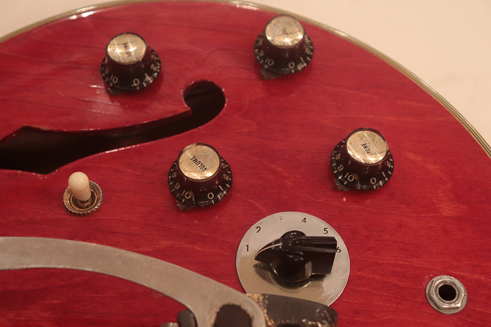 アッセンブリーは、ヴァリトーン回路を外しておりステレオ・アウトプットはモノラルに変更され、“ES-335”と同じワイヤリングに変更していますが、オリジナル・ユニットもケースに付属しています