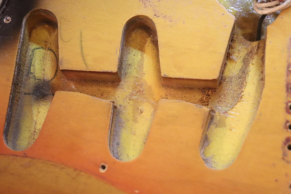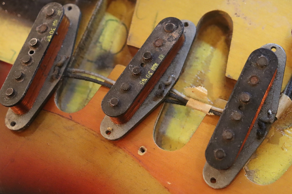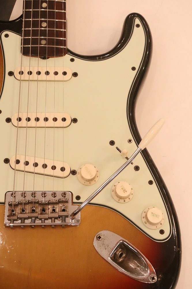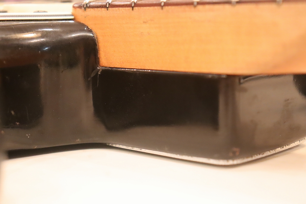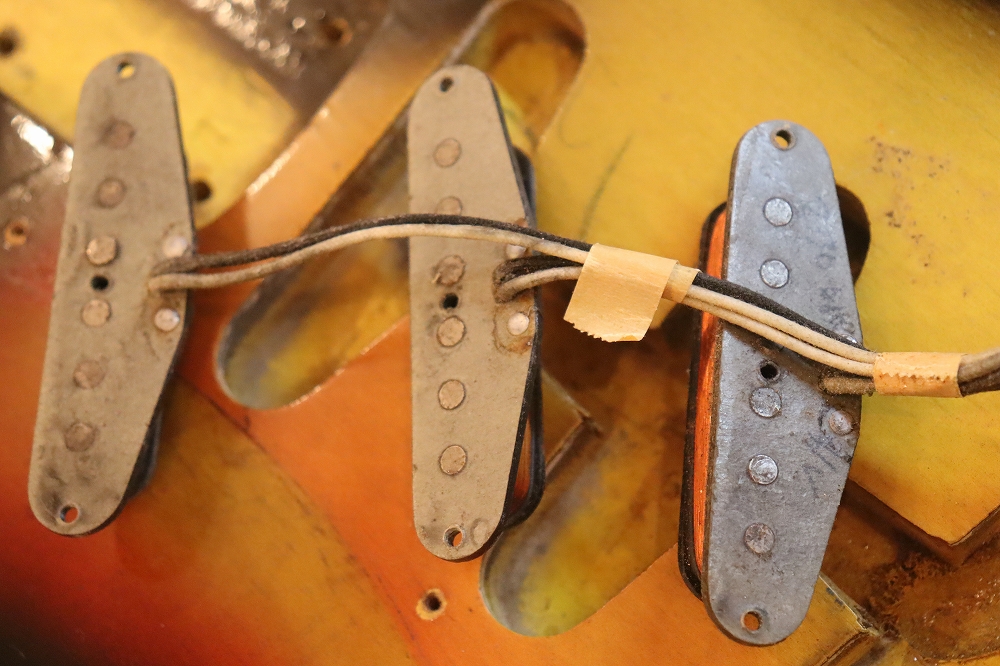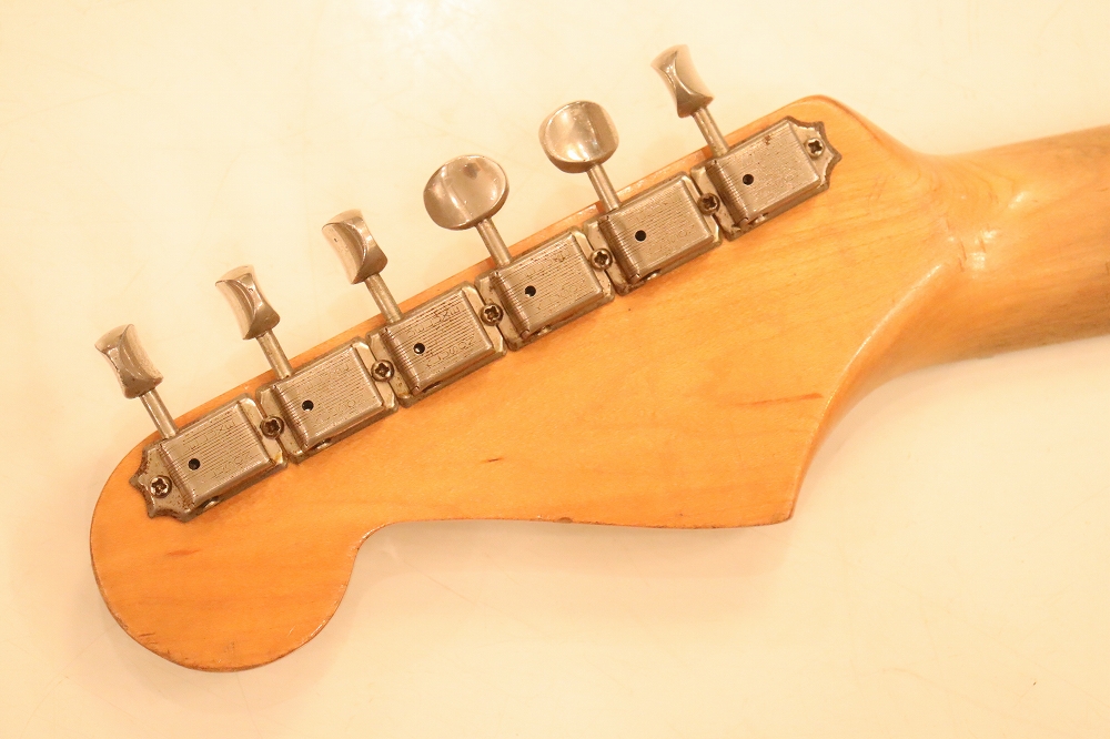 外観は、ボディバック、トレモロキャビティ下側に些少の木部補修跡がございますが、フェイドし易いスリー・トーン・サンバーストの赤い部分も残っており、年式也のウエアやウエザーチェックも些少見られますが、全体的にはヴィンテージ・ギアとして良い状態をキープしたエクセレント・コンディション!