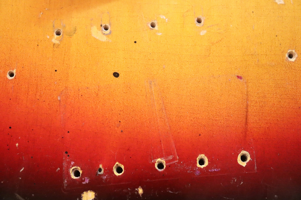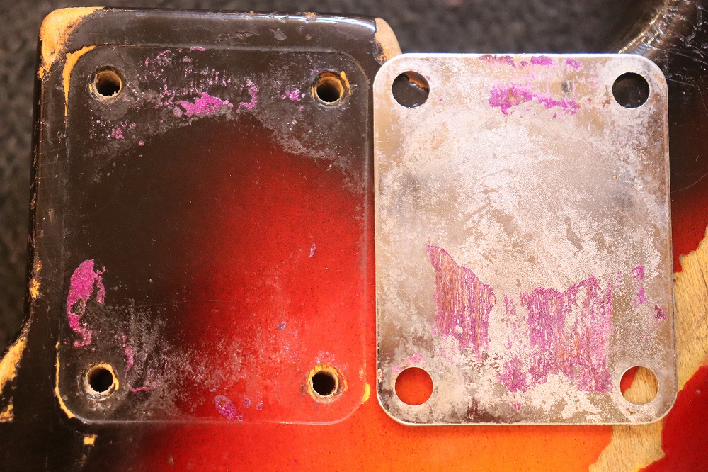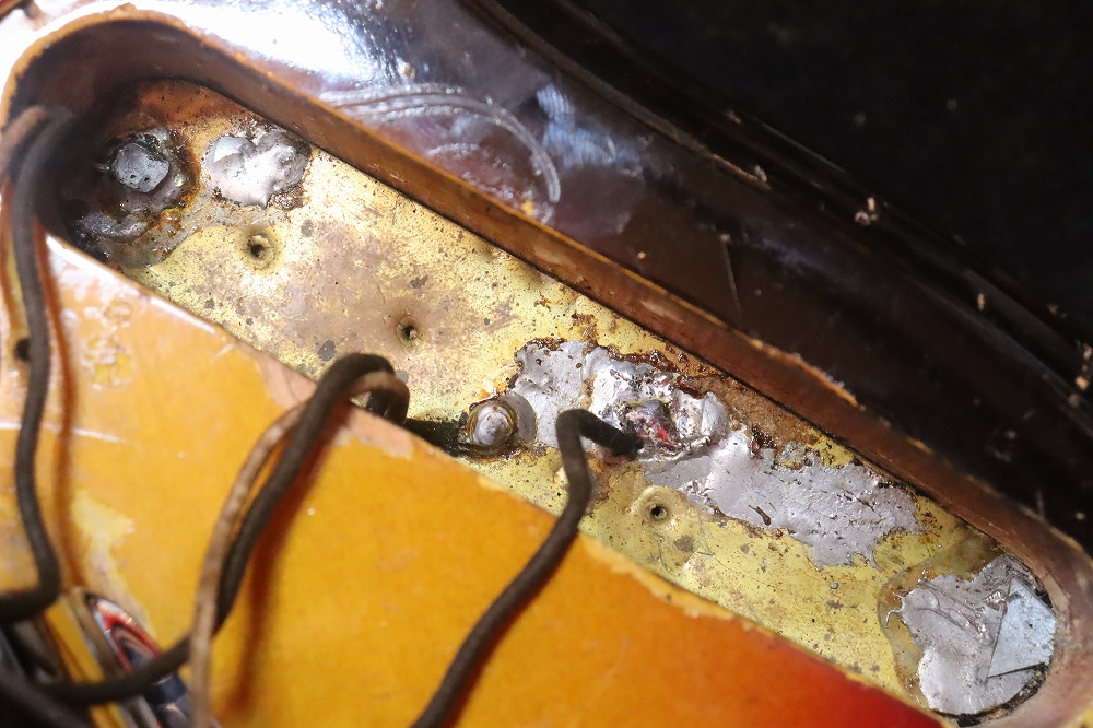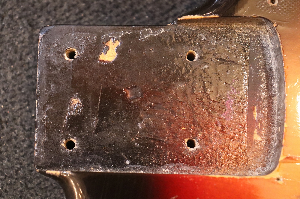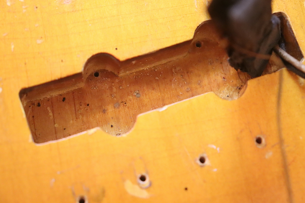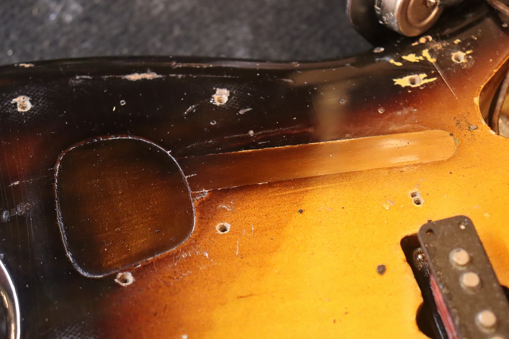 また、一度アクティブ仕様にした形跡が見られ、ピックガード下にバッテリーを装着する為に座グリが入れらていましたが、現在はアルダー材にて埋め戻され、塗装のタッチアップが施されています