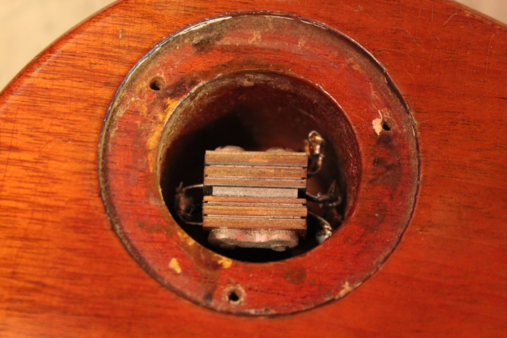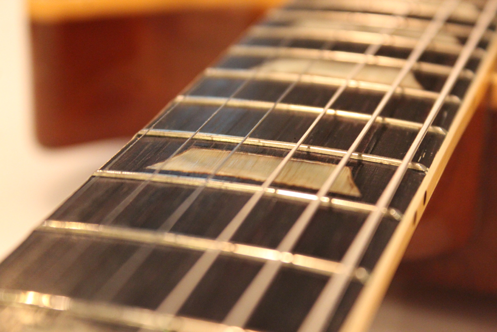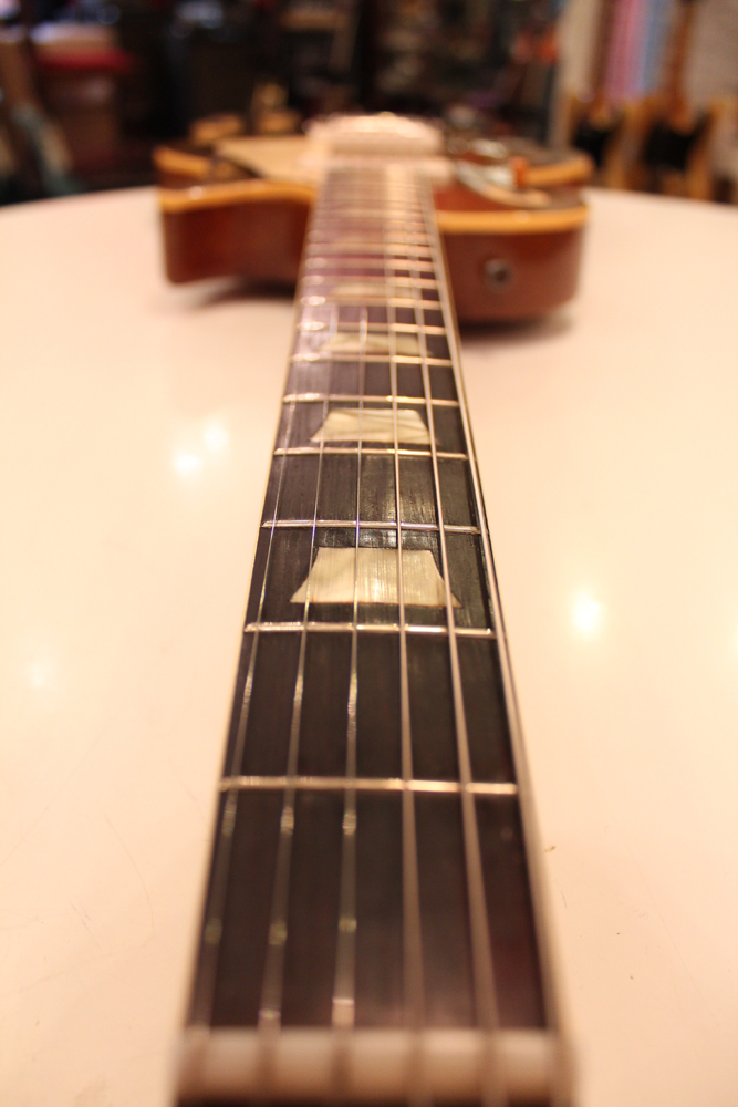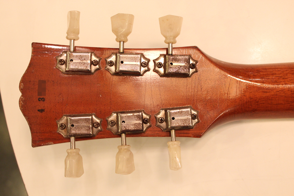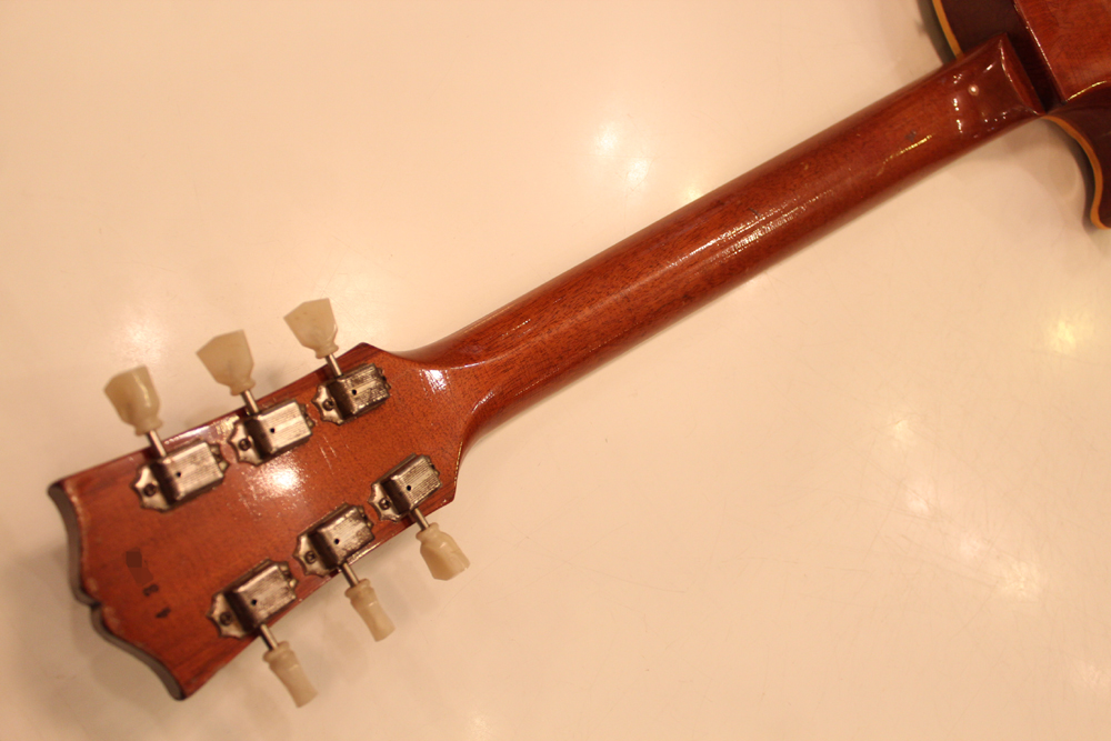 今回入庫は、54年の中にほんの少しだけ存在する、通常より上側に配された"Gibson"ヘッドロゴを持った個体で、