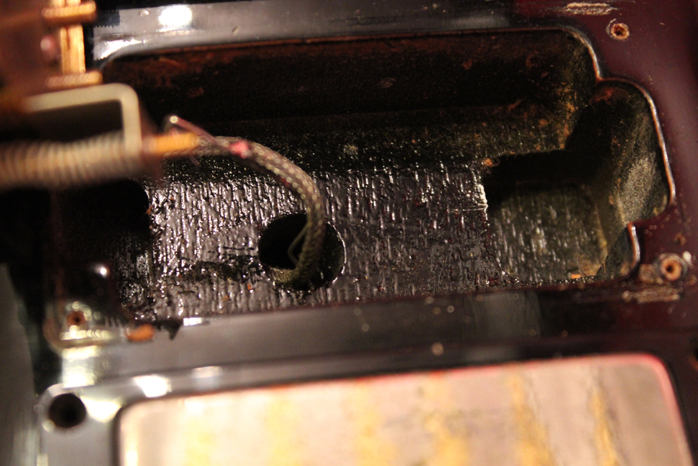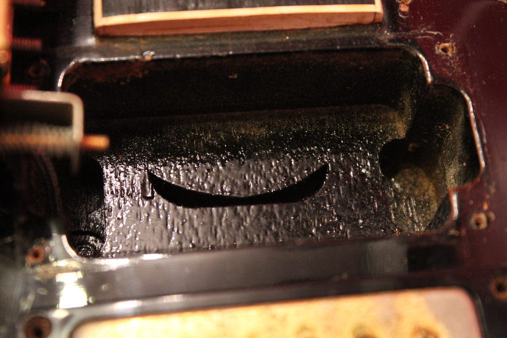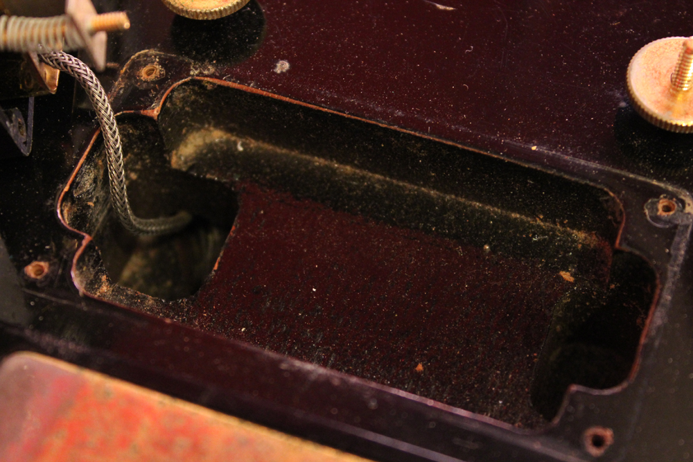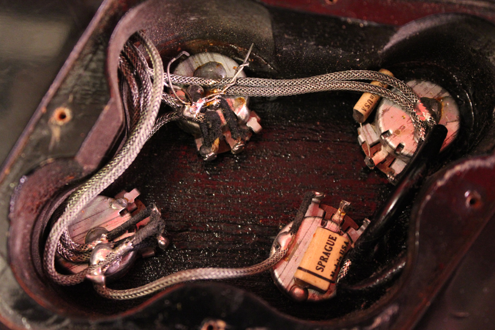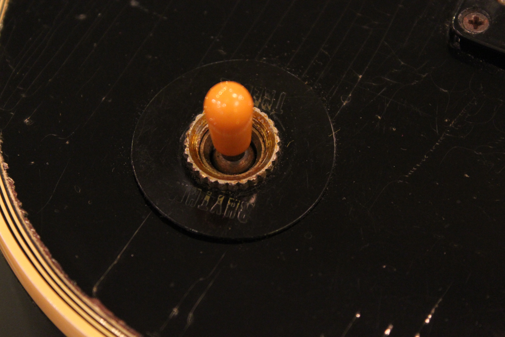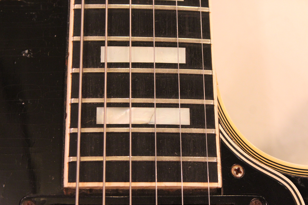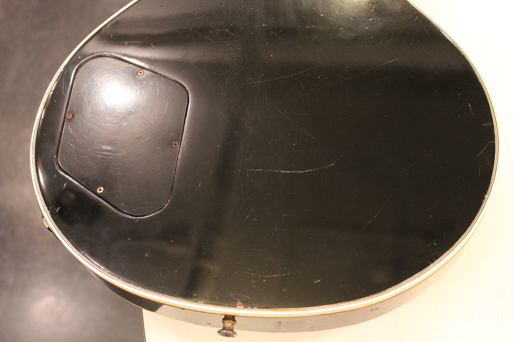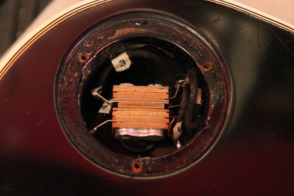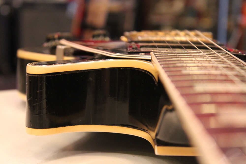 こちらは、そのカスタム最初のマイナーチェンジとして57年に登場した、"Patent Applied For" のデカールが貼られたハムバッキング・ピックアップを3基搭載されたセカンド・バージョンで、グローバー 102G ペグが標準搭載された