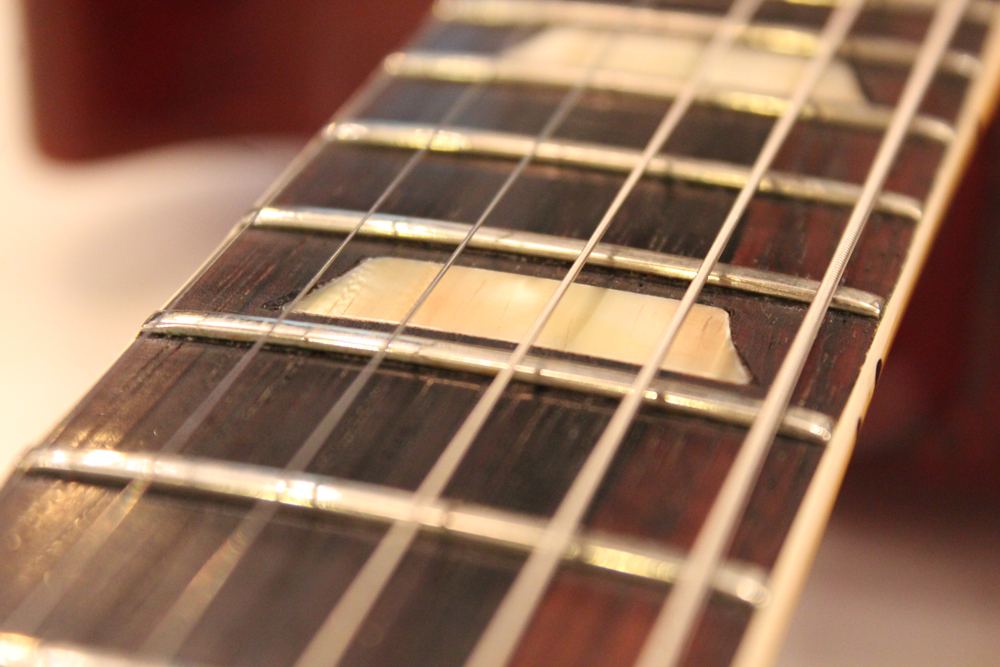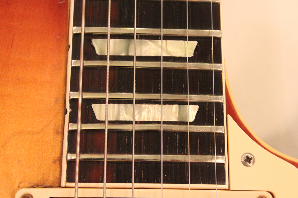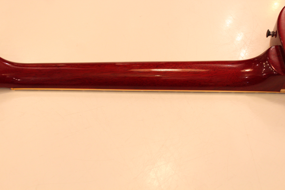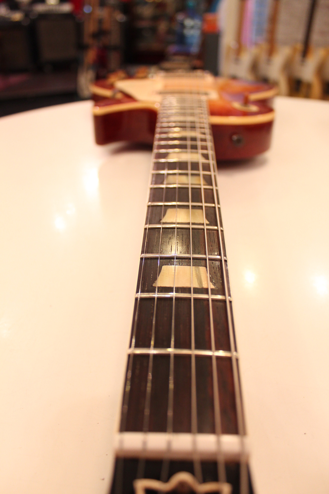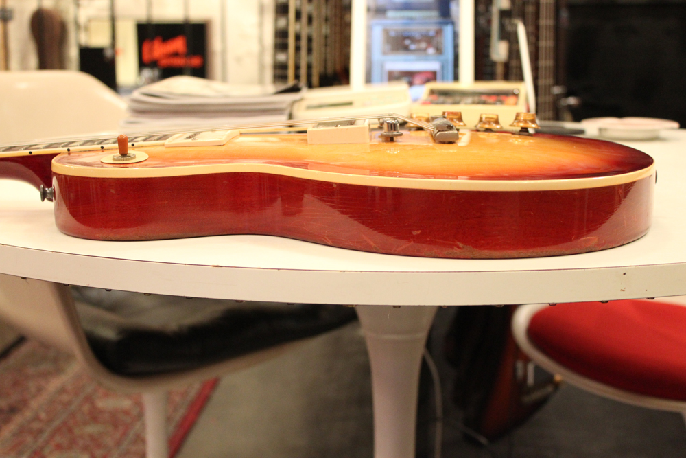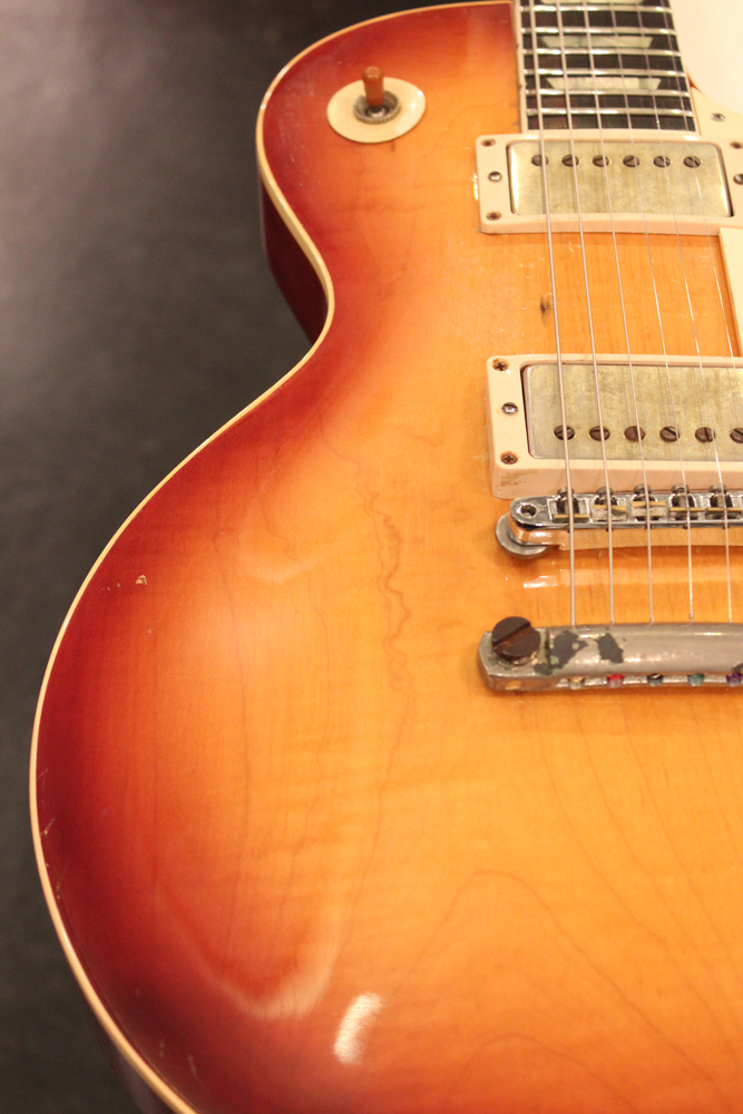 フィニッシュも59年バーストスタイルのチェーリーがフェイドした、ティーバースト系のカラーにリフィニッシュが施され、ボディバックも同様に、フェイデングが進んだチェリーカラーにフィニッシュされています