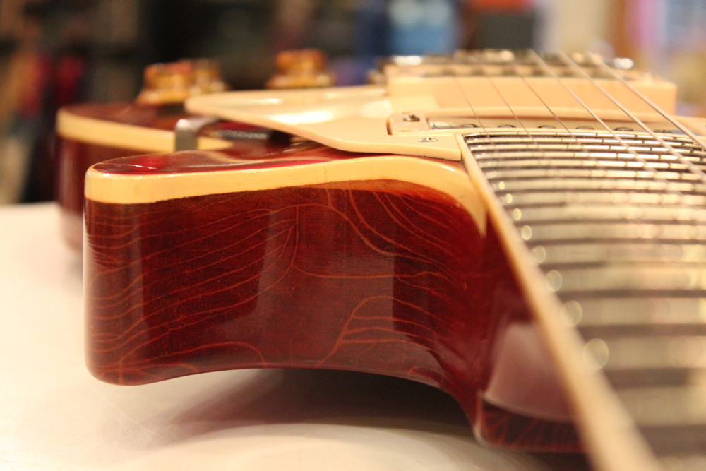 すでにかなりの時間経過していますので、オリジナル・フィニッシュと同様なウエザーチェックや経年変化が進んでおりますまたボディトップはセンター・オフの2ピース・メイプルですが、画像ではわかり難いですが、どちらもリアルなフィギュアード・メイプルが使用されています