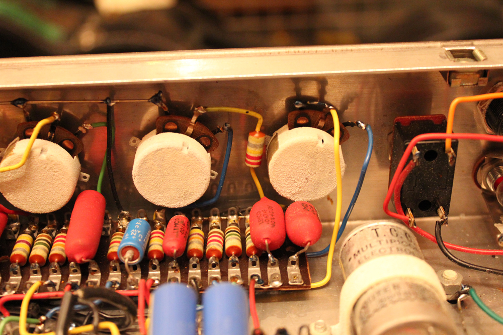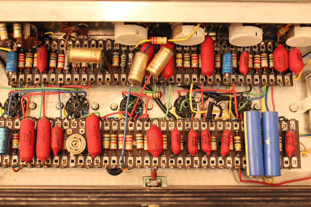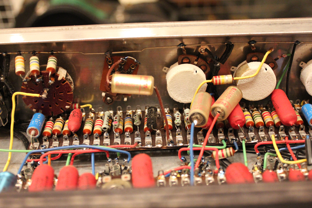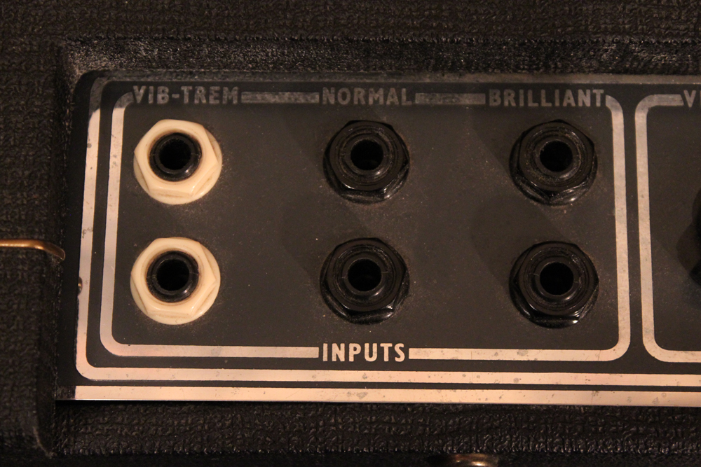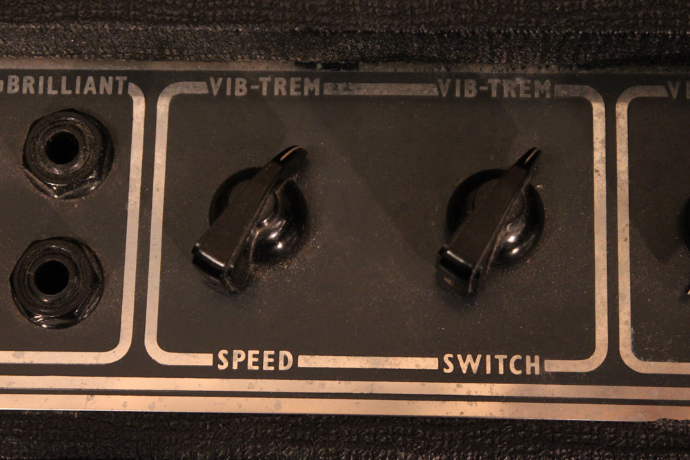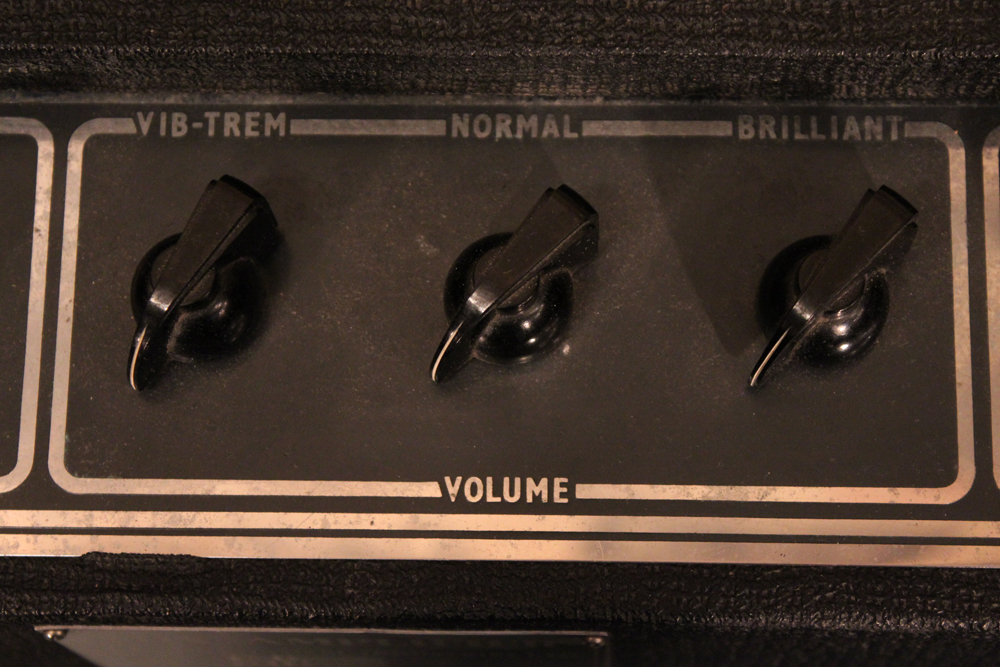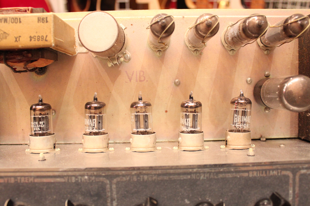 今回見つけて来た機体は、グレー・プレキシ・パネル & ブラック・ダイアモンド・サラン・ネット仕様の66年製!しかも、非常に綺麗なコンディションをキープしており、オリジナルのトレモロ用フットスイッチとアンプカバー、