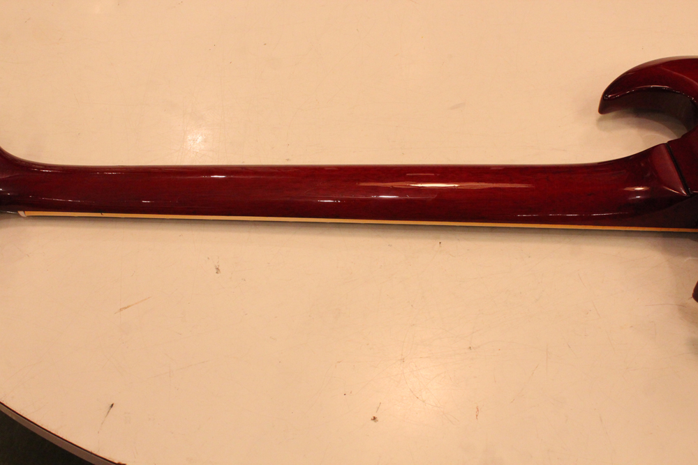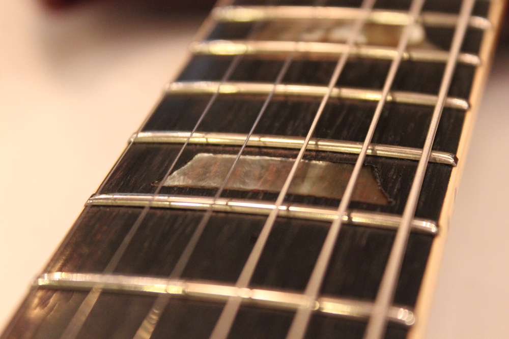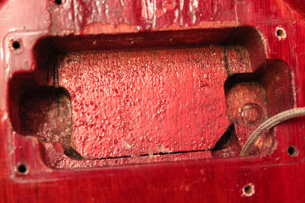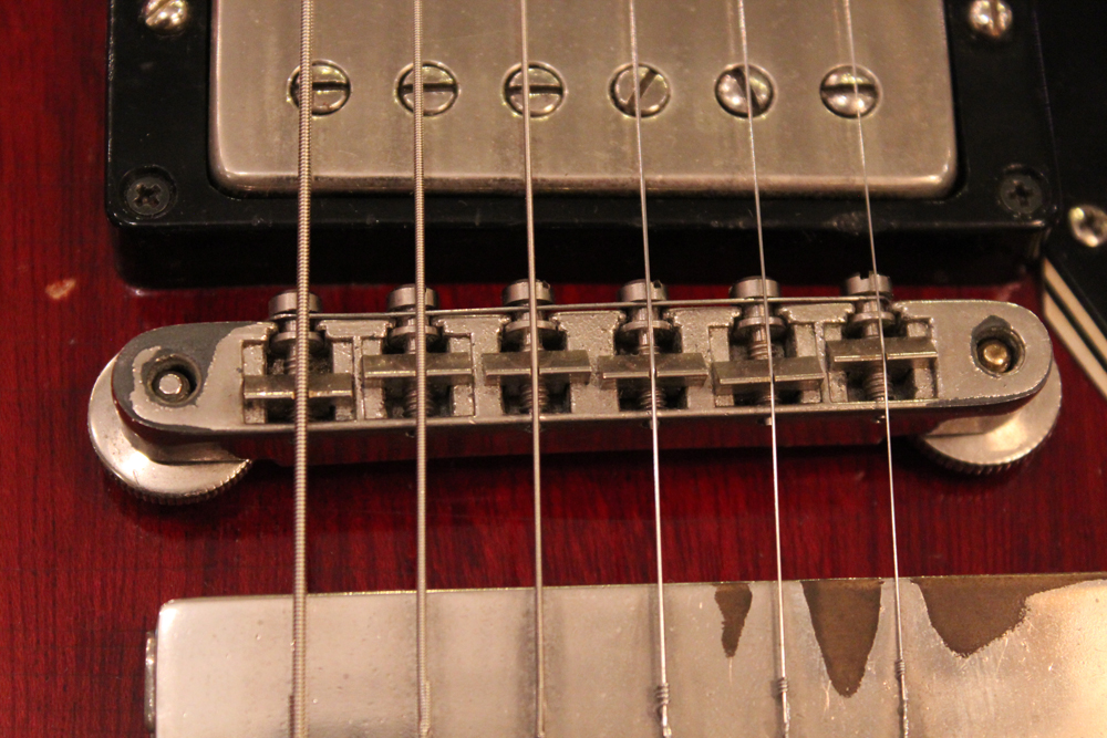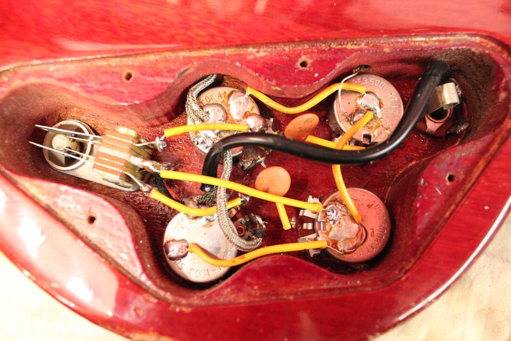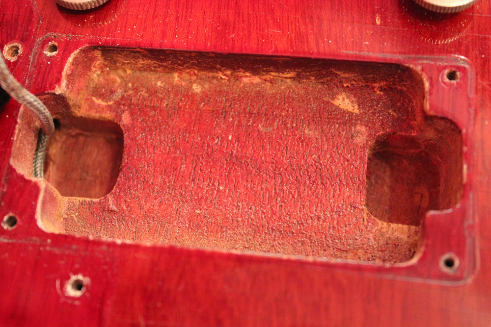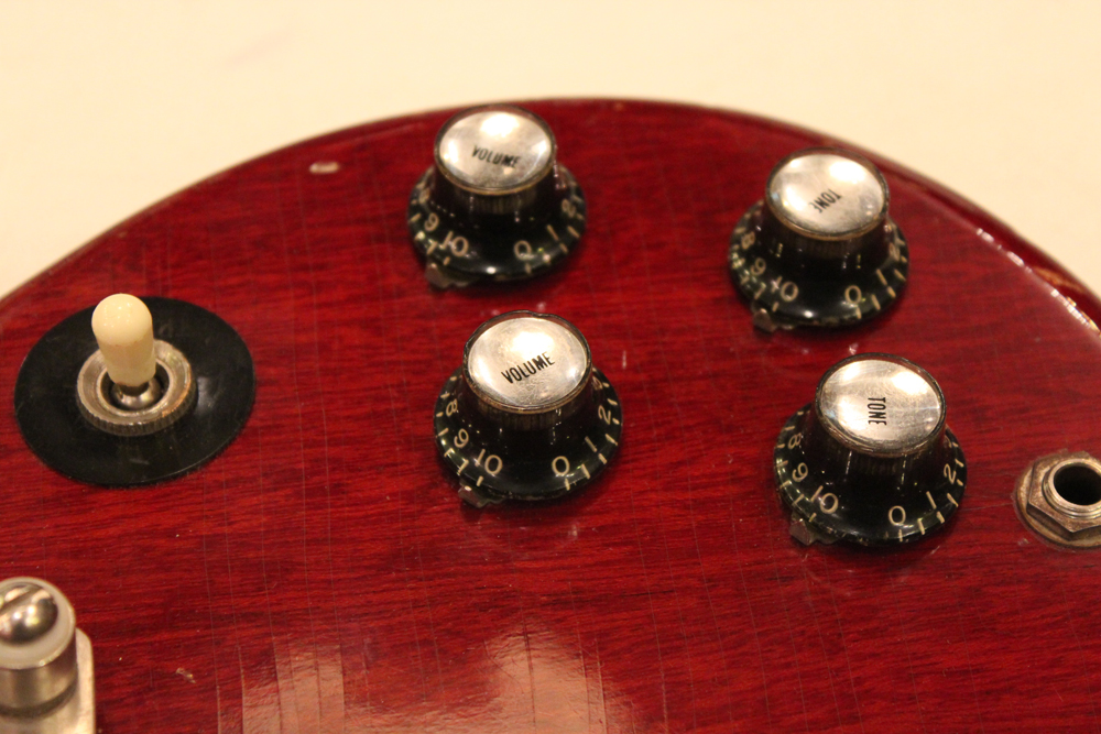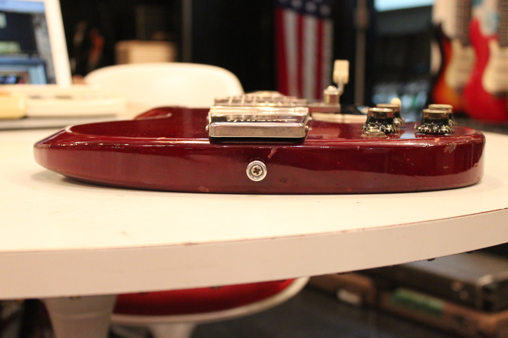濃茶な指板の42ミリ・ワイズ・ネック、オール・ニッケル・ハードウエア、初期・スクエアウインドウ・ナンバード・PAF・ピックアップ仕様で、フェイドしがちなチェリーレッド・カラーも色濃く残ったエクセレント・クリーン・コンディション!