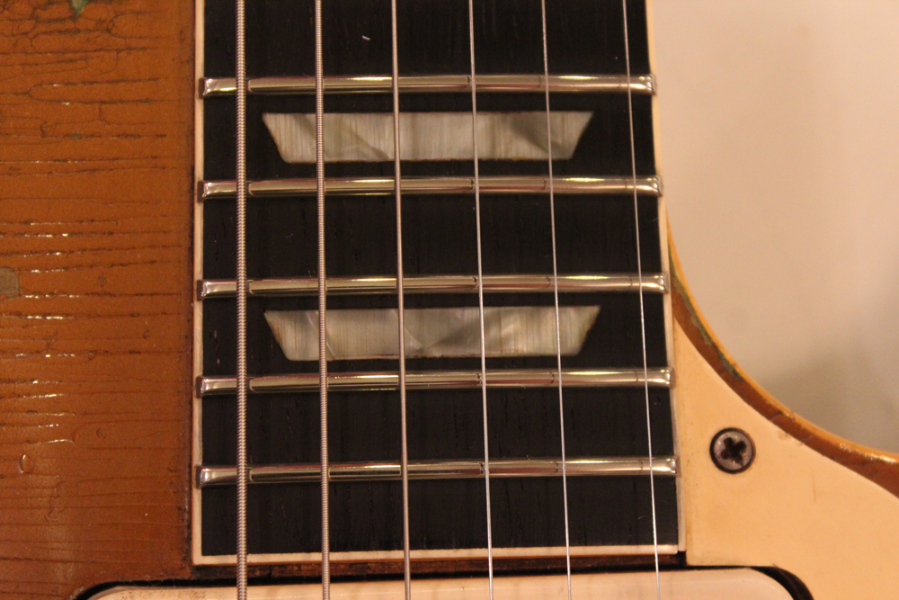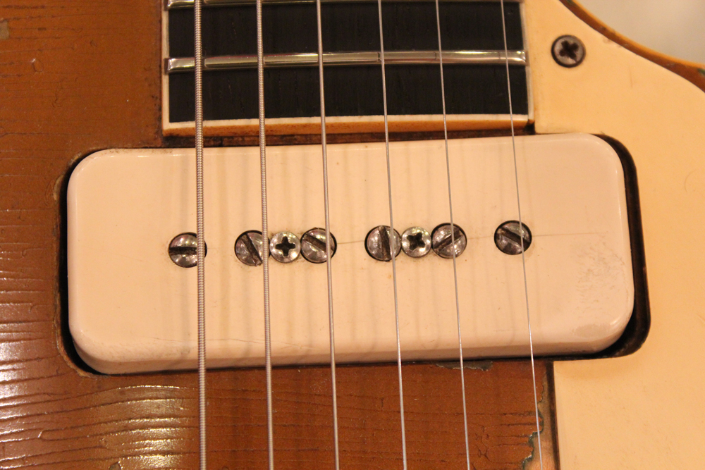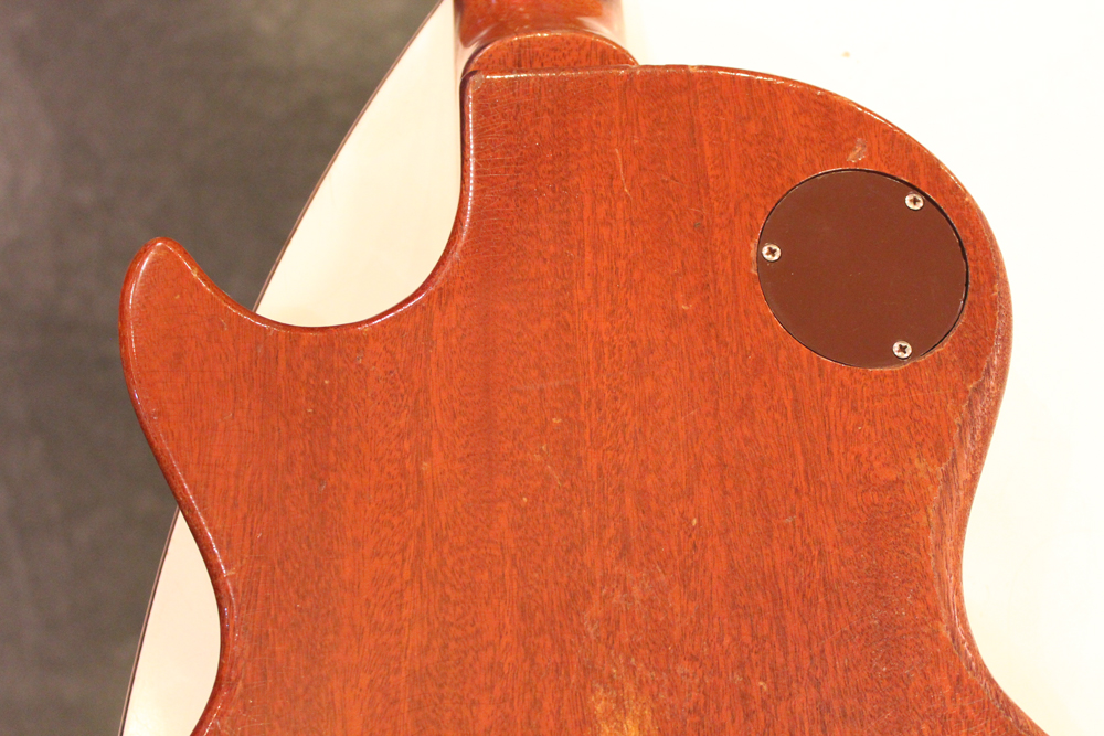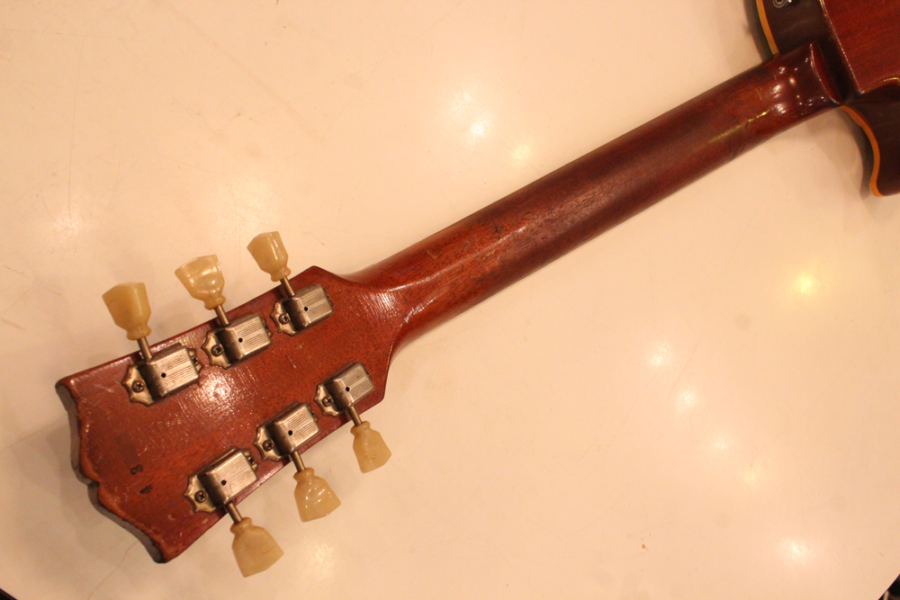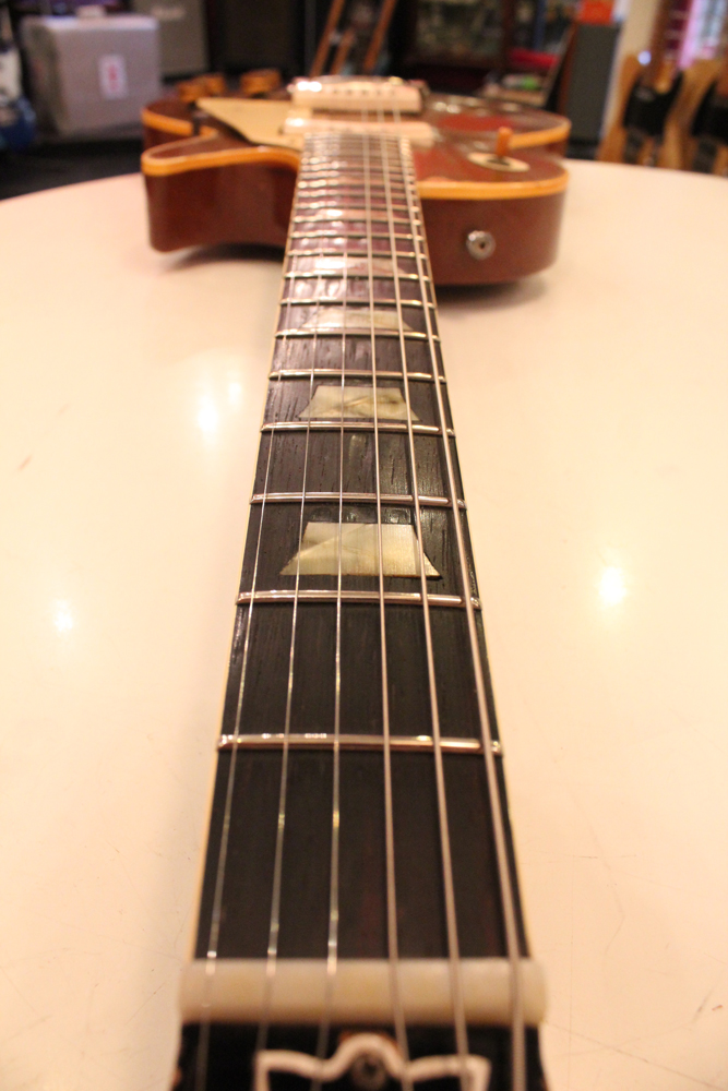 54年製のゴールド・トップは、ネックシェイプやネックセット角度等が、数種類ありますが、こちらは、一番人気の高い59年ぐらいのミディアム・グリップで、セット角も56年やバースト期と同様な約3度、そしてP-90ゴールド・トップの中では、このシリアルナンバー付近のみ存在する、"Gibson" のパールロゴがバースト期のようにヘッド上側に入れられた珍しい個体です