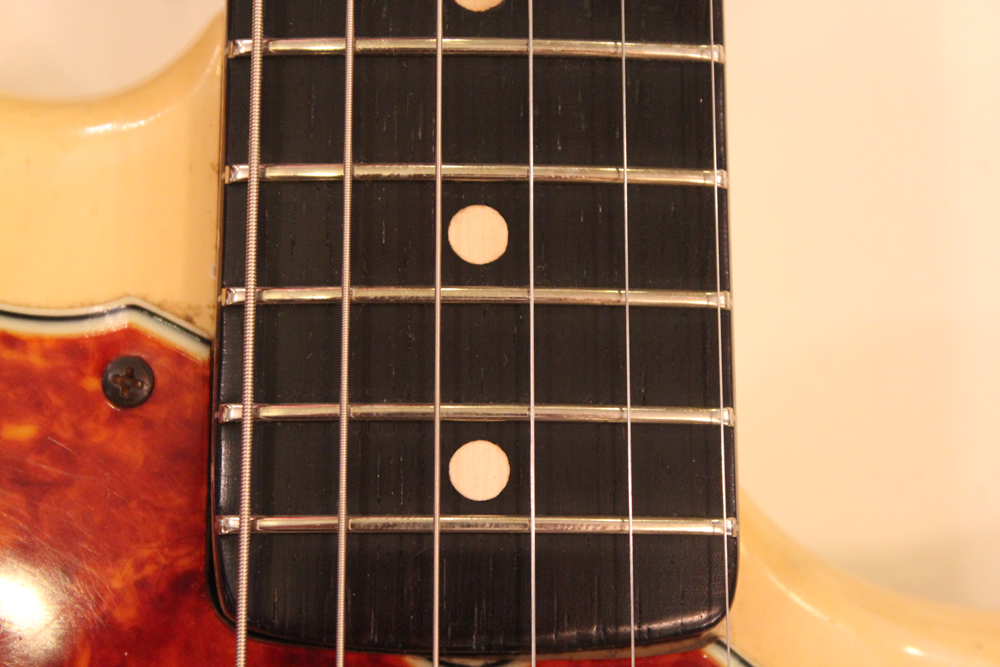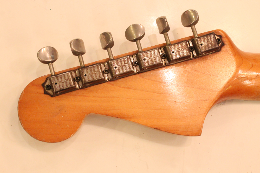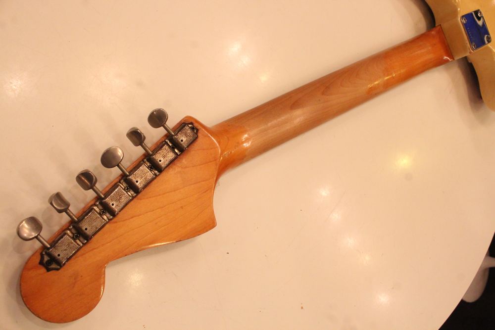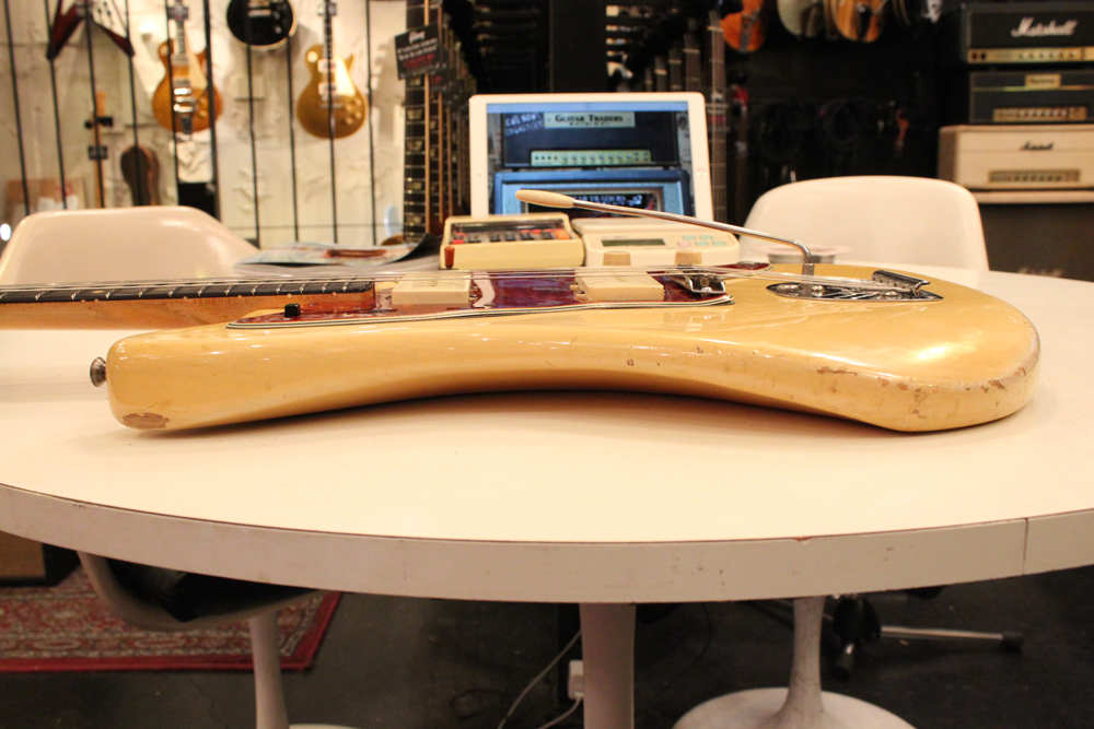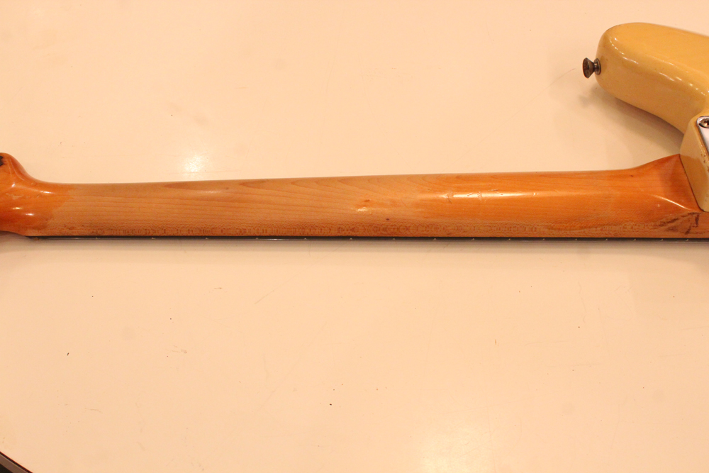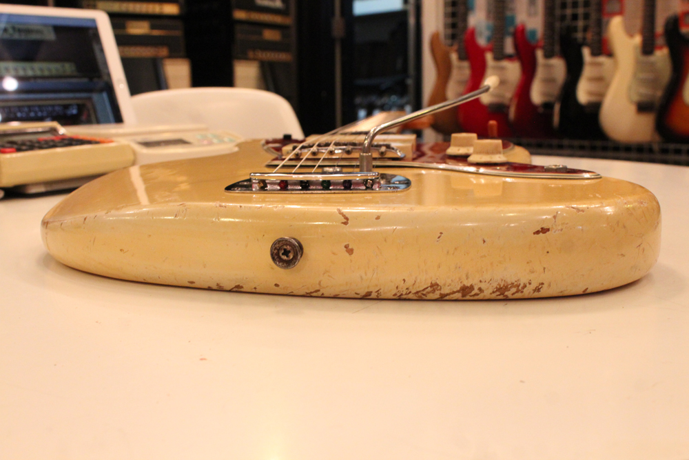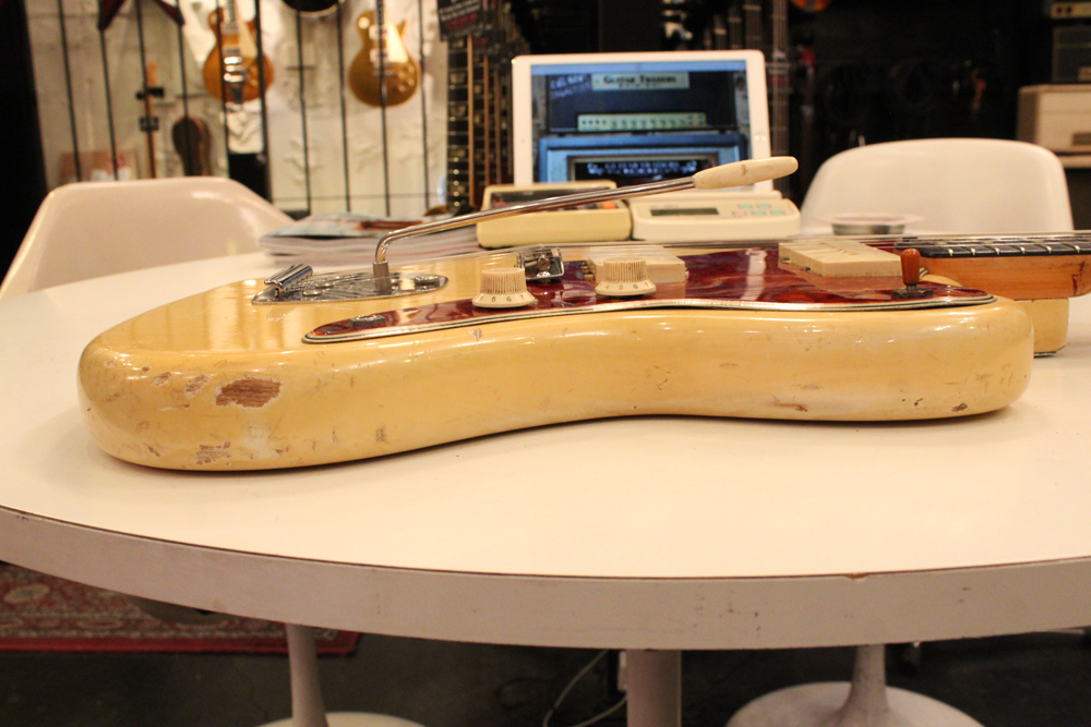 特にこの時期は、ボディトップとバックの中心部は薄く、サイドは重ね塗りを多くした、ブロンド・バースト・フィニッシュが特徴です今回見つけて来た機体は、フェンダー最初のローズウッド材を採用したスラブ・フィンガーボード・ネック仕様で、