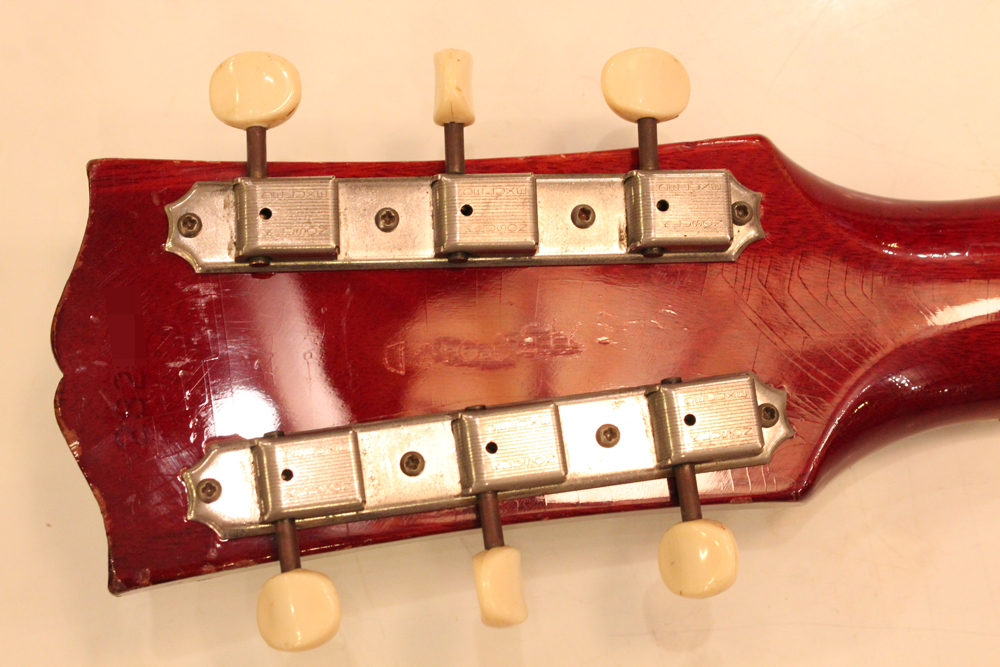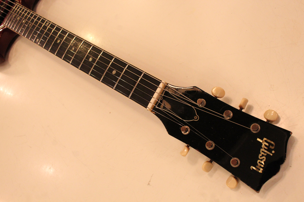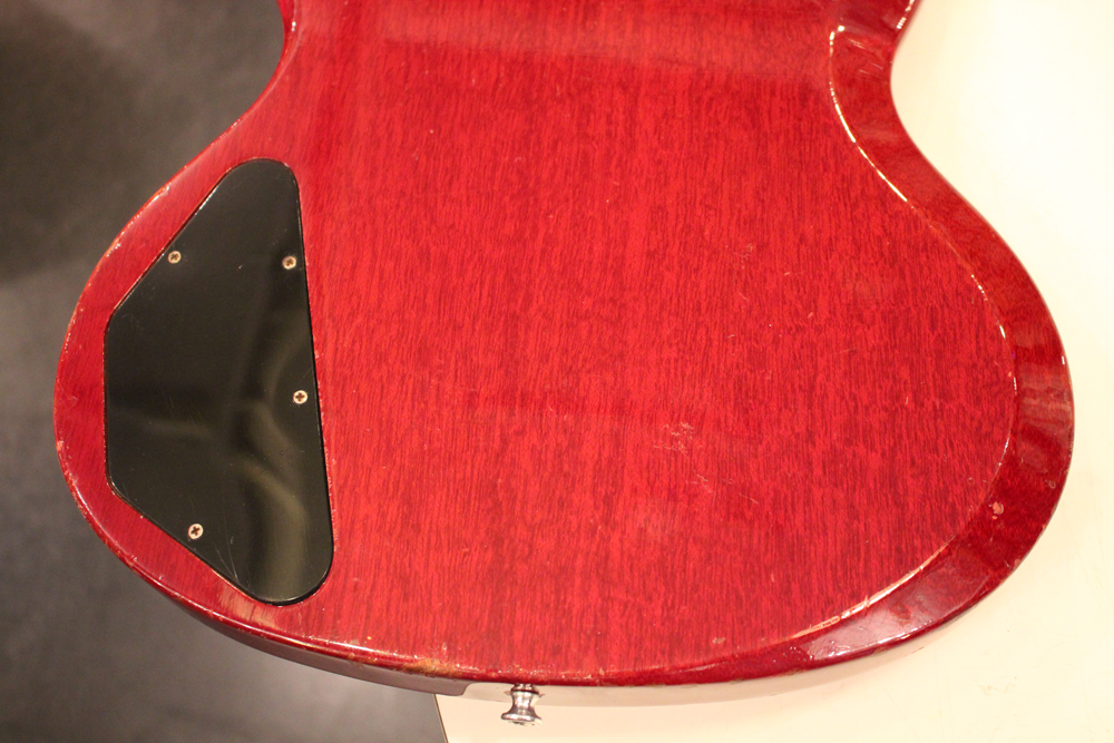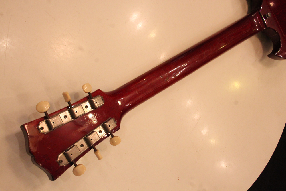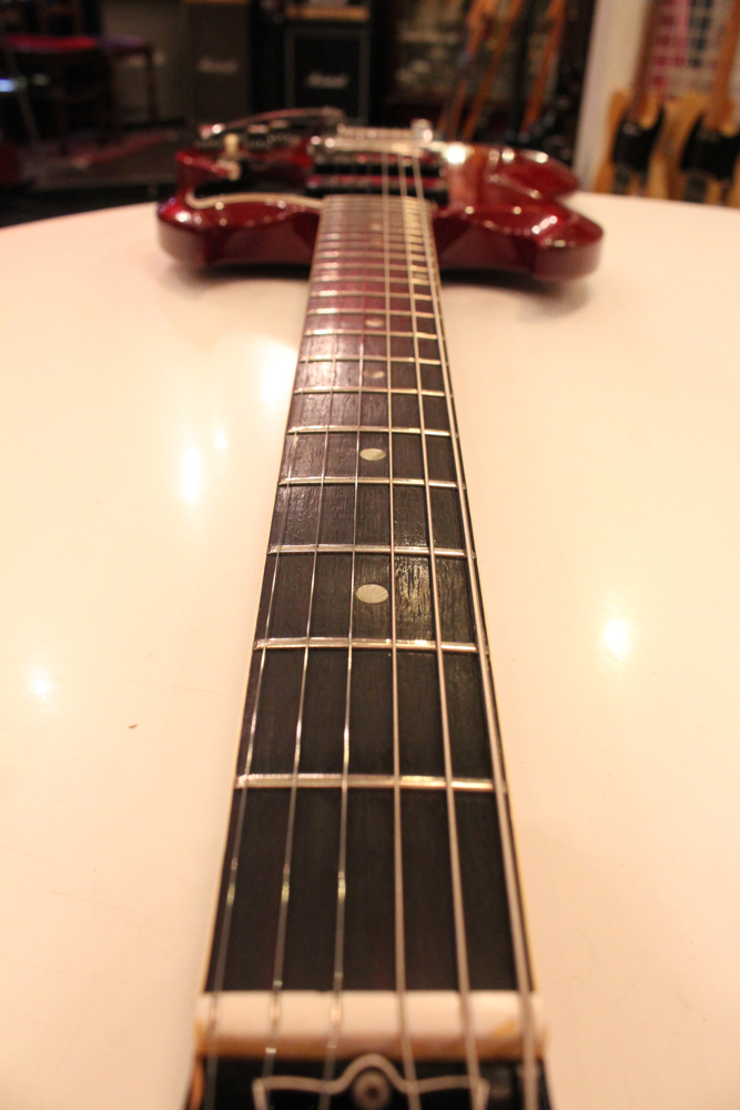 今回入庫は、SG発売の61年からの仕様を受け継ぐ65年の初期製で、42mm幅のワイドナット、濃茶なローズ指板のネック、そしてニッケル・ハードウエアと、64年迄の仕様を受け継いだ機体です