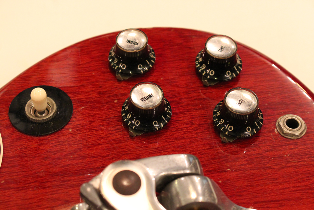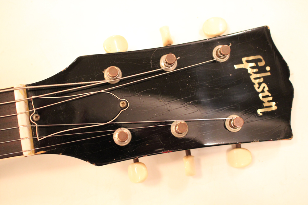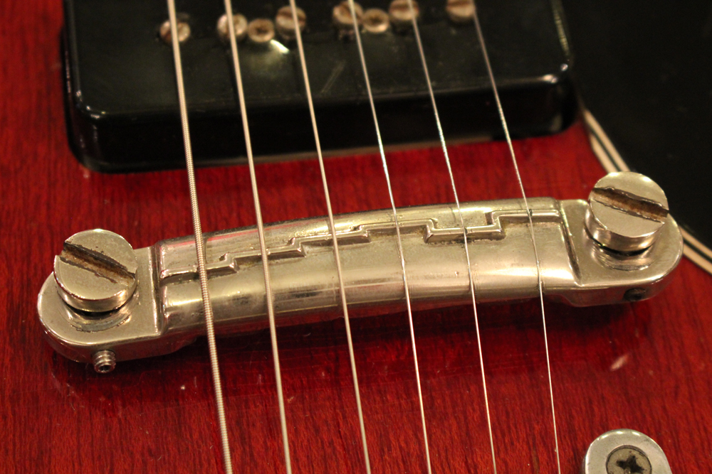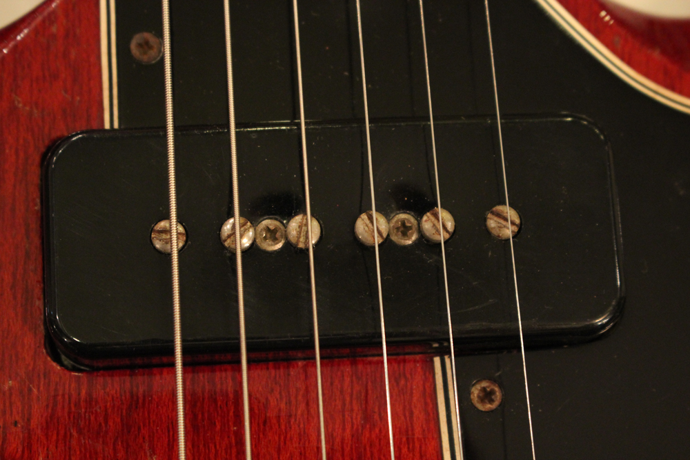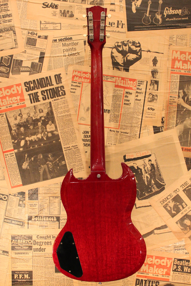今回入庫は、SG発売の61年からの仕様を受け継ぐ65年の初期製で、42mm幅のワイドナット、濃茶なローズ指板のネック、そしてニッケル・ハードウエアと、64年迄の仕様を受け継いだ機体です