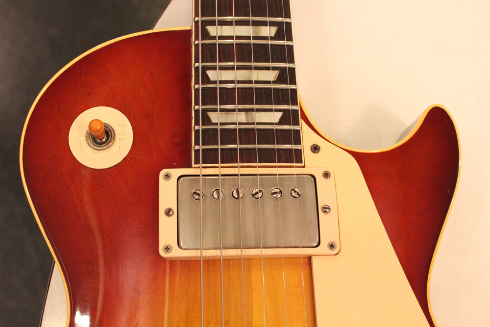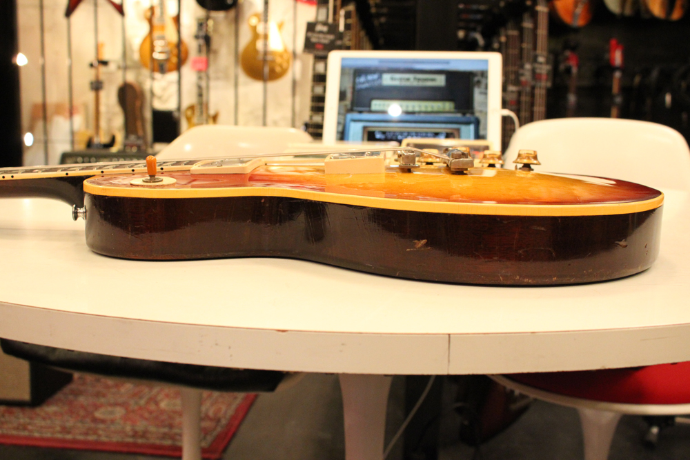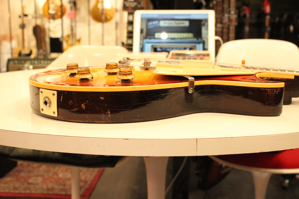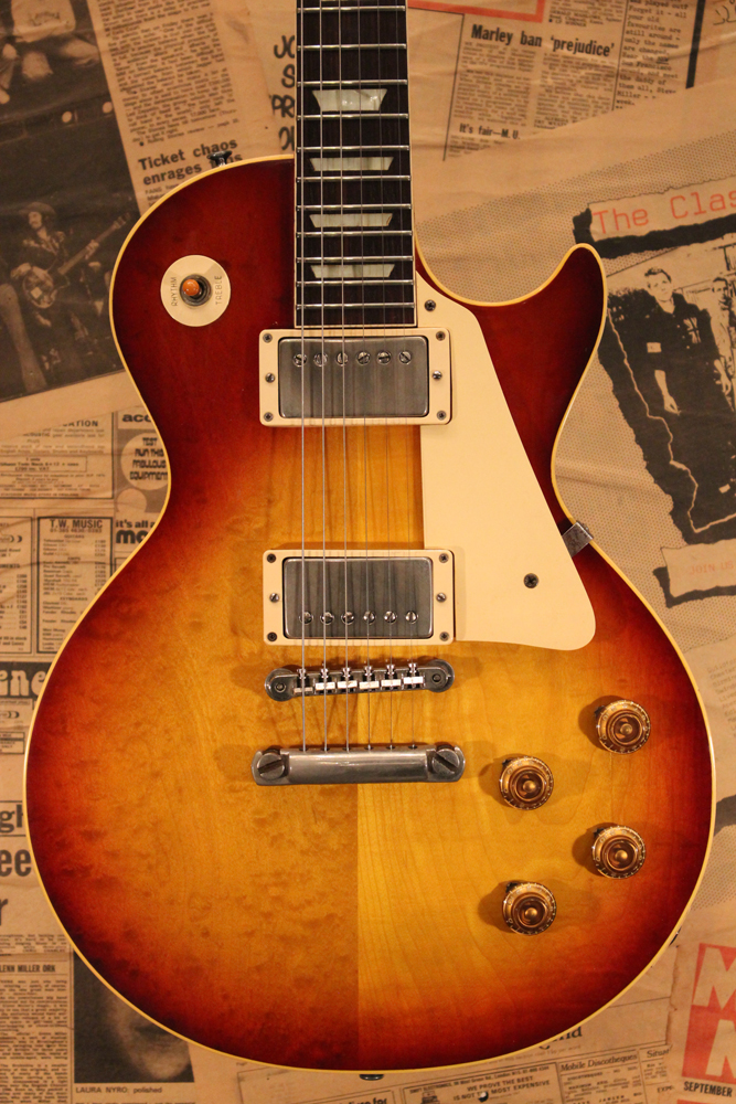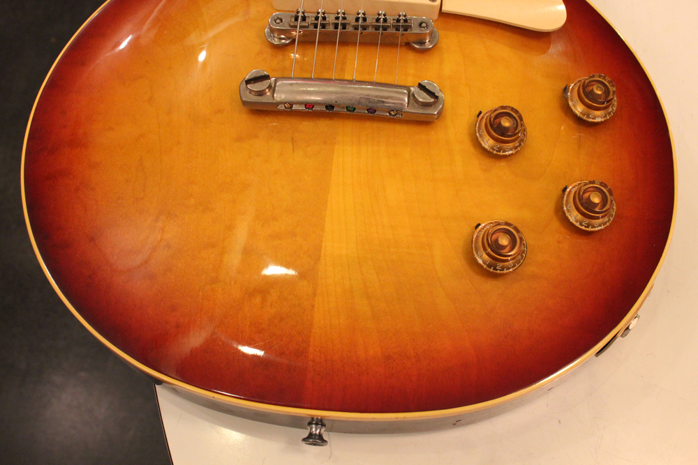 しかも、非常に珍しい、ツーピースの雰囲気の良いフィギュアの入ったメイプルトップを持った機体をベースに、バースト・レス・ポール仕様にコンバージョンされた機体を見つけて来ました!フィニッシュは、ボディトップのみ、ニトロ・セルロース・ラッカーにてリアルなバースト・フェイスにリフィニッシュを施され、その他、ネック、ボディバック等はオリジナル・フィニッシュをキープしています