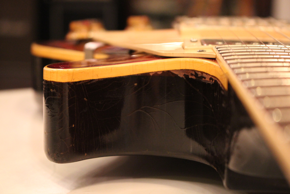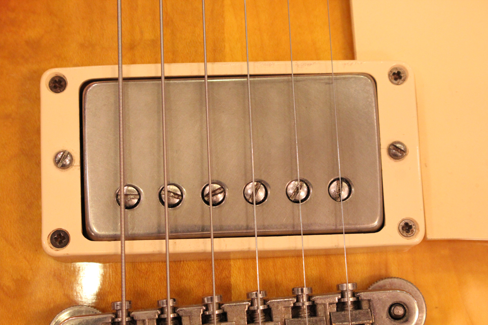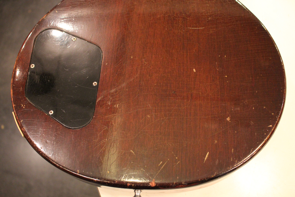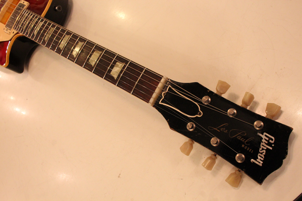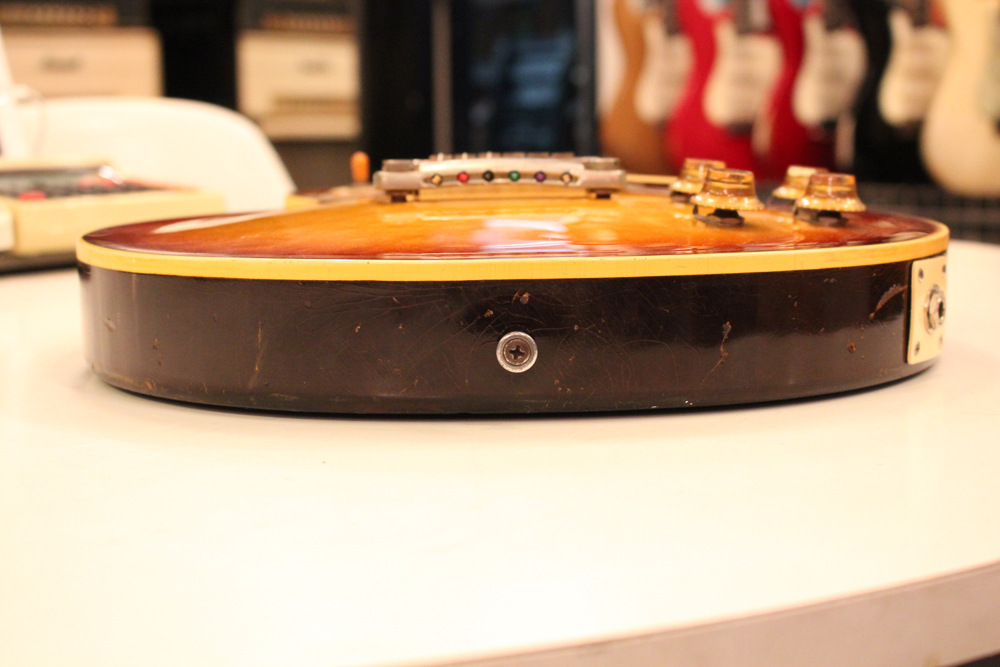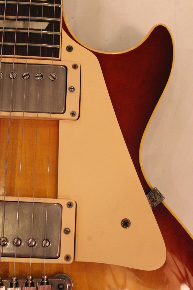 しかも、非常に珍しい、ツーピースの雰囲気の良いフィギュアの入ったメイプルトップを持った機体をベースに、バースト・レス・ポール仕様にコンバージョンされた機体を見つけて来ました!フィニッシュは、ボディトップのみ、ニトロ・セルロース・ラッカーにてリアルなバースト・フェイスにリフィニッシュを施され、その他、ネック、ボディバック等はオリジナル・フィニッシュをキープしています