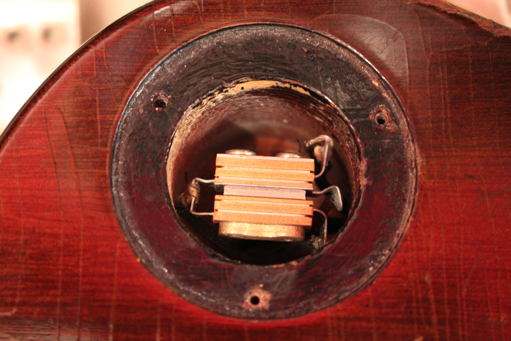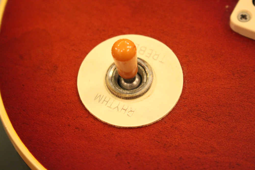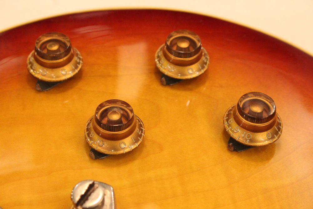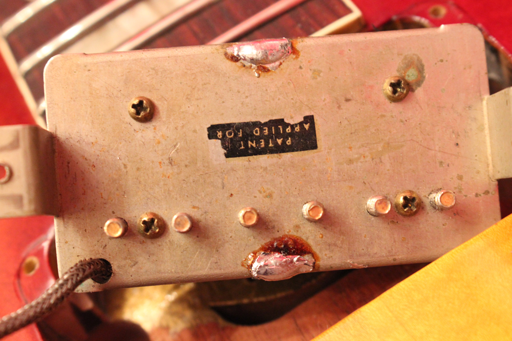 本来がダークバック仕様でしたので、トップのティー・バースト・フィニッシュとも違和感なくマッチしていますピックアップは、ロングマグネット仕様の50年代パテント・アプライド・フォー・ピックアップを搭載しており、