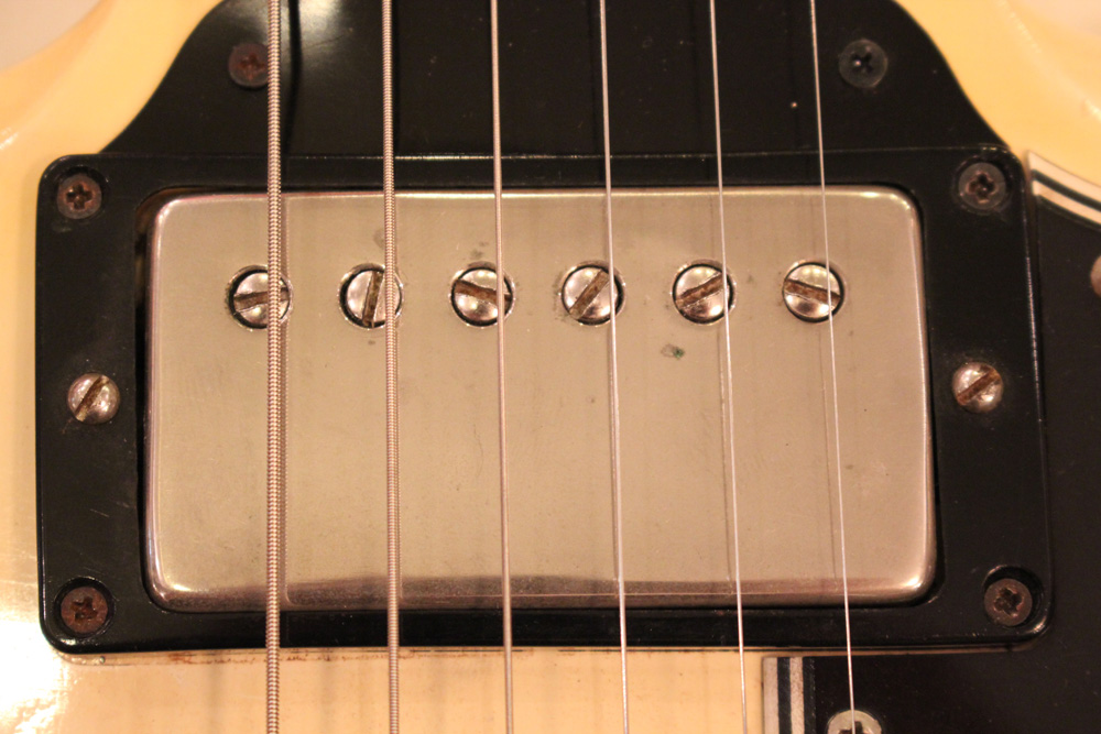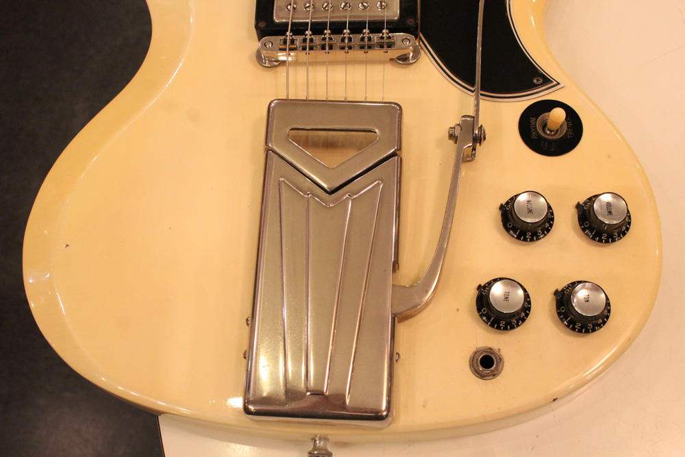 ヴィブラート・ユニットとしては評価の低い"プル・サイドウエィ・ヴィブラート"ですが、質量の大きさと、ユニットの構造から得られるトーンは、63年以降の簡素なロング・ヴァイブローラと比べ、よりリッチで艶やかなサウンドが得られ、スイートな"P.A.F"トーンと相まって、初期"SG"モデルは、多くのミュージシャンに愛された素晴らしいサウンドです