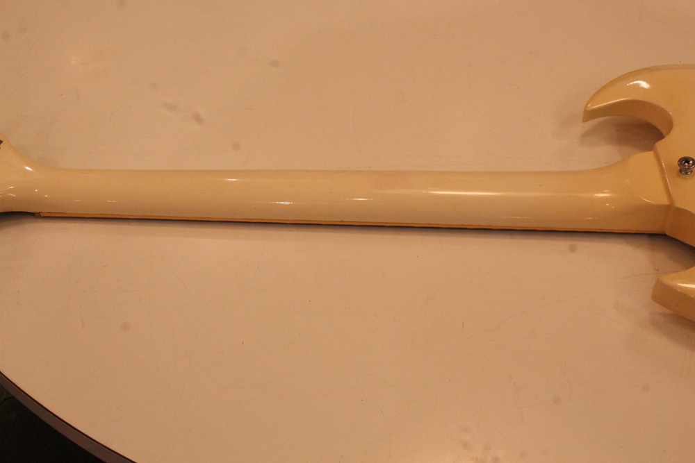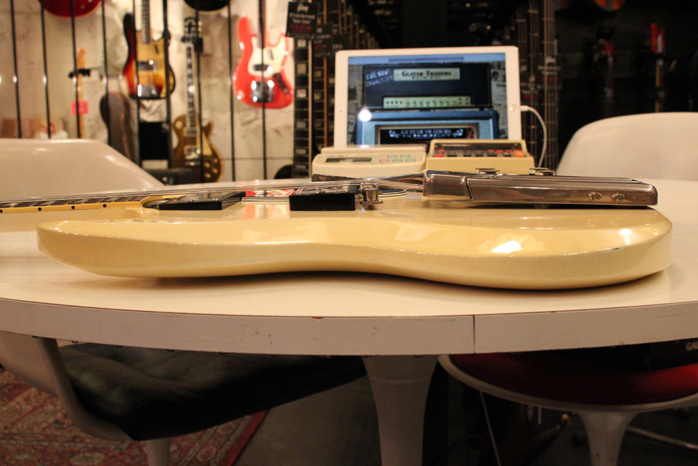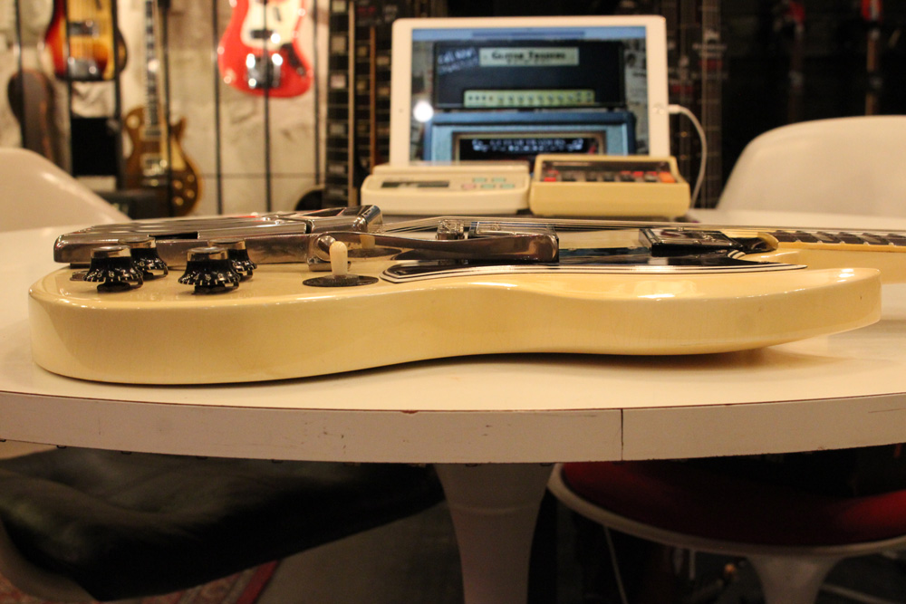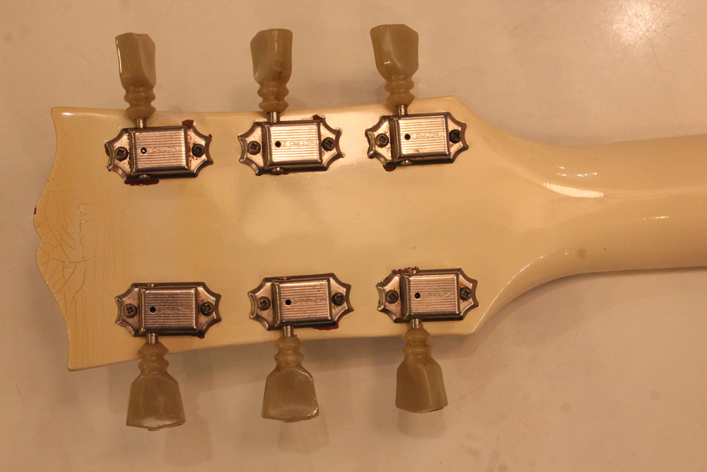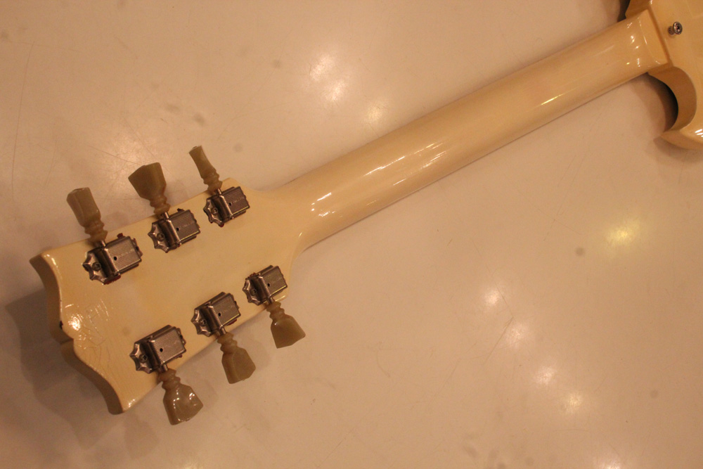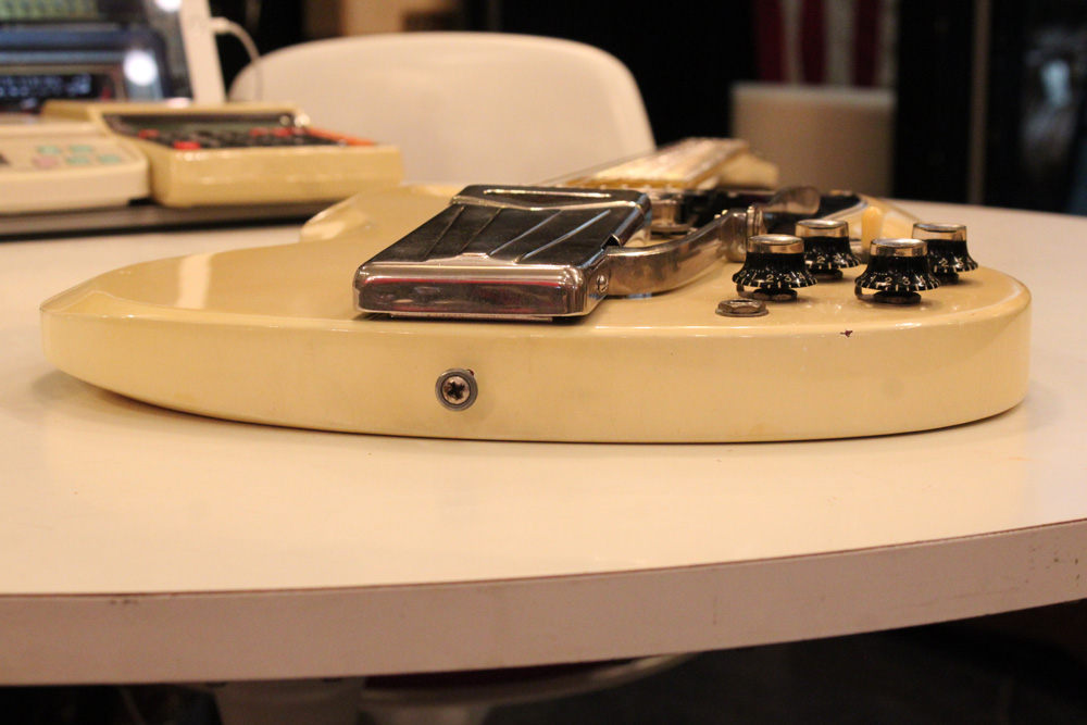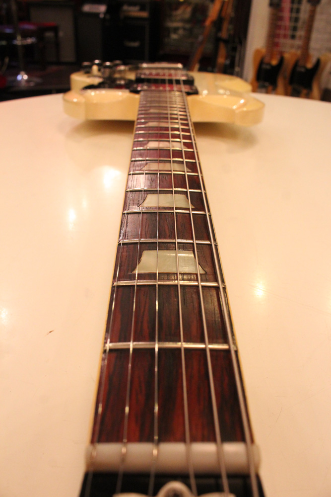 スタンダード・モデルは、ハイポジションまで弾き易いダブルカッタウェイ・シェイプに、軽量な薄いボディ厚マホガニー・ワンピース・ボディと、上位機種には当然要求されたヴィブラート・ユニットが搭載され、発売当時、市場の人気を博しました今回見つけて来た個体は、少数だけ存在する、オリジナル・ホワイト・フィニッシュのレア・ピース!