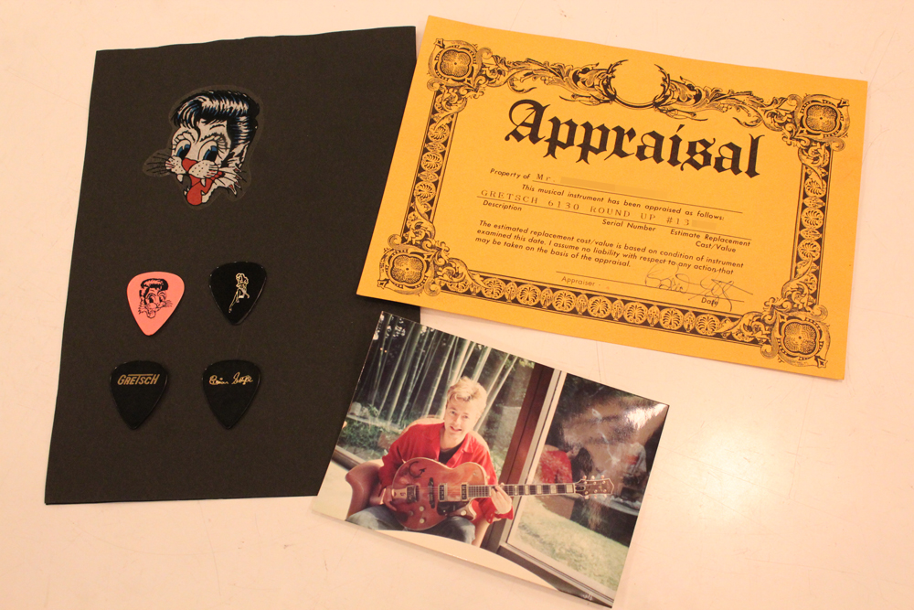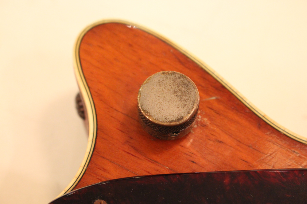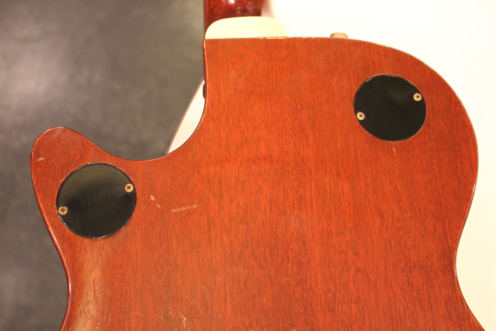 パイン材をボディ・トップに使用したモデル! しかも、スーパー・レアでUSAでも高額なプライス・タグを付けられている、”4 Konoty Pine”と呼ばれる、パイン材特有の“節”が4個出ているトップ材を使用しており、オリジナルのバースト・レスポールのバリトラ・トップの様に、グレッチ・ファンの間では、非常にレアな個体として珍重される機体です尚且つ! こちらの機体は、ヴィンテージ・ギター・ファンのみならず、ロック・ミュージックが好きな方なら当然ご存知で、グレッチ・ギターには大変縁の深いスーパー・ギタリストが所有していた機体で、サイン入りのアプライザルとギターを抱えた写真や本人使用のピック等も付属します
