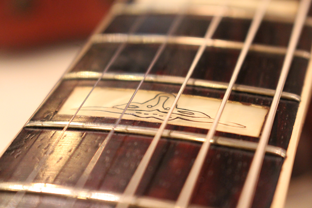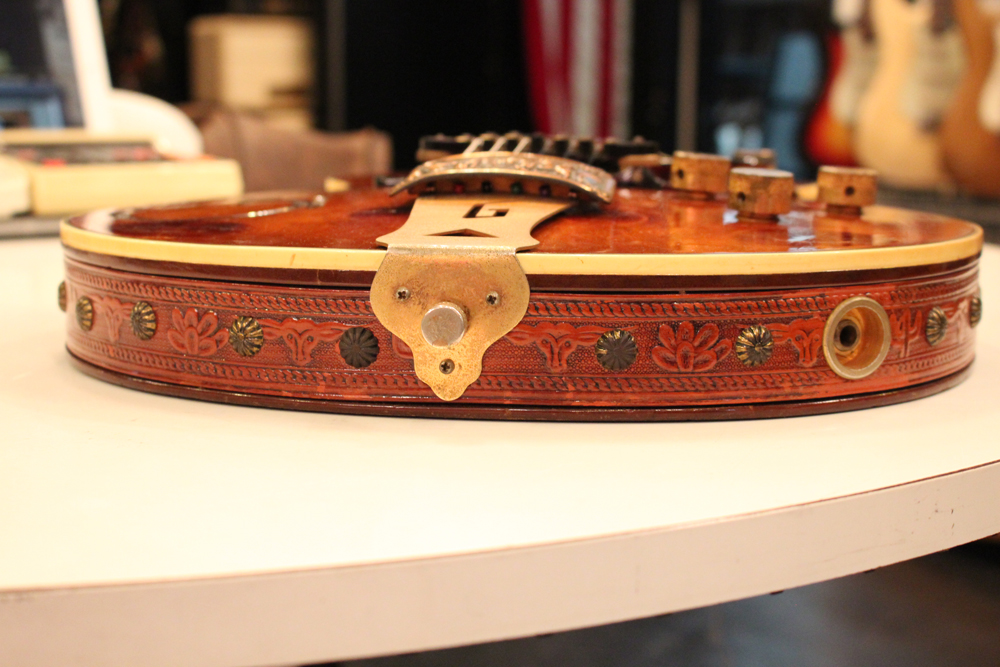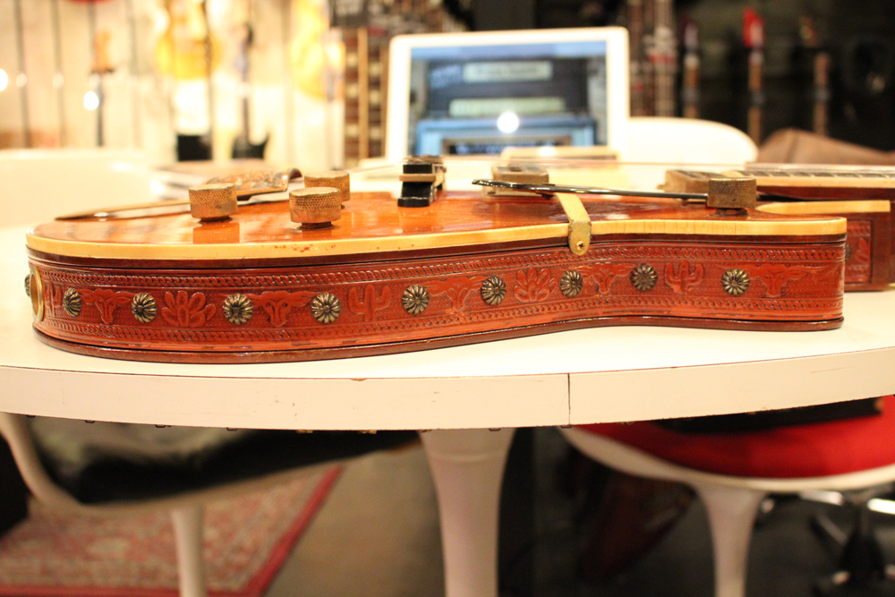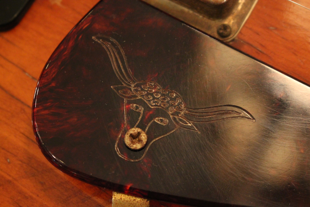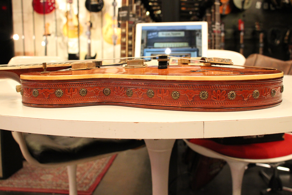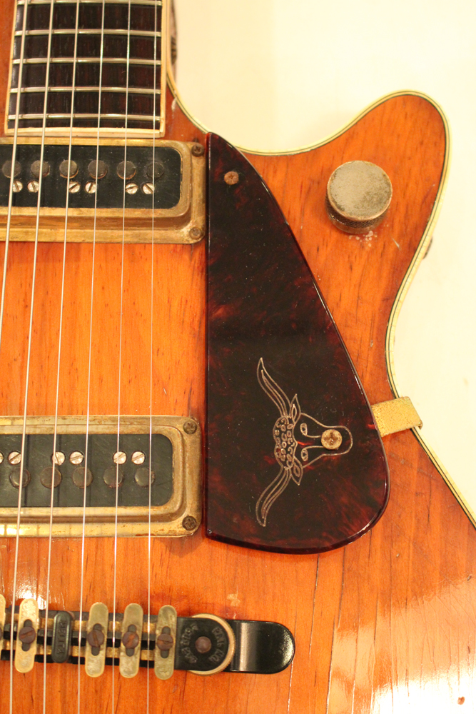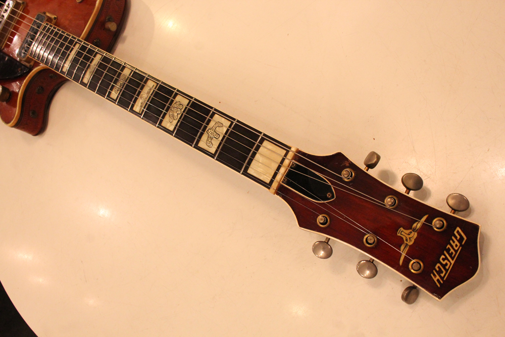 1954年に発売された、Chet Atkins・Model #"6120" と同様な外観を持たせた、グレッチ・ソリッドボディ・モデルの上位機種として、同じく54年に登場する Model# "6130" Round Up !今回入庫は初期の55年製! ボディへの"G"ブランド刻印、"Cow & Cactus" のイングレイブが施されたフィンガーボード、ヘッドストックとピックガードのホースシュー・インレイ、そしてボディ外周に巻かれた、イングレイビングが施されたウエスタン・ベルト、そしてテールピースにはウエスタン柄のベルトバックル迄もが奢られた、