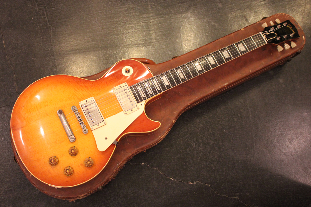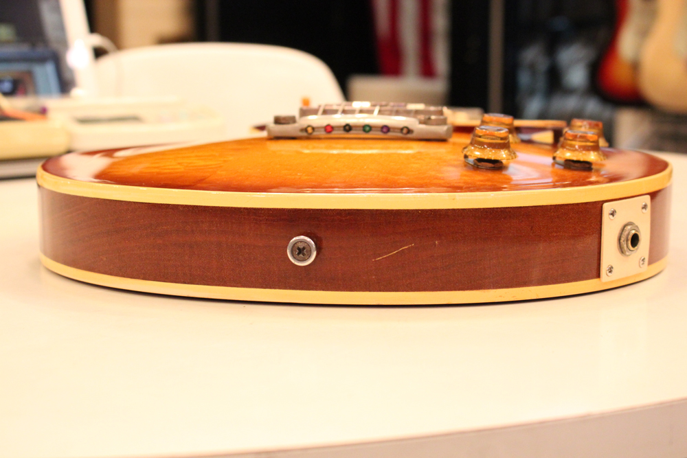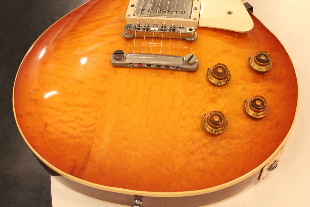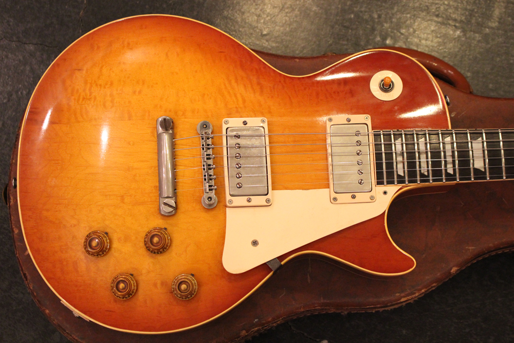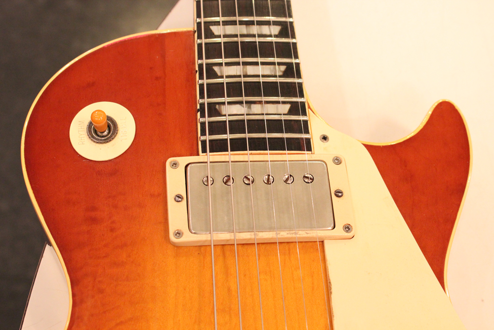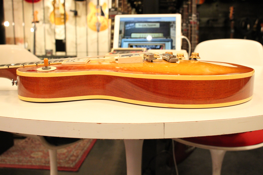 57年のオリジナル・PAF・ゴールドトップ・レス・ポールを、ヴィンテージ・ギターのレストアや、Gibson社の特別なヒストリック・モデルのフィニッシュやエイジングを行なっている、”Guitar Preservation“のトム・マーフィ氏により、バースト・カラーにリフィニッシュされたレス・ポール・スタンダードです