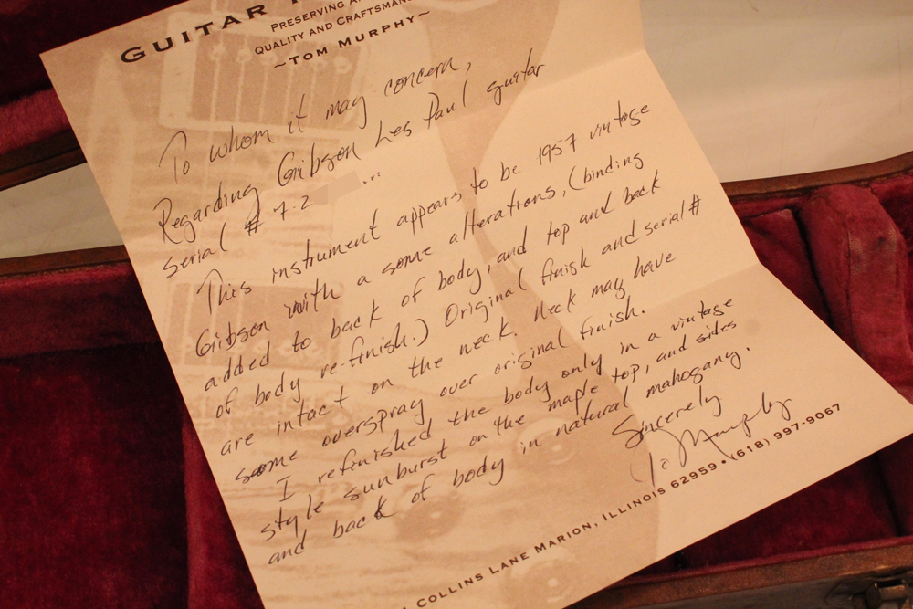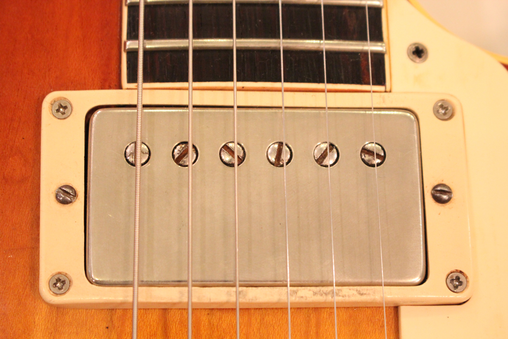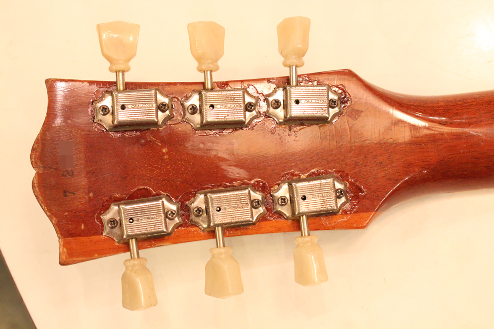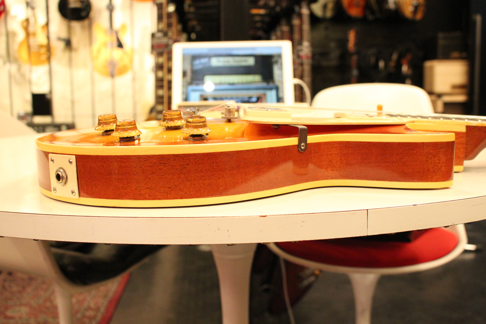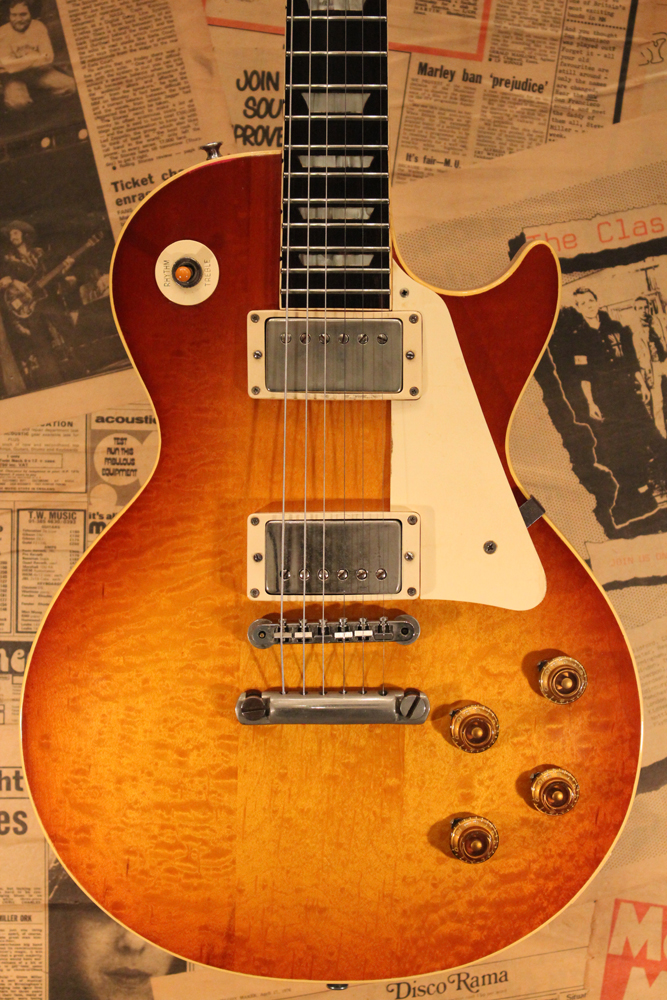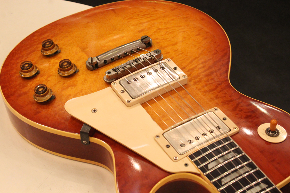 57年のオリジナル・PAF・ゴールドトップ・レス・ポールを、ヴィンテージ・ギターのレストアや、Gibson社の特別なヒストリック・モデルのフィニッシュやエイジングを行なっている、”Guitar Preservation“のトム・マーフィ氏により、バースト・カラーにリフィニッシュされたレス・ポール・スタンダードです