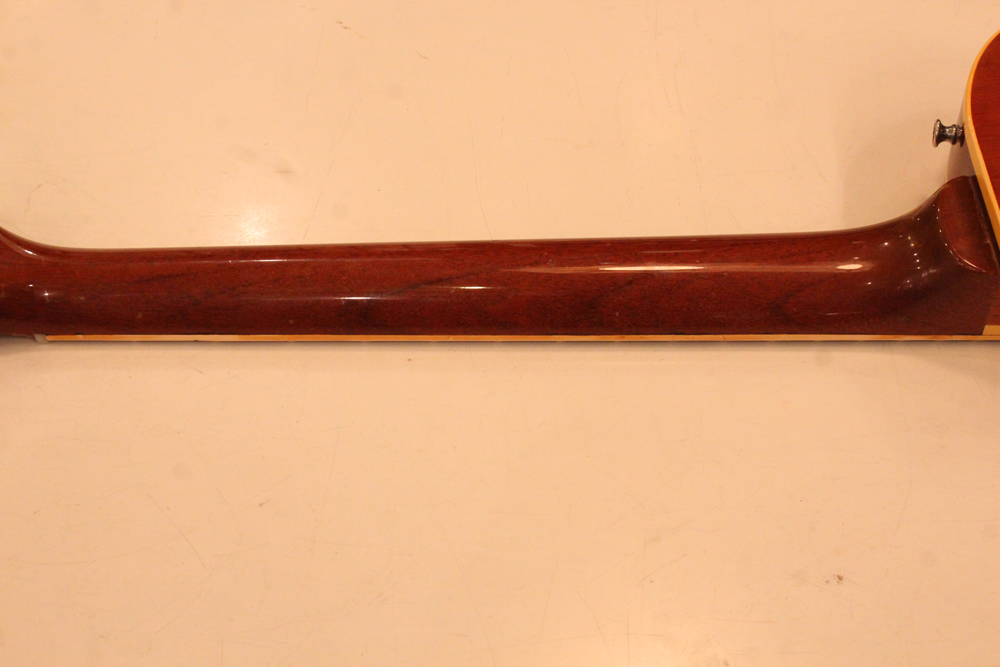 カラーはトップ材のフィギュアを活かしたティー・バーストカラーでフィニッシュされ、ボディバックはナチュラル・マホガニー・カラーでフィニッシュされています また、スリーピースながら、リアルなフレイムが出たボディトップはなかなかクールなルックスで、ヘッドのシリアルナンバーもオリジナルを残してフィニッシュされています