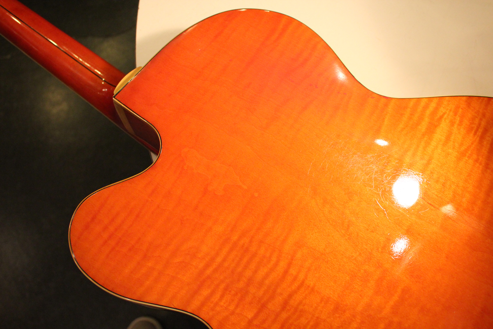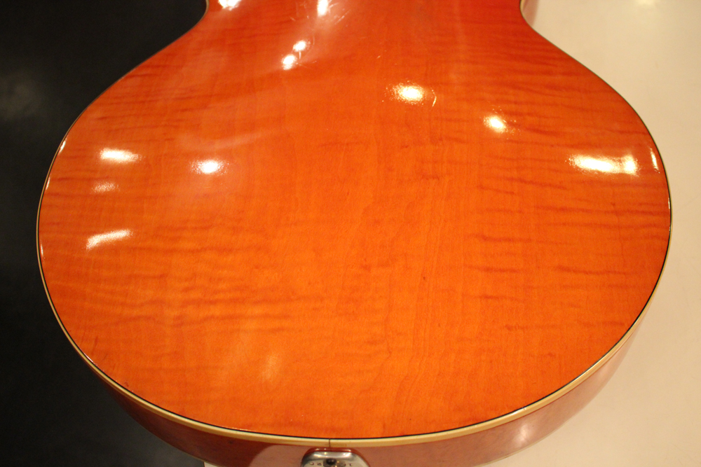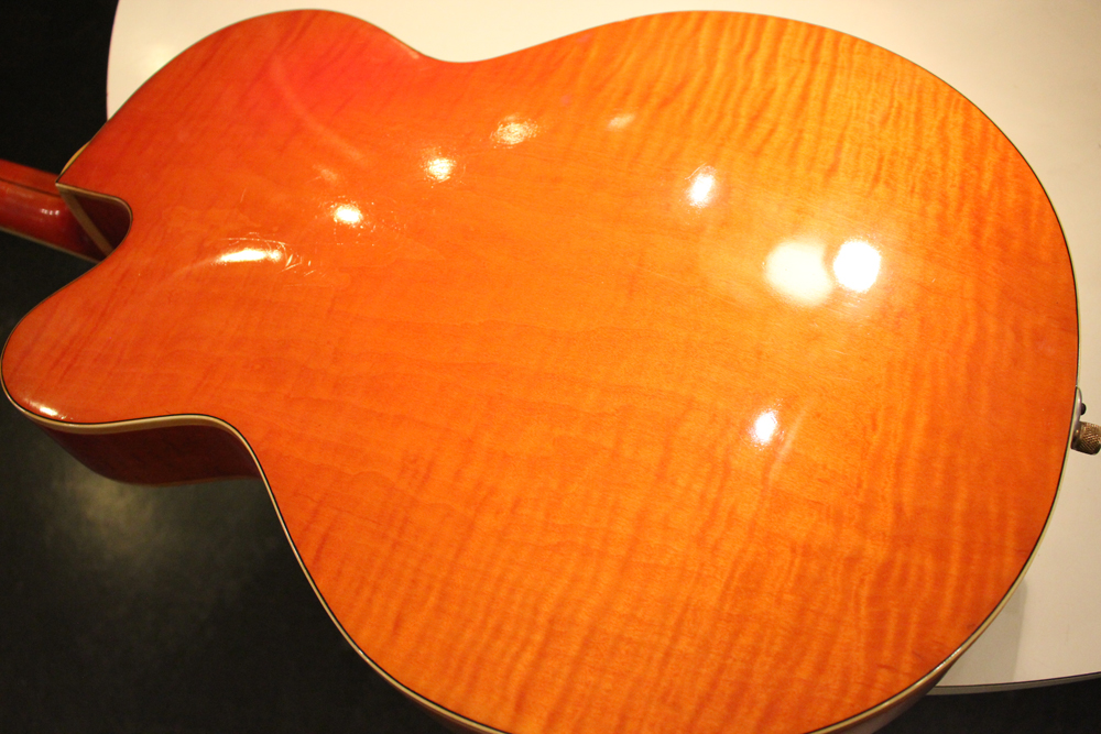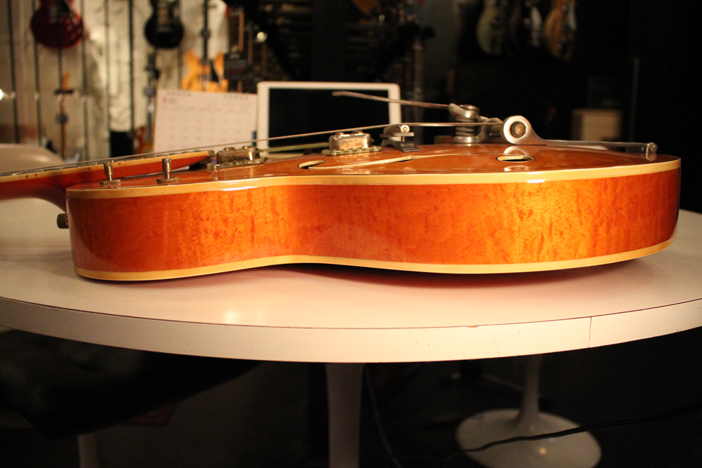今回入庫は、レアなフレイム・メイプルをボディに使用した"6120"! ボディ・トップは勿論、サイド、バック共、全体にフレイムが入っており、角度によってワイルドに見え隠れするフィギュアはオリジナル・ヴィンテージならではのルックスです