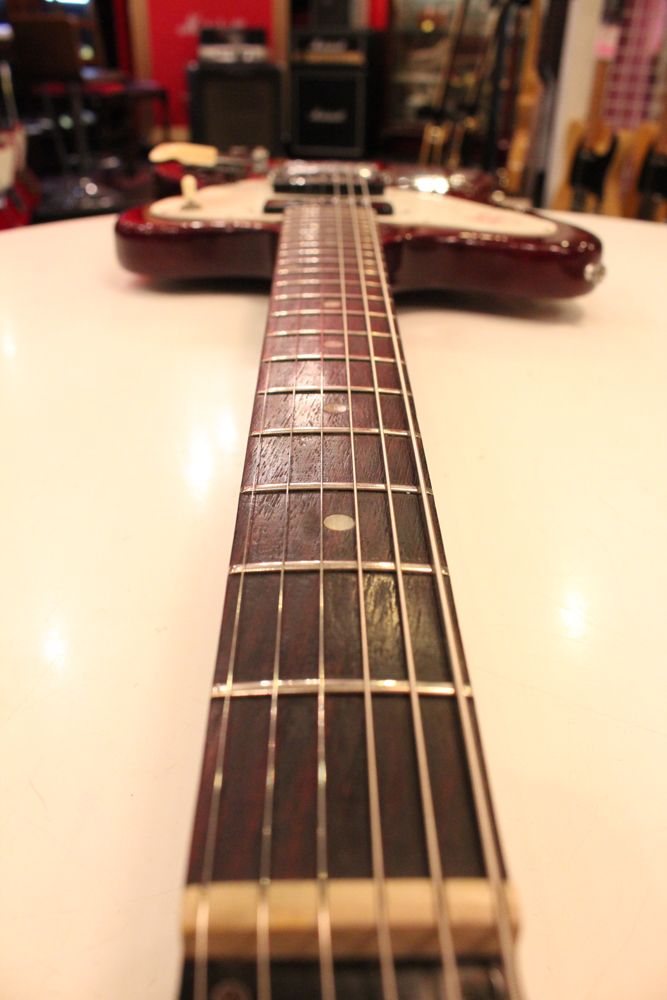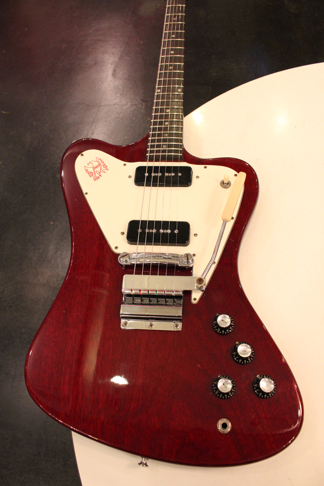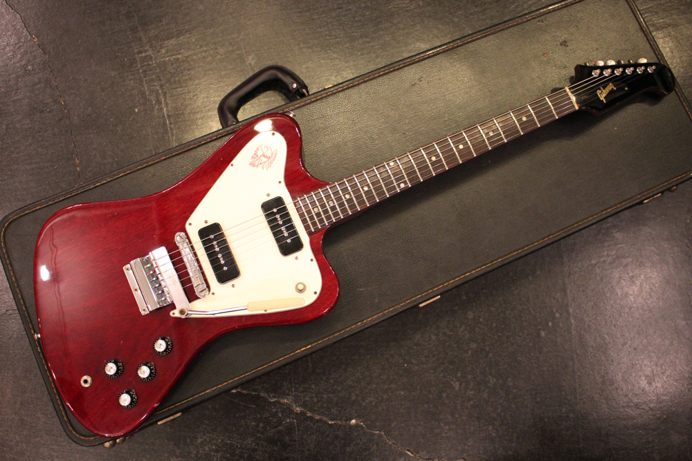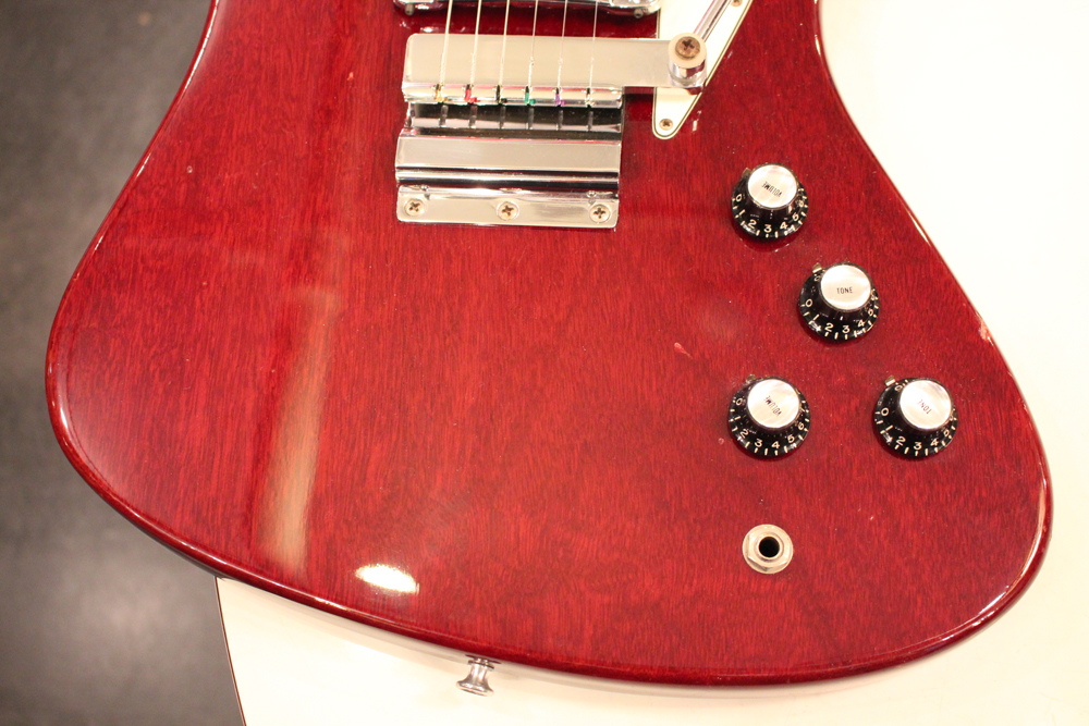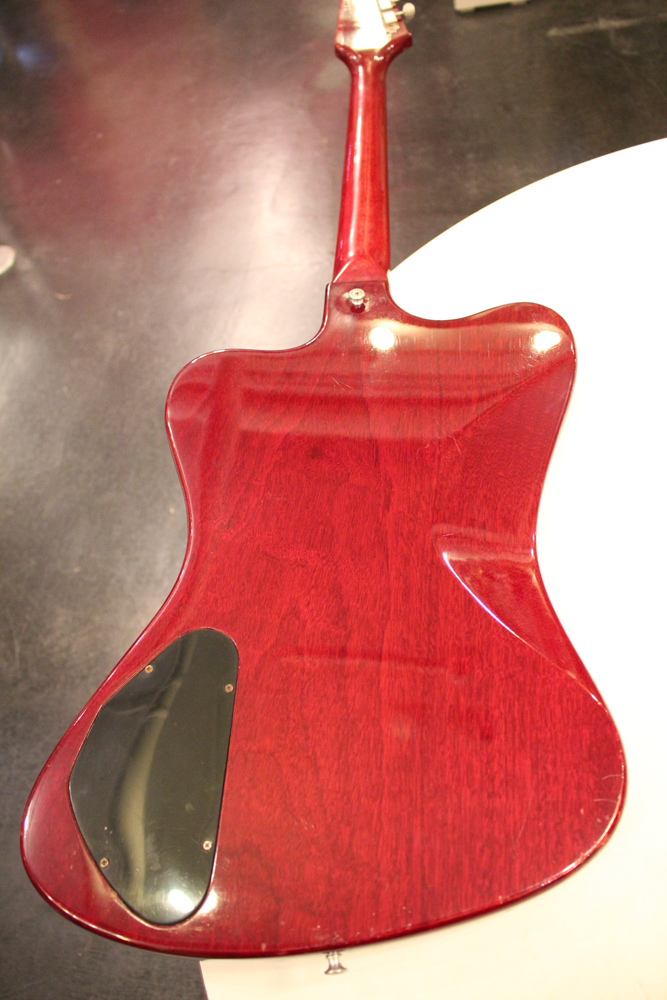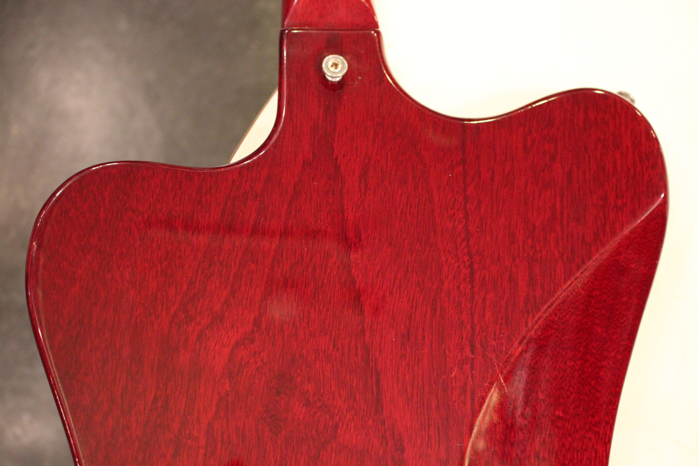 64年の登場時より、ファイヤーバードはサンバースト・フィニッシュが標準カラーなりますが、カラーチャートカタログに載せられた10色のカスタムカラー以外にも、ブラックとチェリーレッドが少数ながら存在していましたこちらは、そのチェリーレッド・フィニッシュのファイヤーバード・ワン!