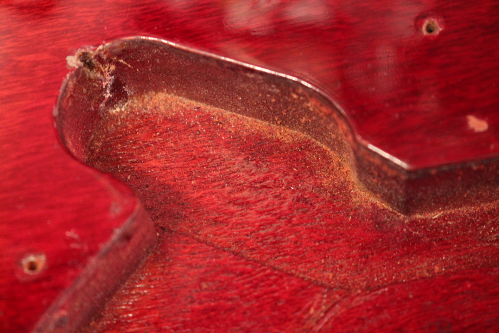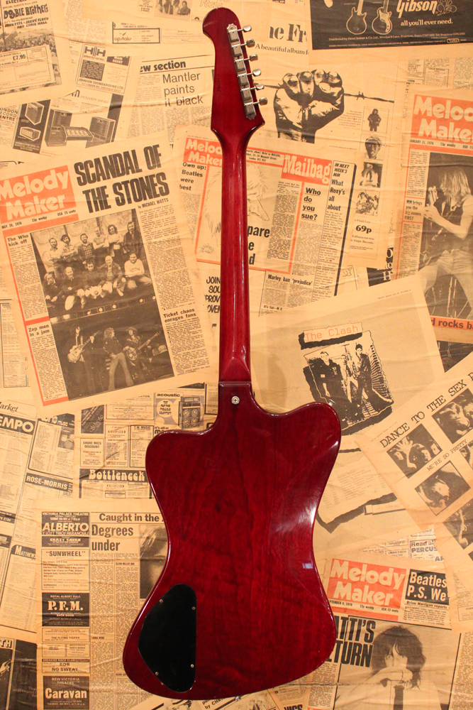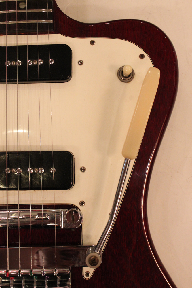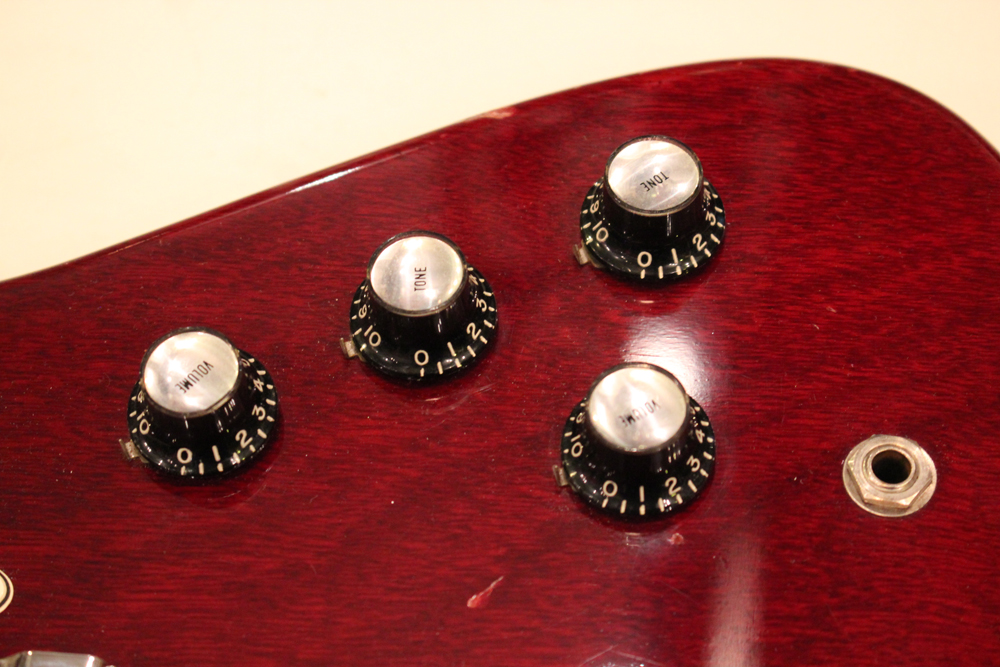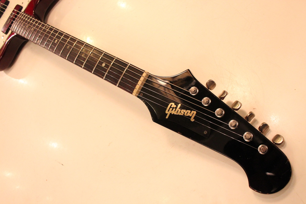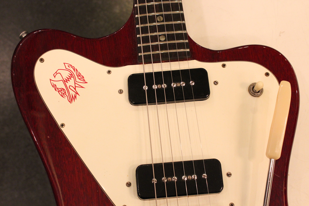 64年の登場時より、ファイヤーバードはサンバースト・フィニッシュが標準カラーなりますが、カラーチャートカタログに載せられた10色のカスタムカラー以外にも、ブラックとチェリーレッドが少数ながら存在していましたこちらは、そのチェリーレッド・フィニッシュのファイヤーバード・ワン!