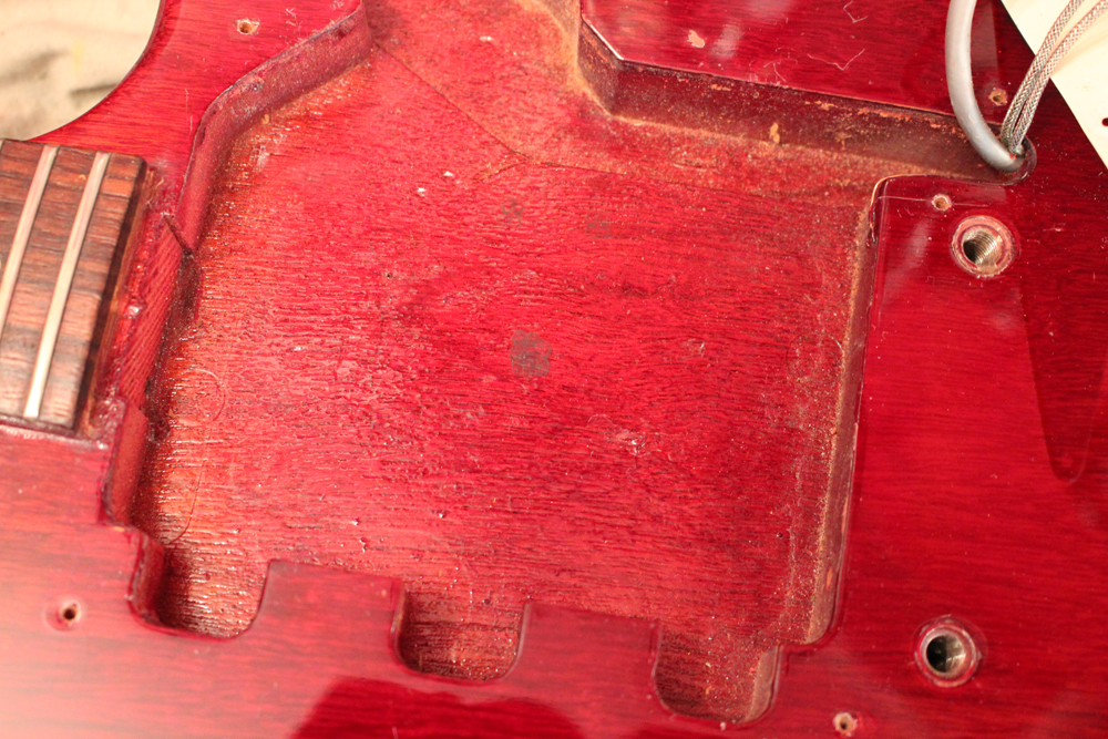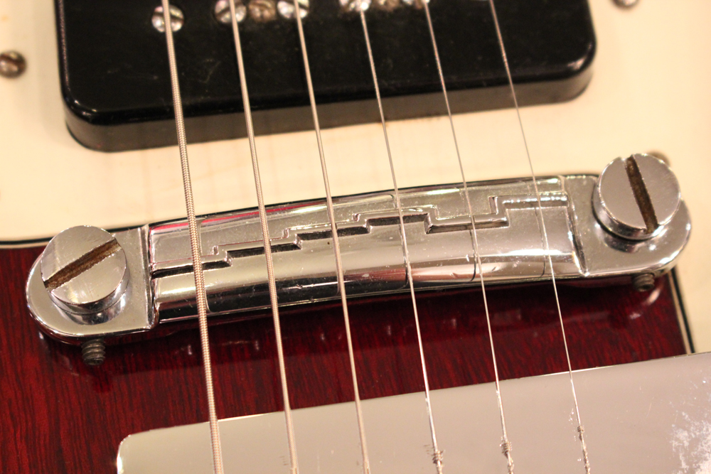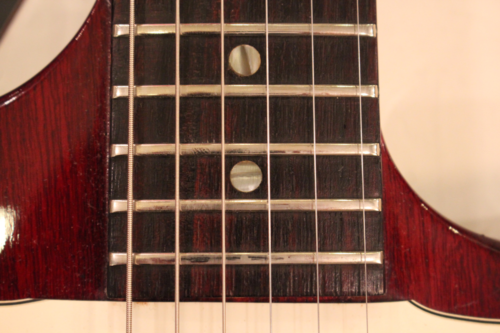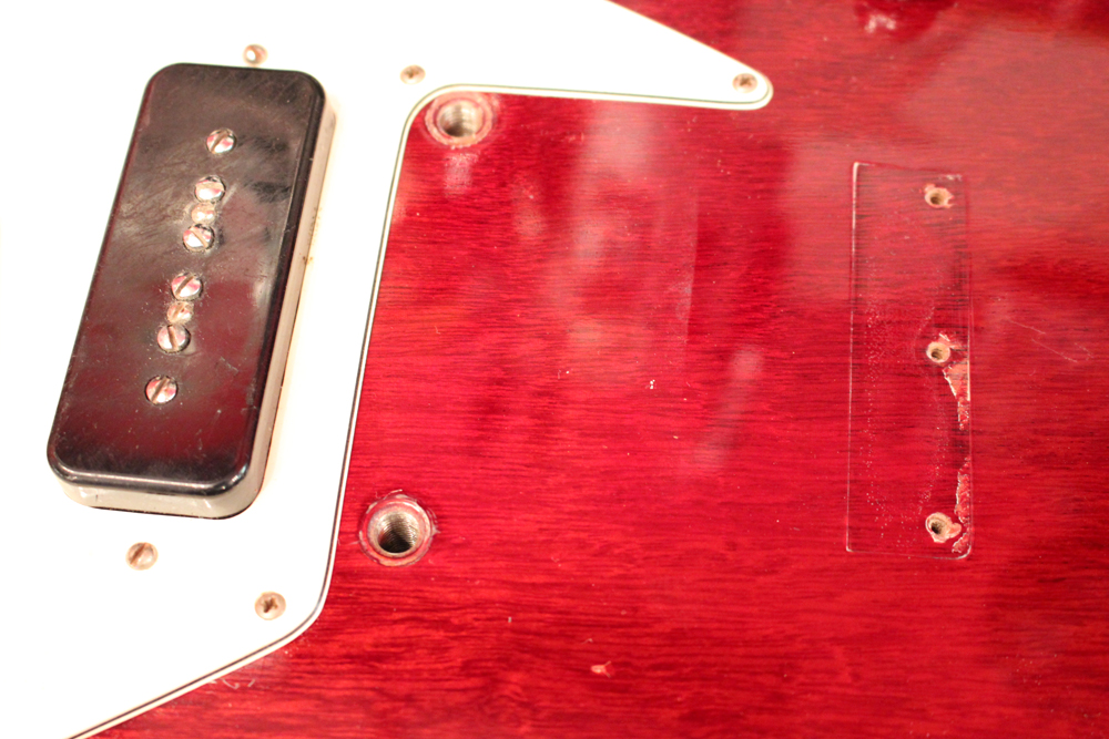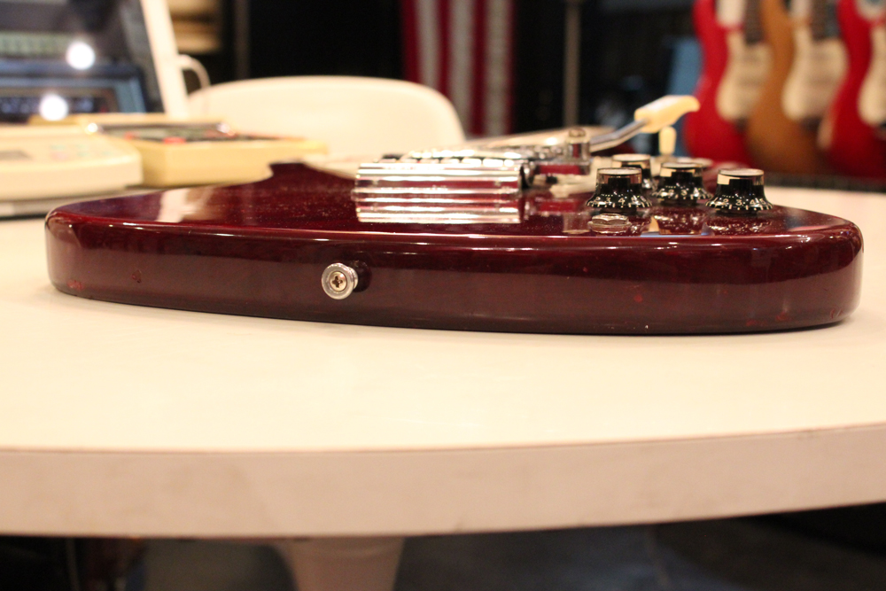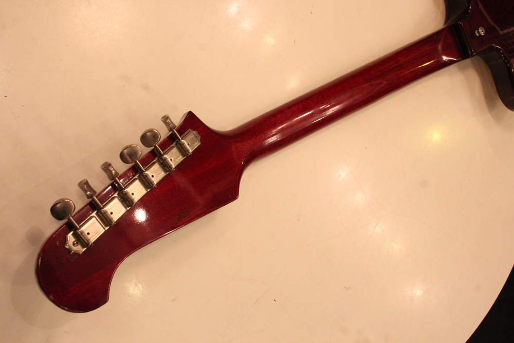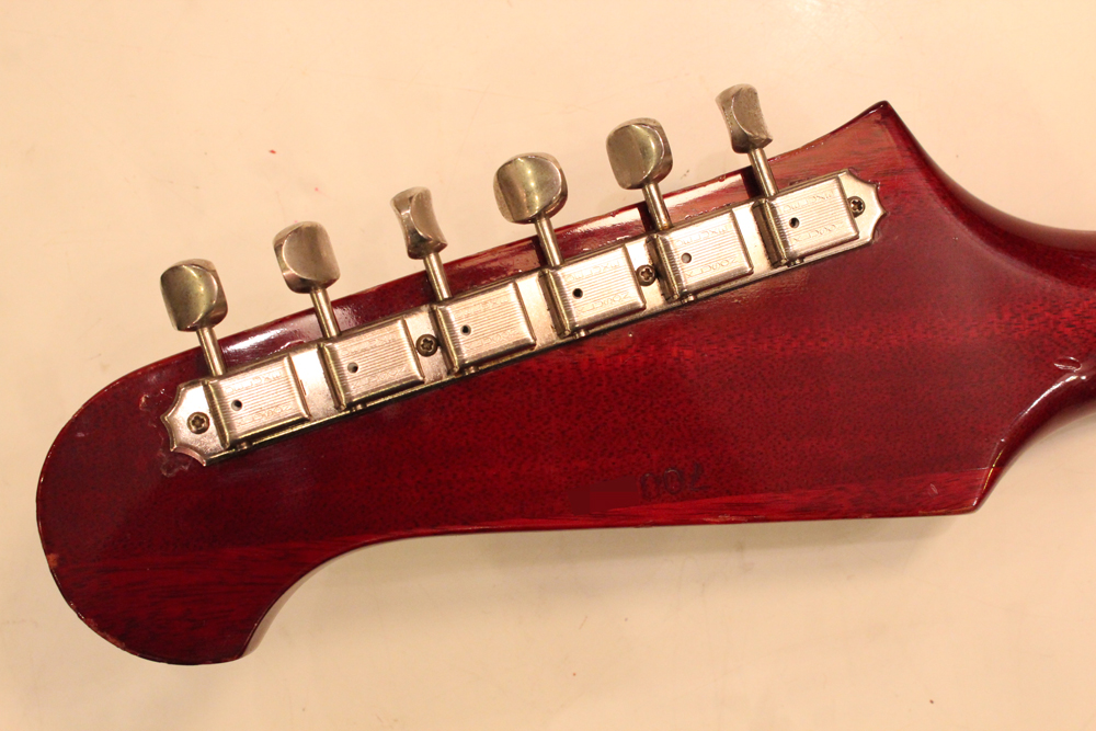 全体的な印象も、チェリーレッド・カラーのお陰で、60年代のフライング・Vを彷彿する様なルックスです内容は、フレット、ナットのリプレイス以外はパーツもオリジナルです