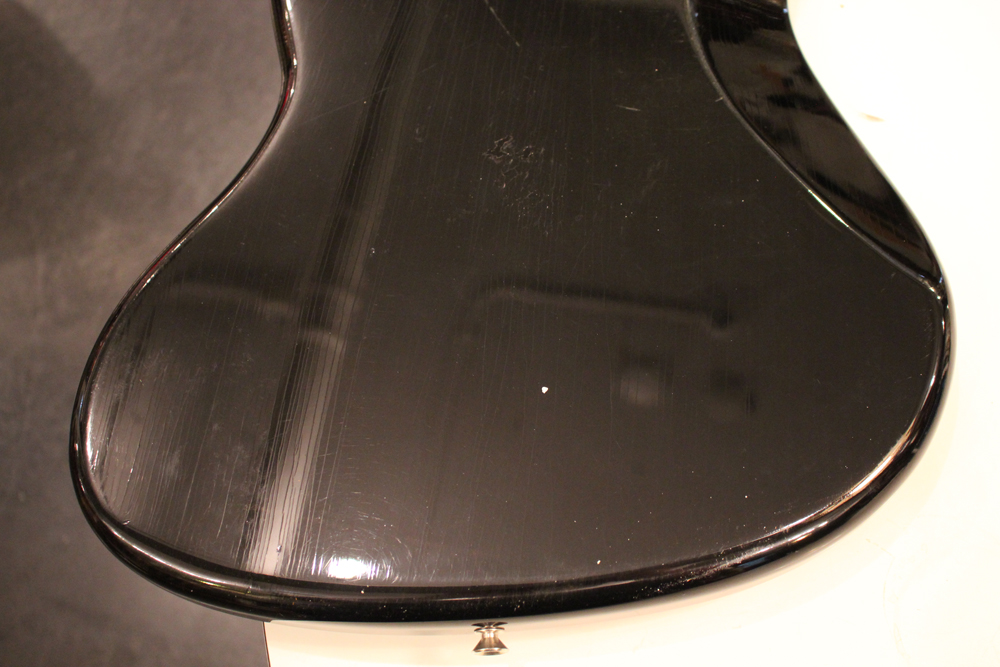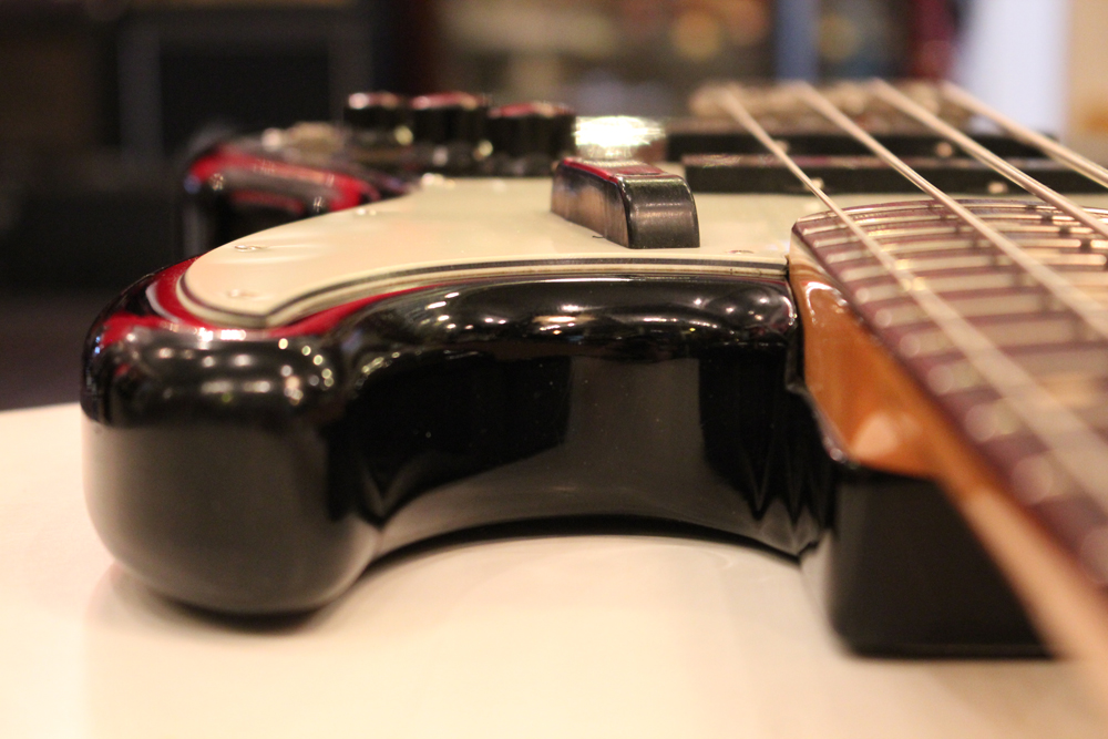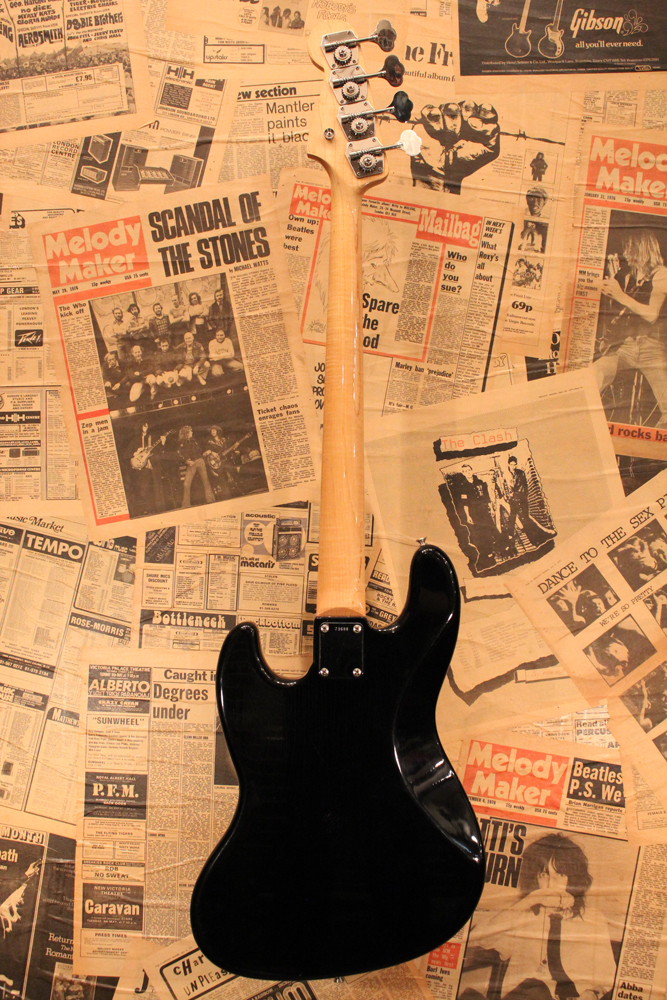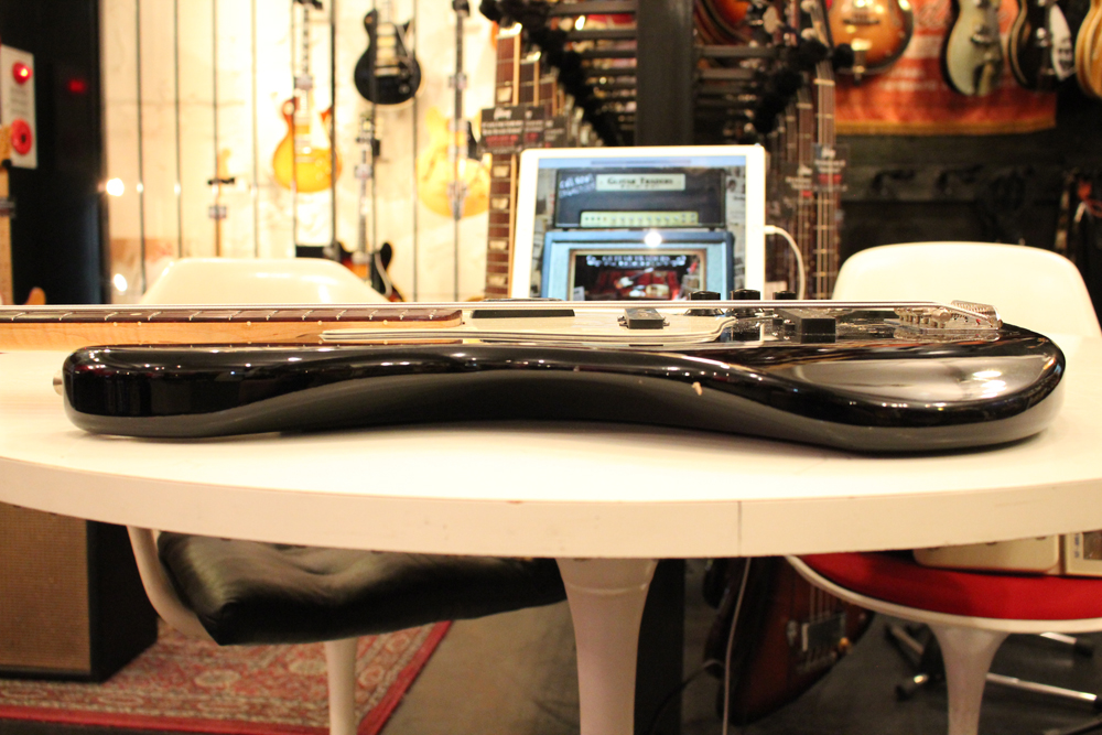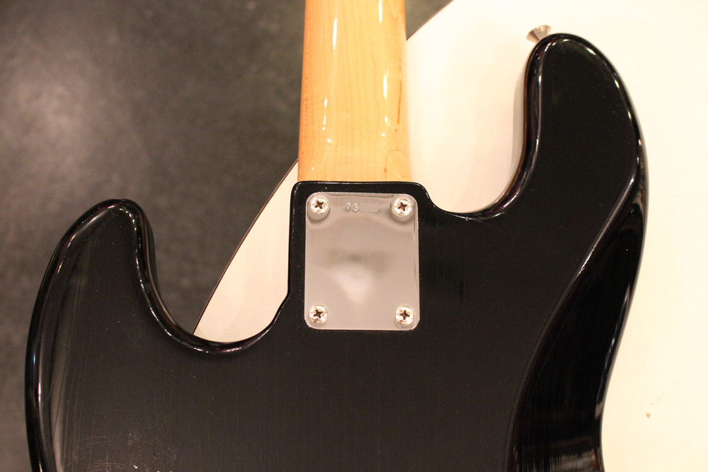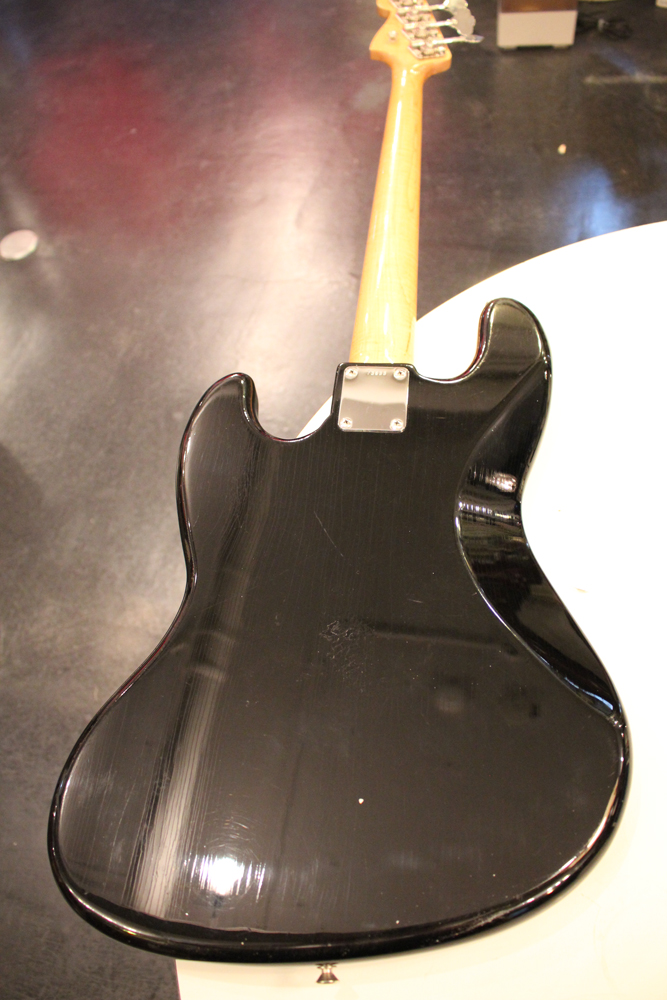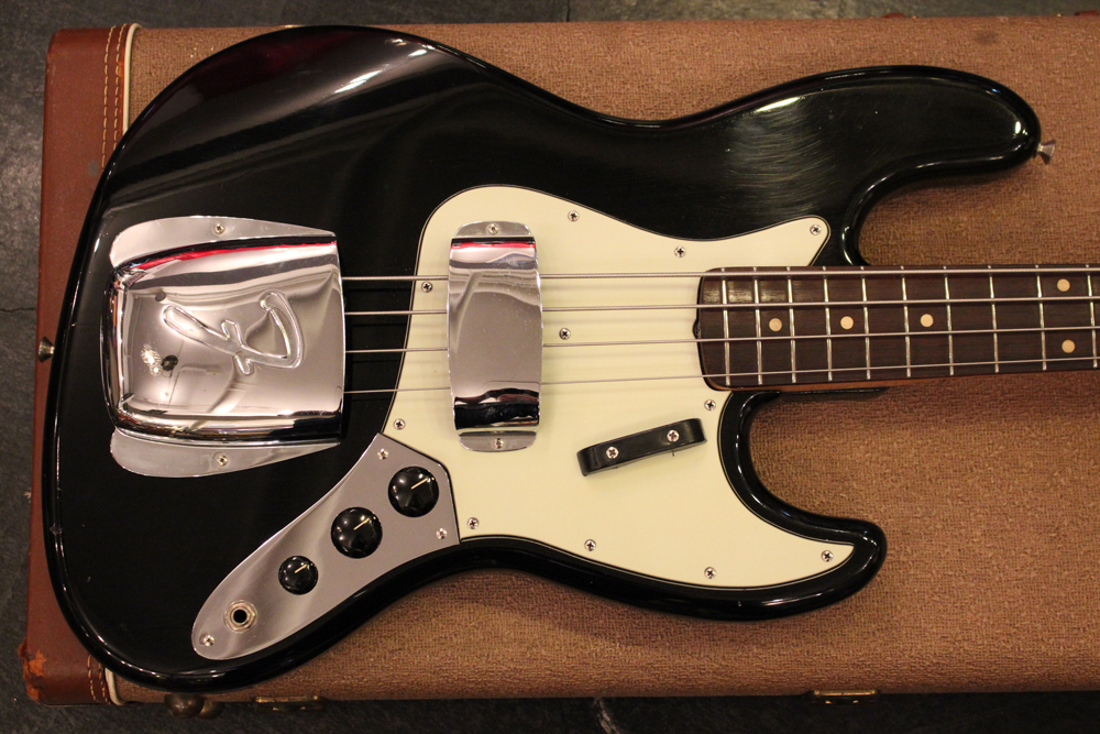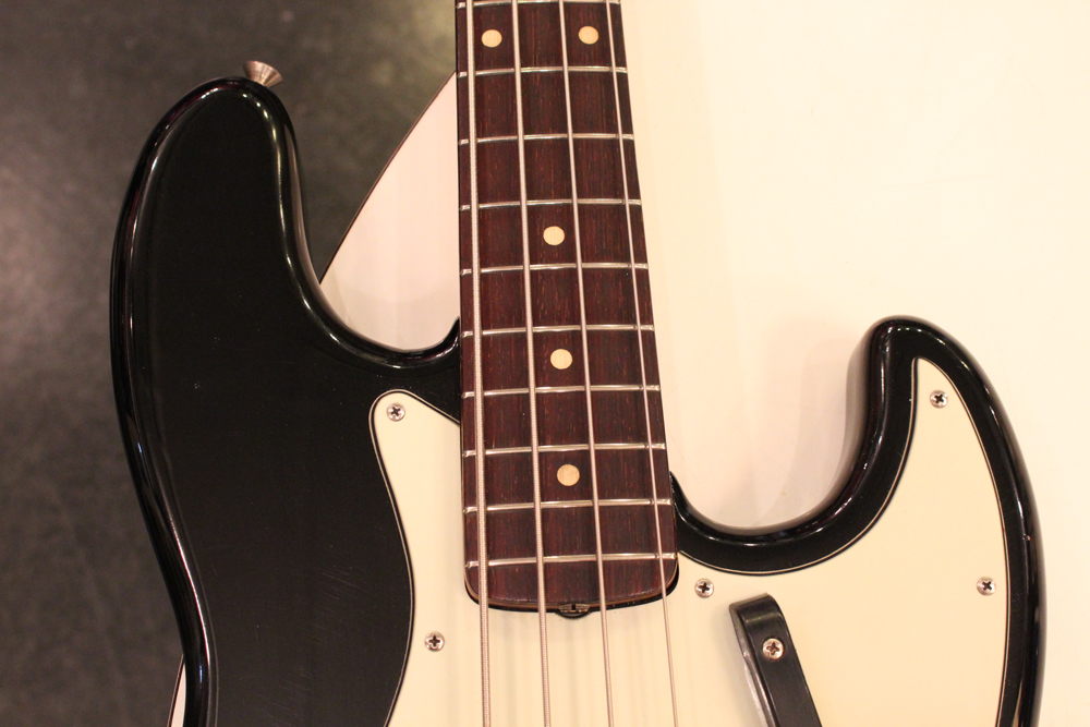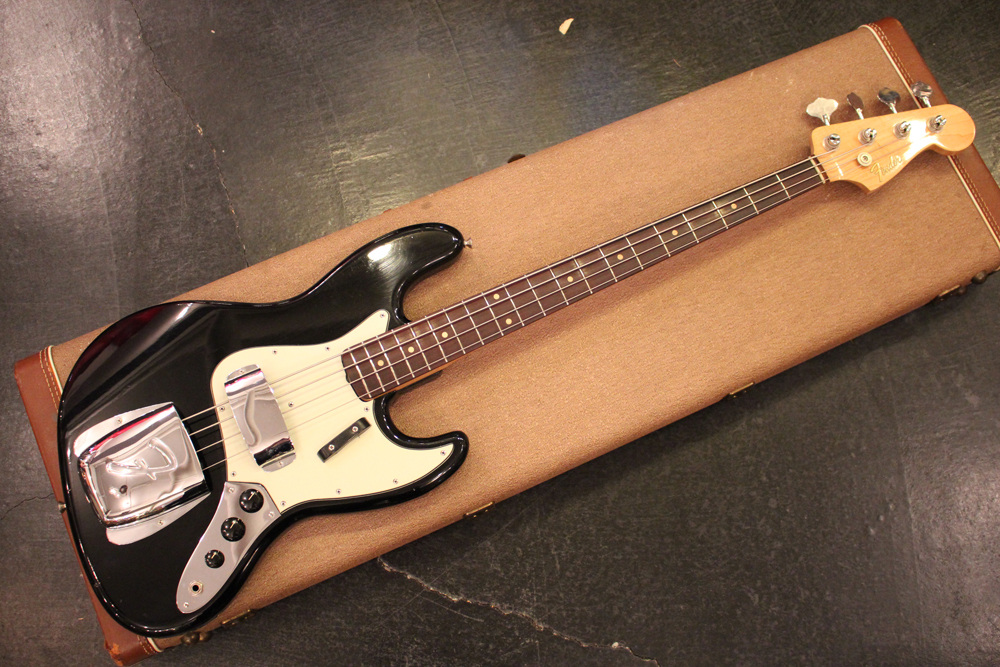 スーパー・レアなジャズ・ベースを見つけて来ました!1962年製のスラブ・フィンガーボード最終期のジャズ・ベース! しかもカスタム・カラーの中でも非常にレアなブラック・フィニッシュ! そして恐らくボディカラーと共にカスタムオーダーにて製作された思われますが、ネック全体にフレイムが入ったメイプル・ネックが採用されています