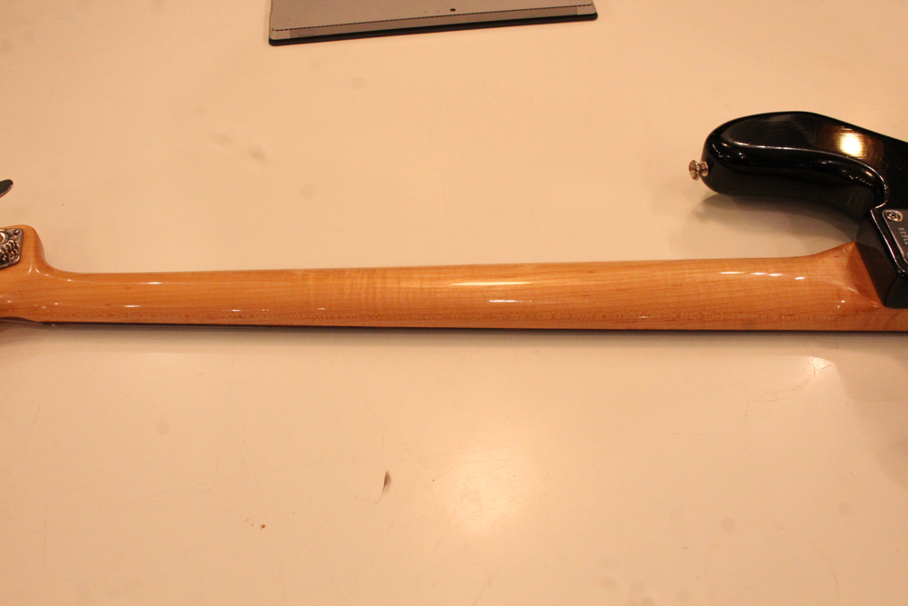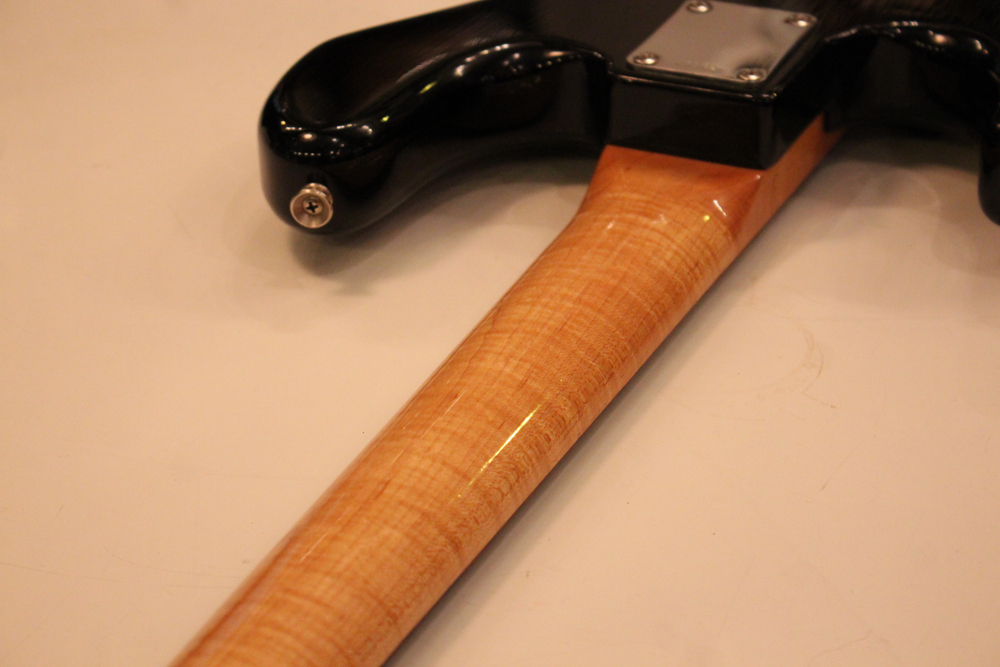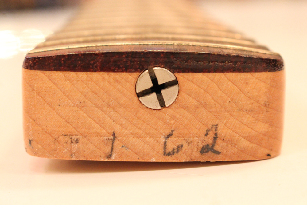 色焼け等も殆ど見られないメイプル材の白さを残したネックには、ヘッド、グリップ部共にビッシリとフレイムが浮き上がっており、フラットワウンドを使用していた事も影響していたと思いますが、指板もオリジナルの細めのフレットも全く減りやキズ等も見られません