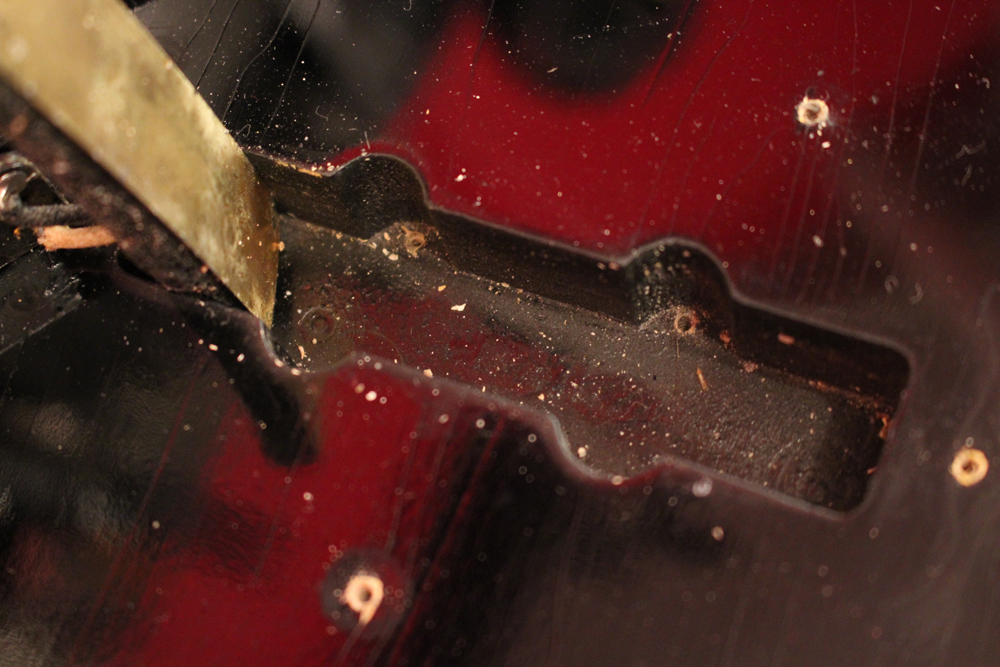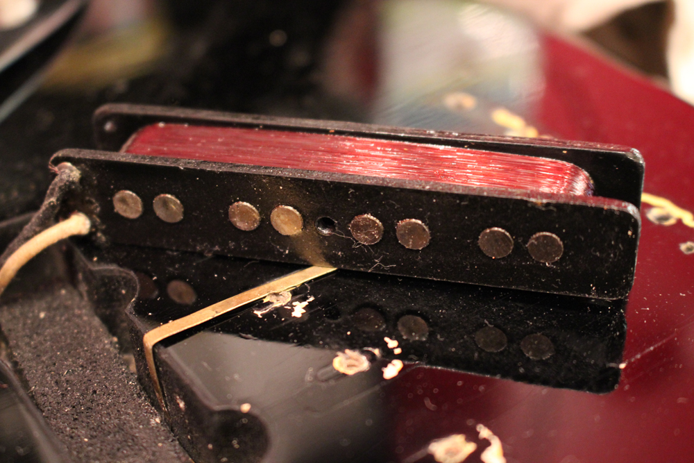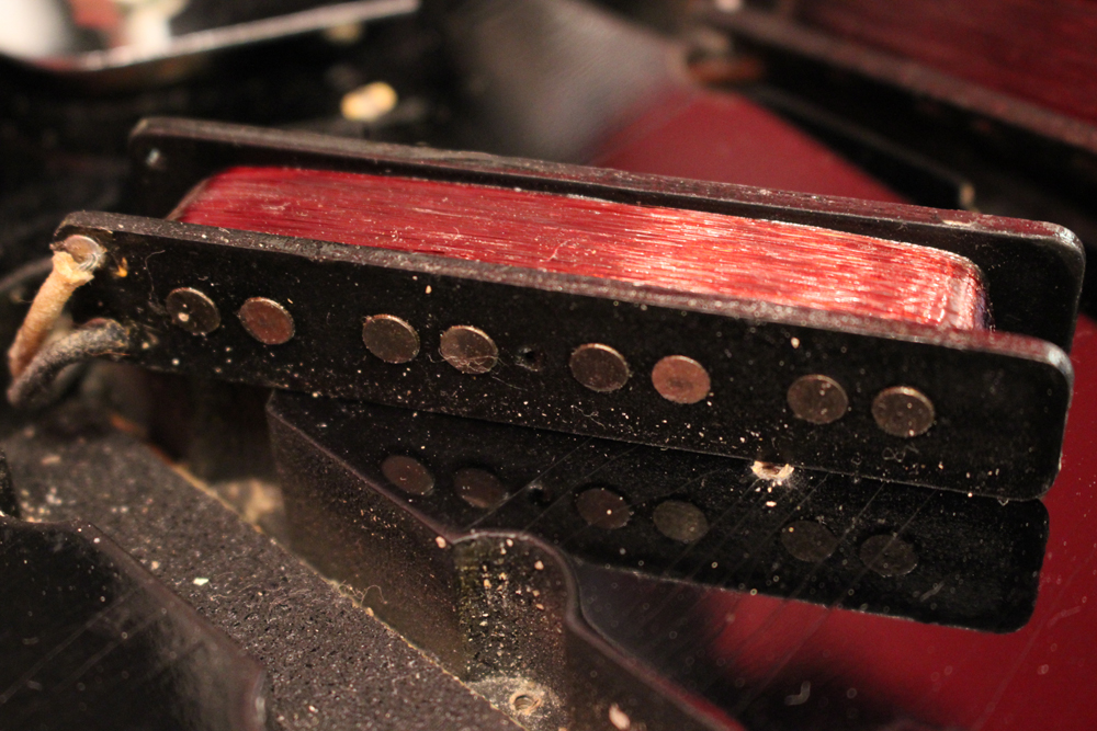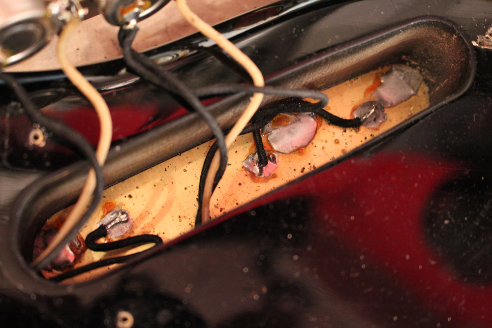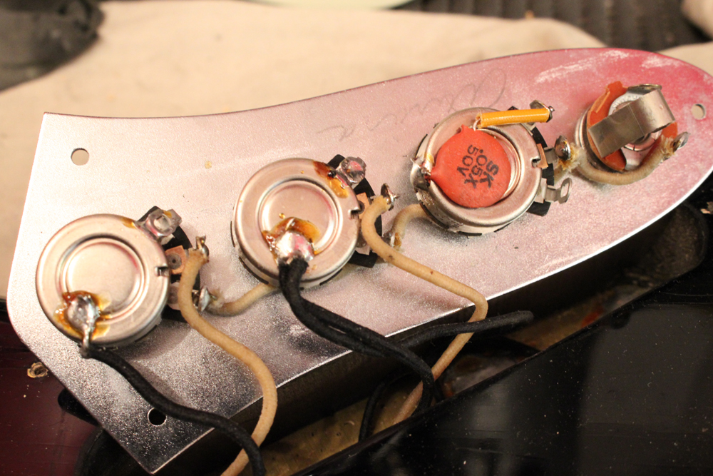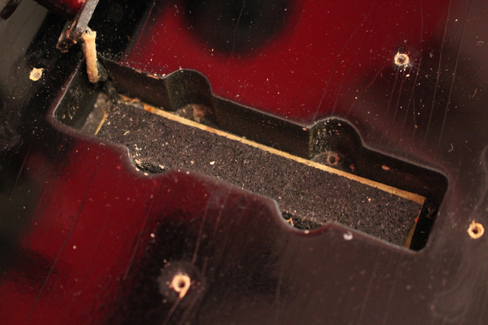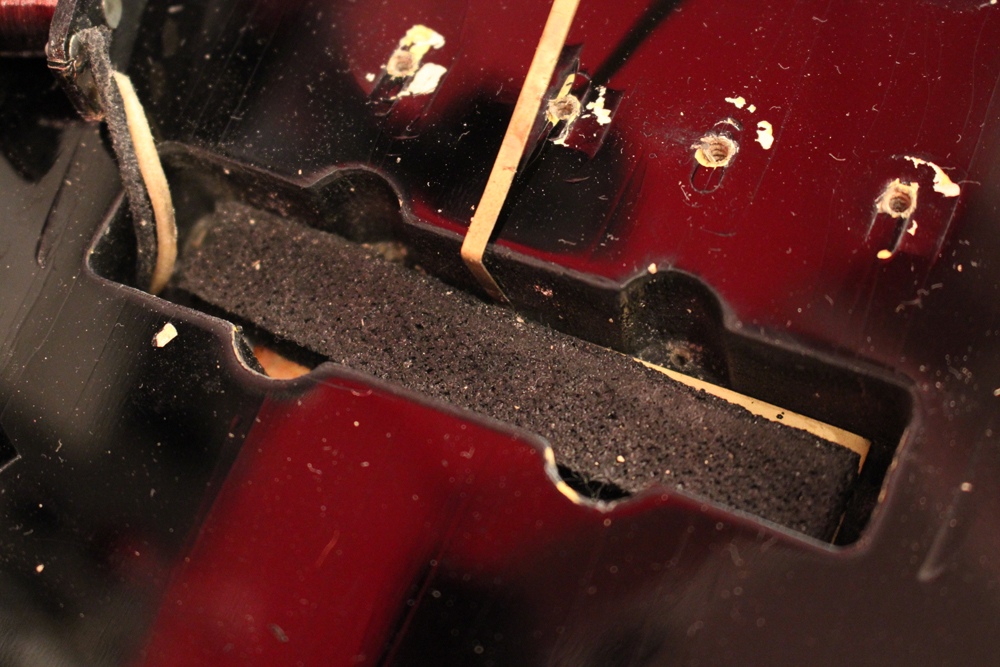 勿論、ハードウエアのクローム & ニッケルメッキにも錆等も無い大変綺麗な状態を留めており、カスタムカラーに採用されたグリーン・カラーのピックガードも綺麗な新品時に近い状態のままで、60年のモデル発売から63年の中期迄採用された、リア・ピックアップとブリッジプレートの間に装着するミュートスポンジ自体も痩せの無い状態で取り付けされていましたその他のパーツも全てオリジナルをキープしており、勿論オール・ストレートで、新品時に付属したストラップとシールドケーブルも付属、ケースも非常に綺麗な状態のオリジナル・ブラウントーレックス・ケースが付属しています