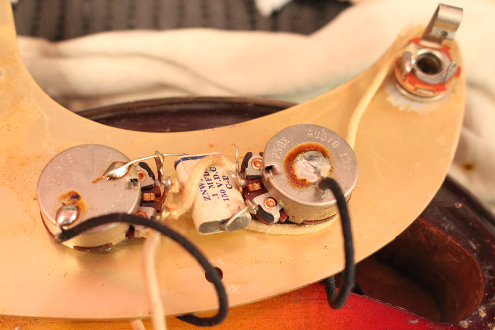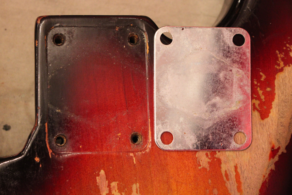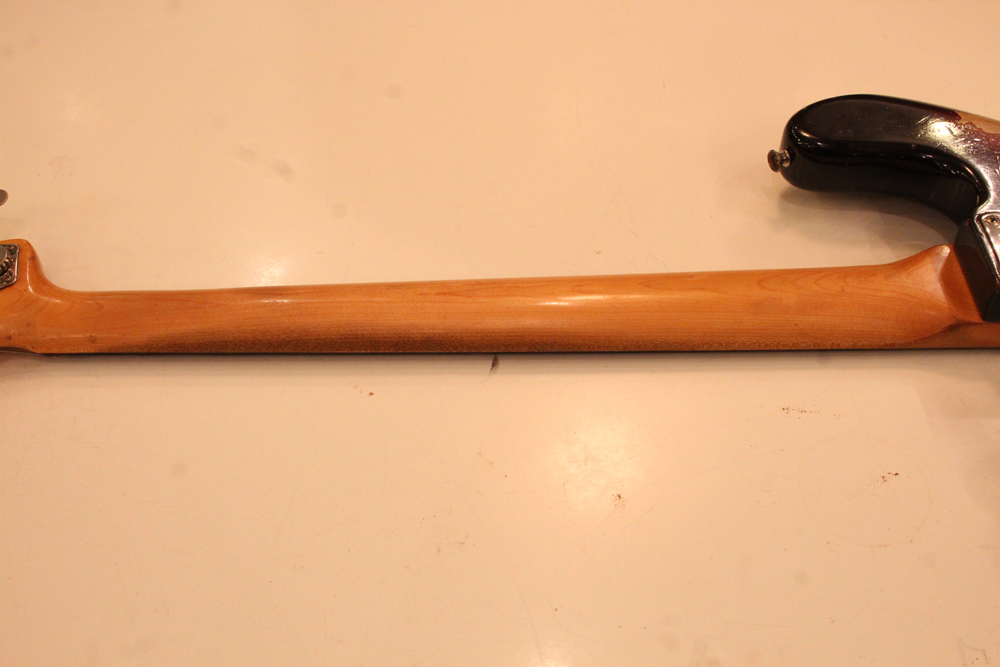 初期のセカンドバージョンには、アルミ材にゴールドのアノダイズド加工が施されたピックガードが使用されていましたが、59年からのメイプル・ワンピースネックから、ローズウッド指板への変更と共に、より高級感のあるセルロイド素材のタートイス・シェルのピックガードに変更されます