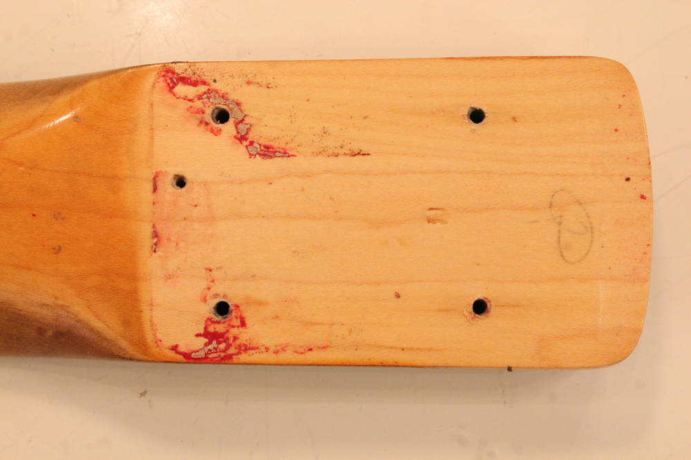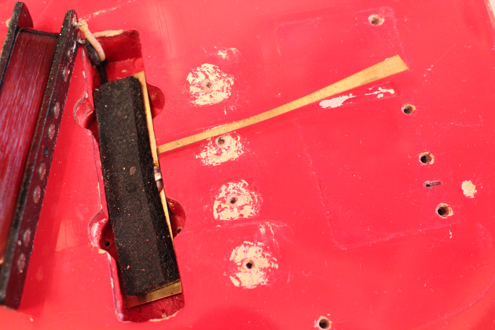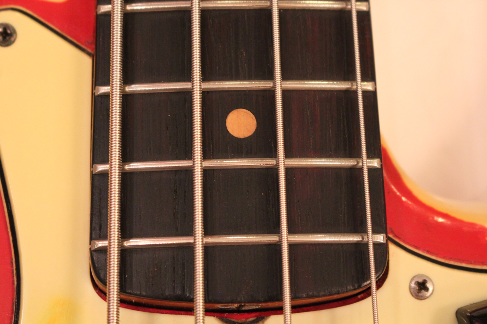 ダコタレッド・フィニッシュ を見つけて来ました!62年の5月から6月にかけた1ヶ月程の期間、スラブネック期の最終期になって、ジャガー、ジャズマスター、ジャズ・ベースの上位機種のカスタム・カラー仕様に導入されたヘッド表面もボディと同色にペイントをする ”マッチング・ヘッドストック“ が採用され、69年頃まで継続されました