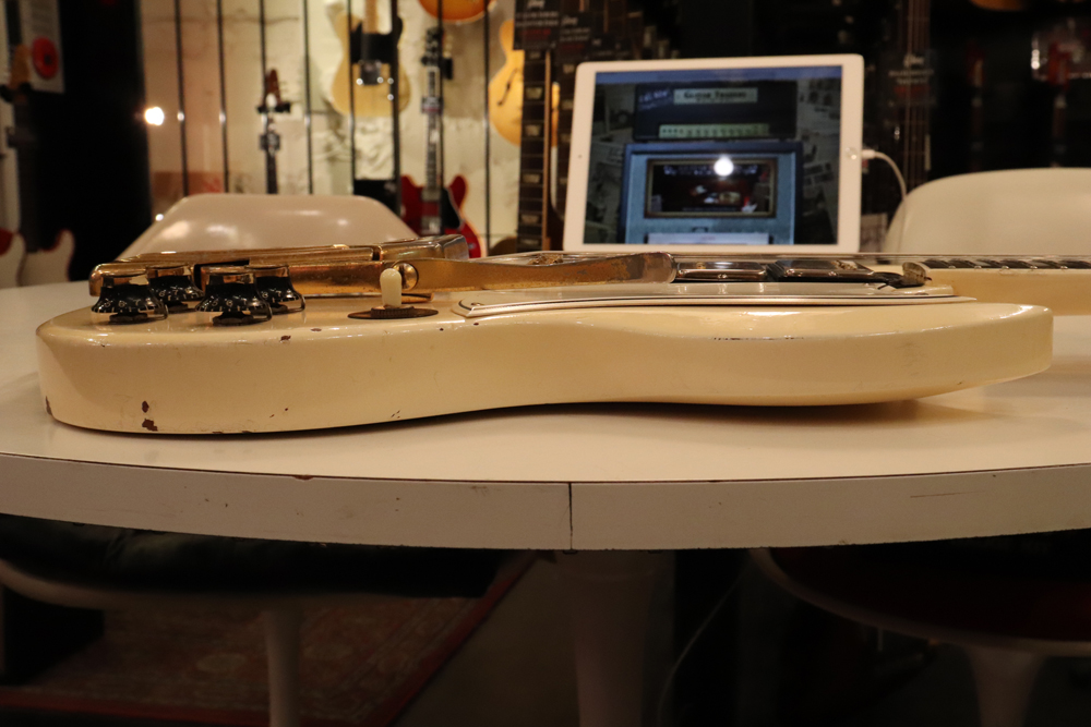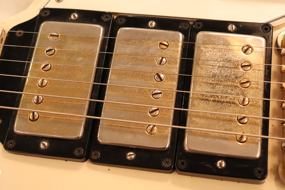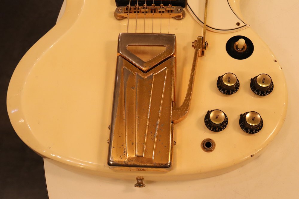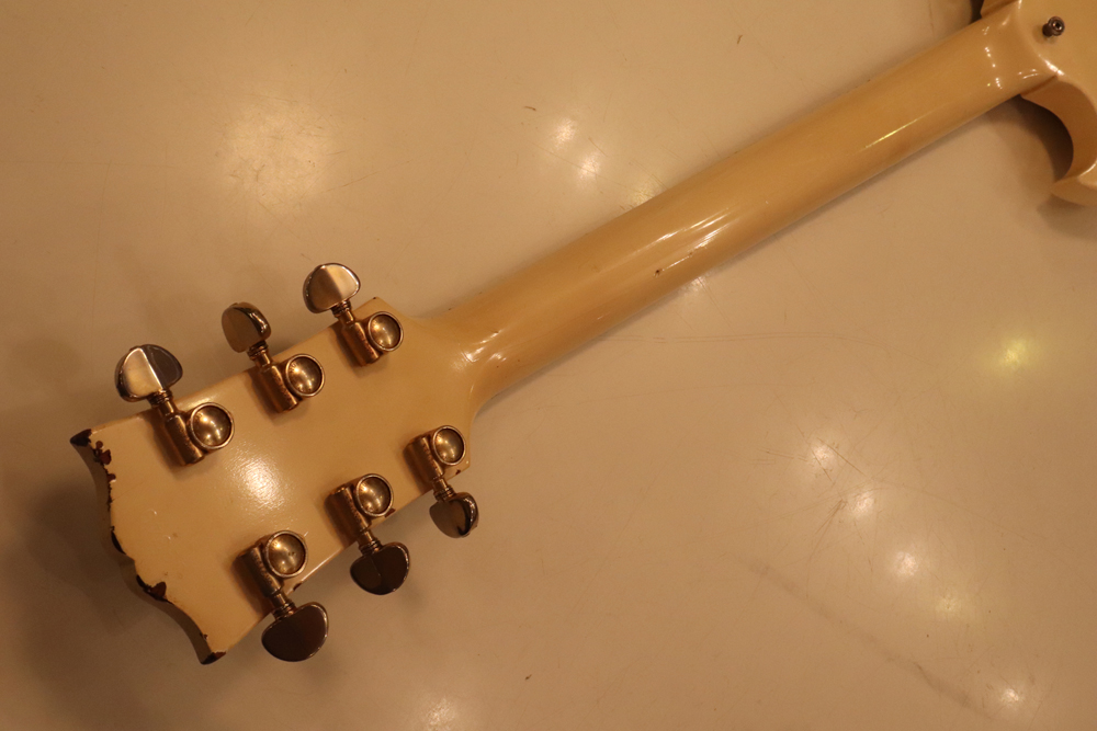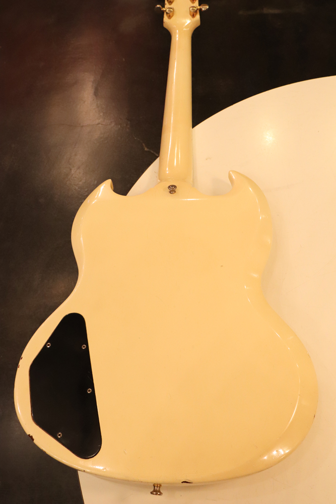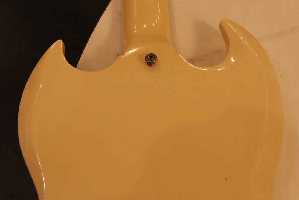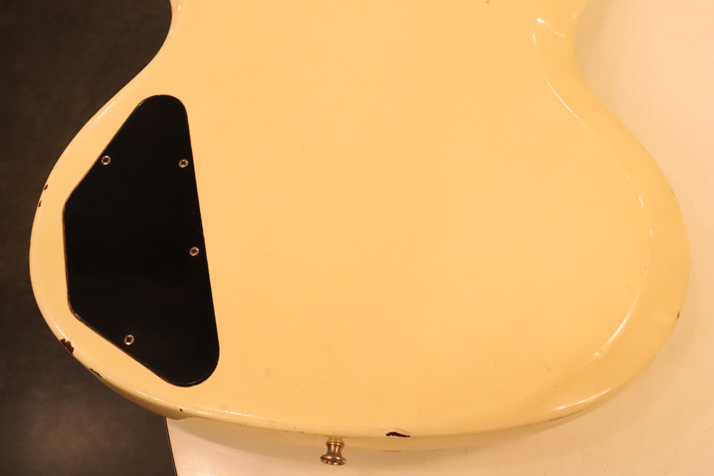今回の機体は、同じ61年迄作られていた、レス・ポール・カスタムと同様に、トラスロッド・カバーにモデルネームの刻印が入り、フロントピックアップネックエンドの間には、SG・スタンダードと同じ、ブラック・ワン・プライの目隠しプレートが取付けされた過渡期仕様の機体です外観は、些少のウエアはございますが、全体的には状態の良いエクセレント・プラス・コンディション!