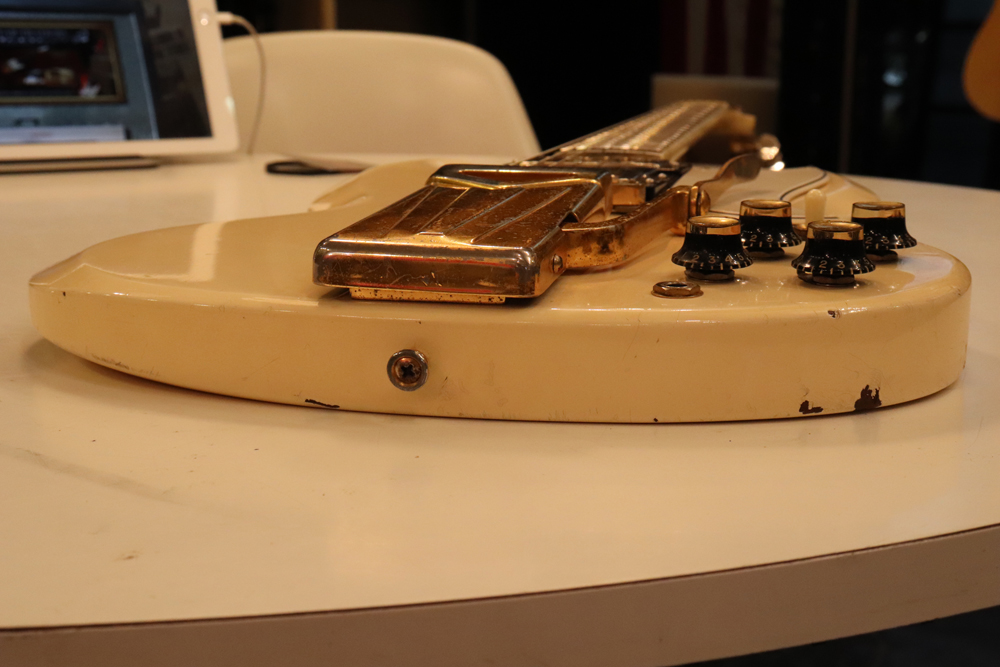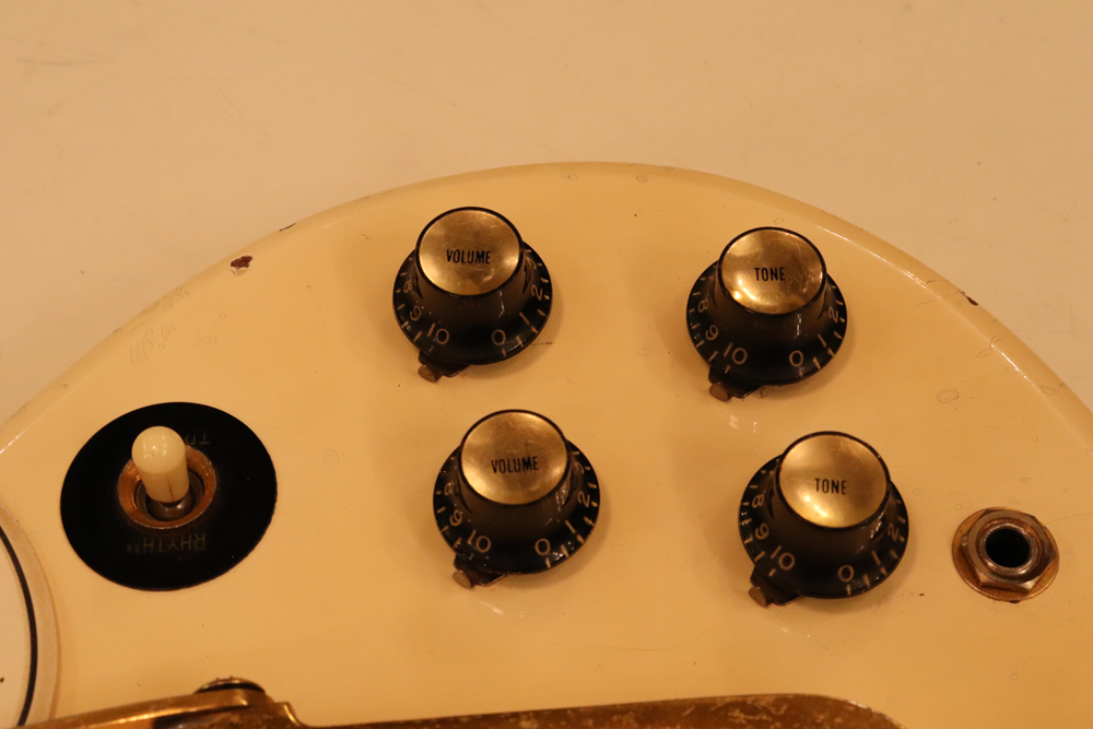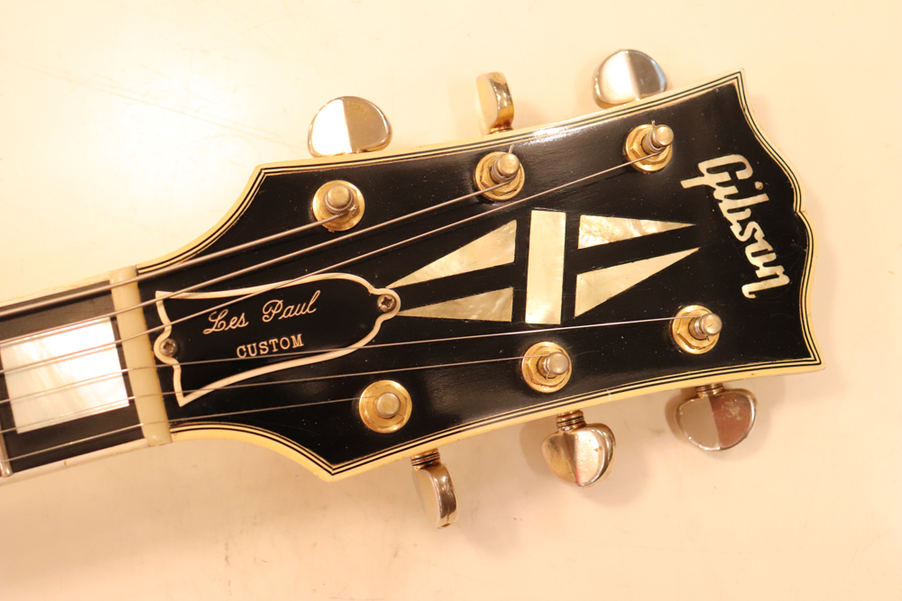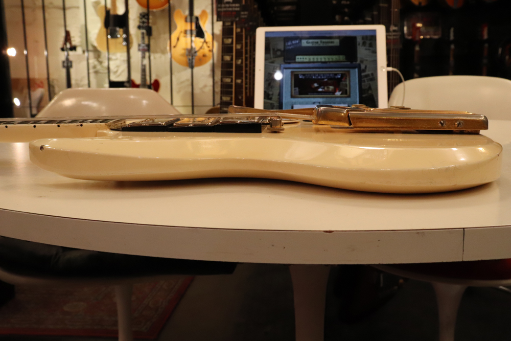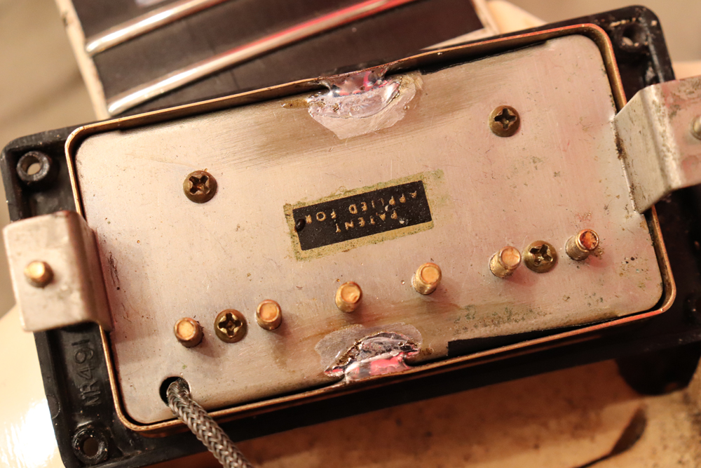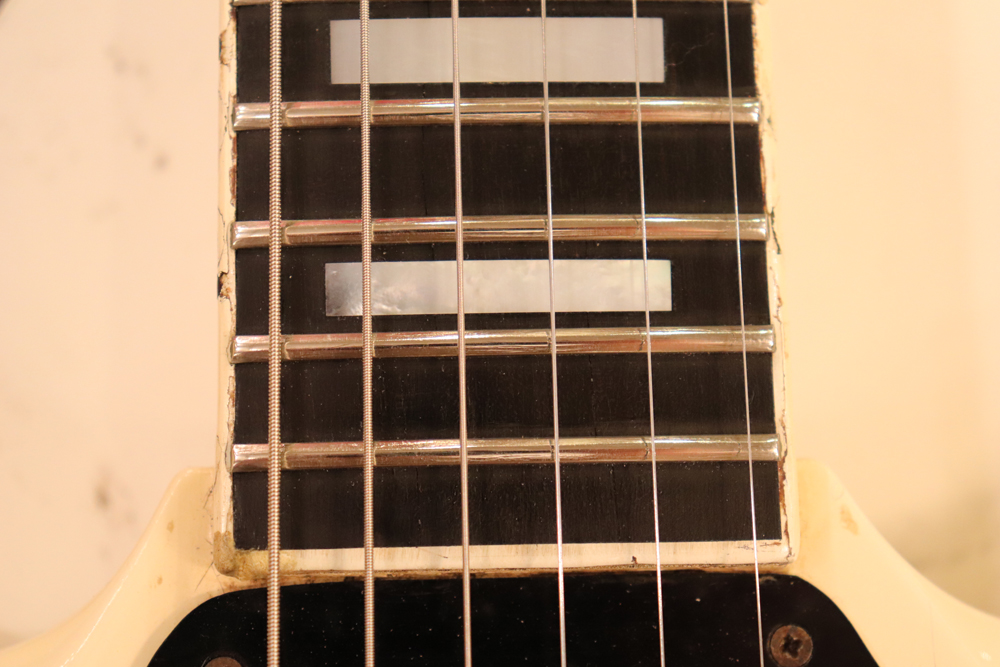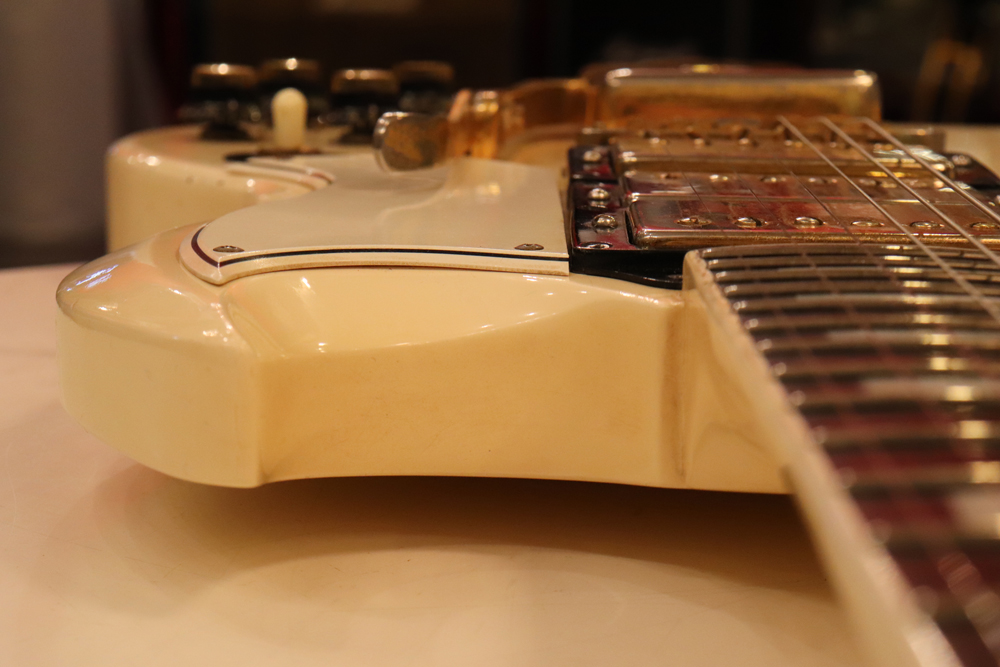 今回の機体は、同じ61年迄作られていた、レス・ポール・カスタムと同様に、トラスロッド・カバーにモデルネームの刻印が入り、フロントピックアップネックエンドの間には、SG・スタンダードと同じ、ブラック・ワン・プライの目隠しプレートが取付けされた過渡期仕様の機体です外観は、些少のウエアはございますが、全体的には状態の良いエクセレント・プラス・コンディション!