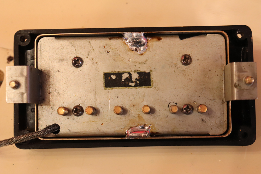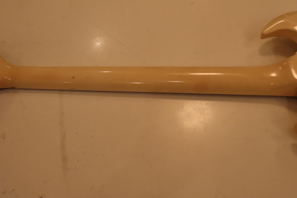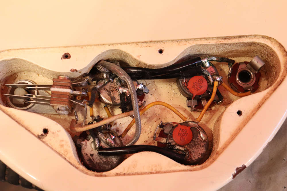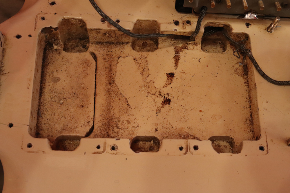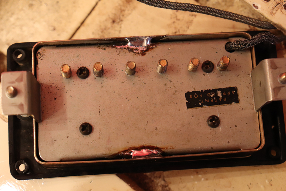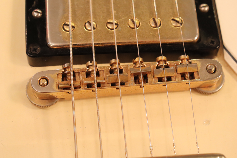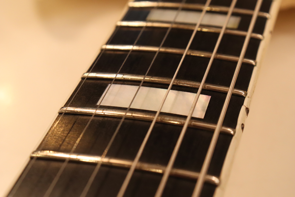 今回の機体は、同じ61年迄作られていた、レス・ポール・カスタムと同様に、トラスロッド・カバーにモデルネームの刻印が入り、フロントピックアップネックエンドの間には、SG・スタンダードと同じ、ブラック・ワン・プライの目隠しプレートが取付けされた過渡期仕様の機体です外観は、些少のウエアはございますが、全体的には状態の良いエクセレント・プラス・コンディション!