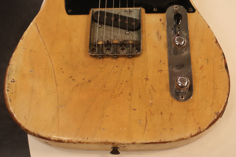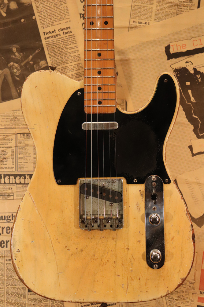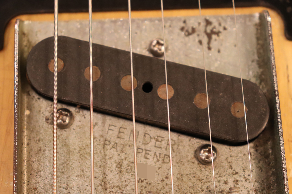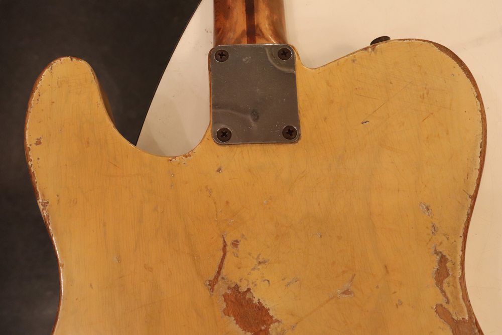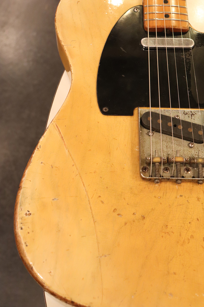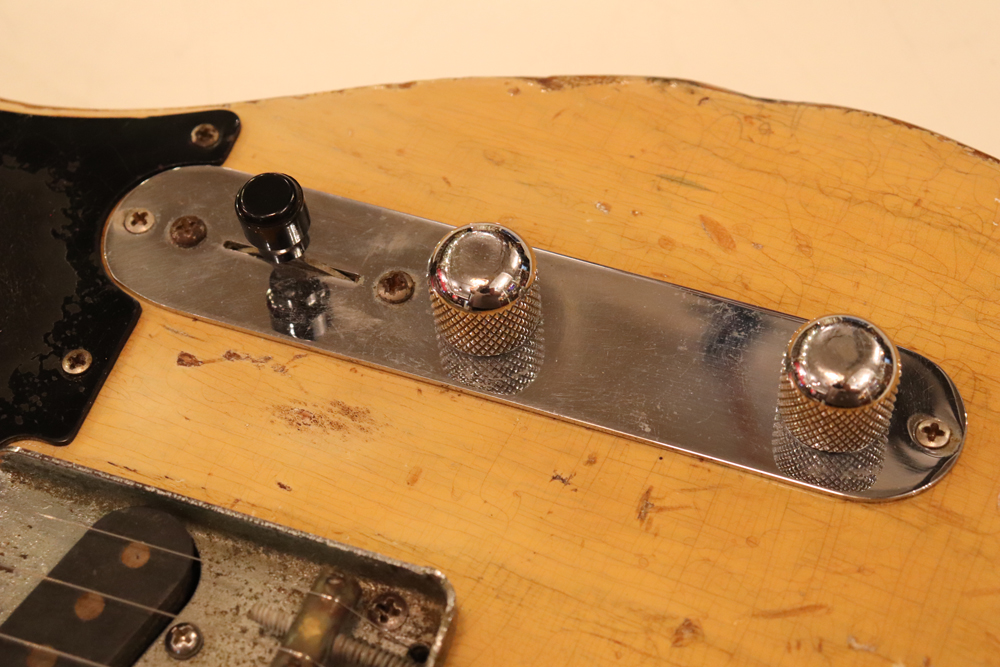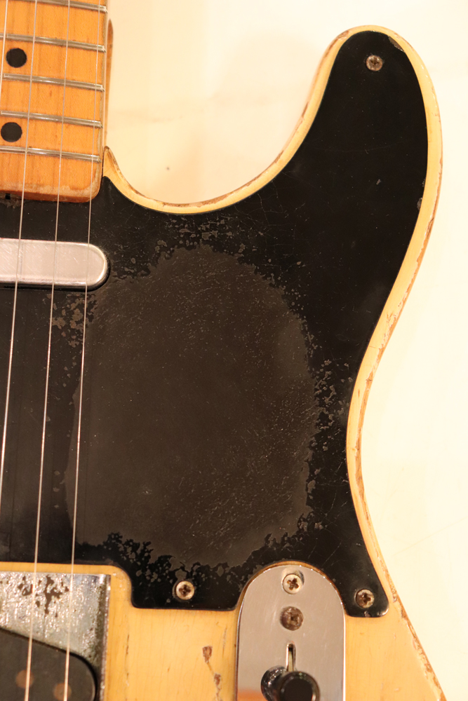 テレキャスター仕様にモディファイされており、セレクターもカレント配線にセットアップされていますサウンドは、同時期のテレキャスターよりもストレートでパンチの効いたエスカイヤー・トーンを持つリアピックアップと合わせ、フロントとのミックス時にはメロウなカッティングも得意としており、オリジナルのブラック・ガード期のみが奏でるグッドトーン!