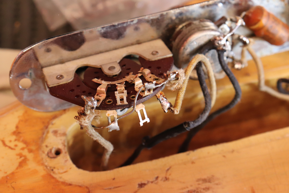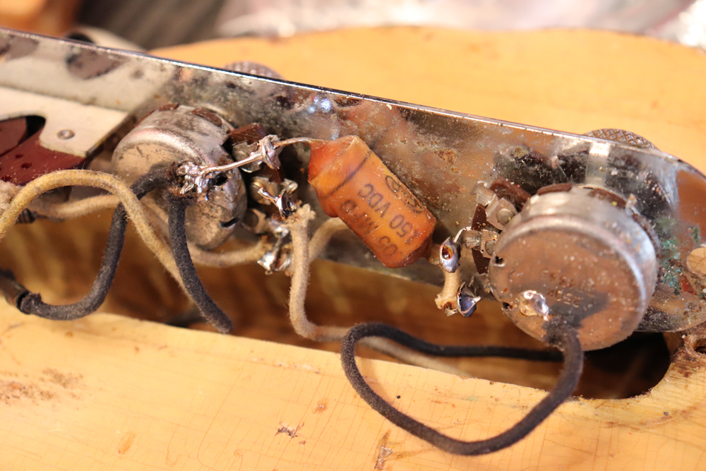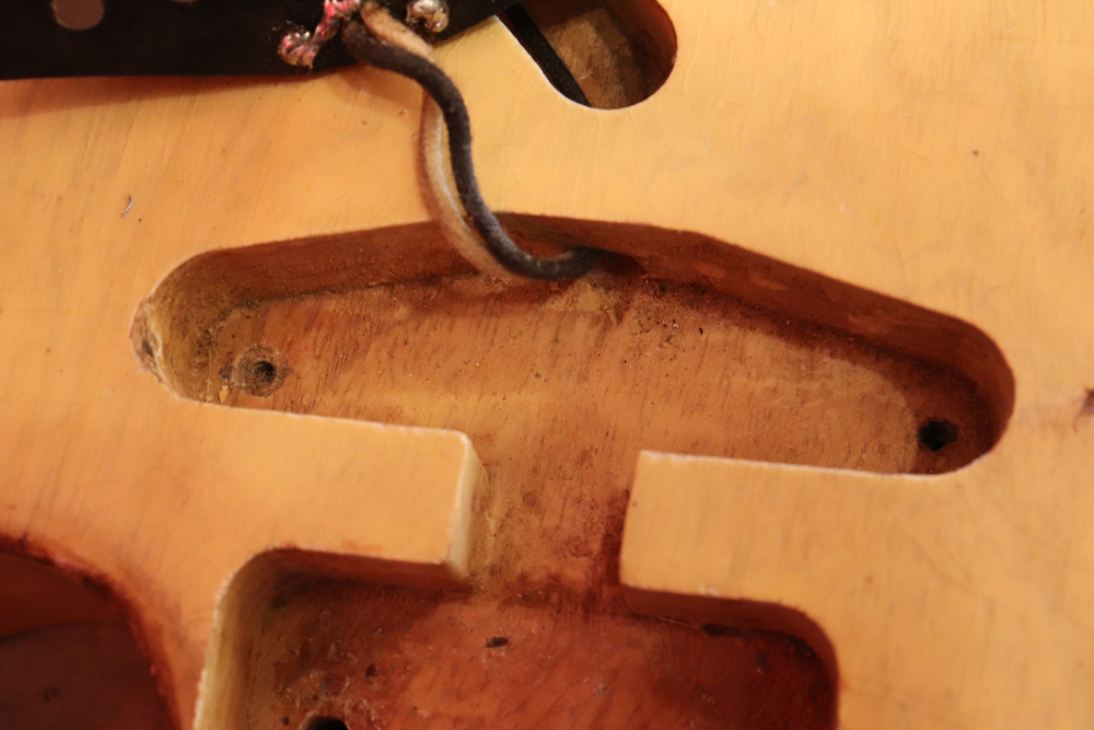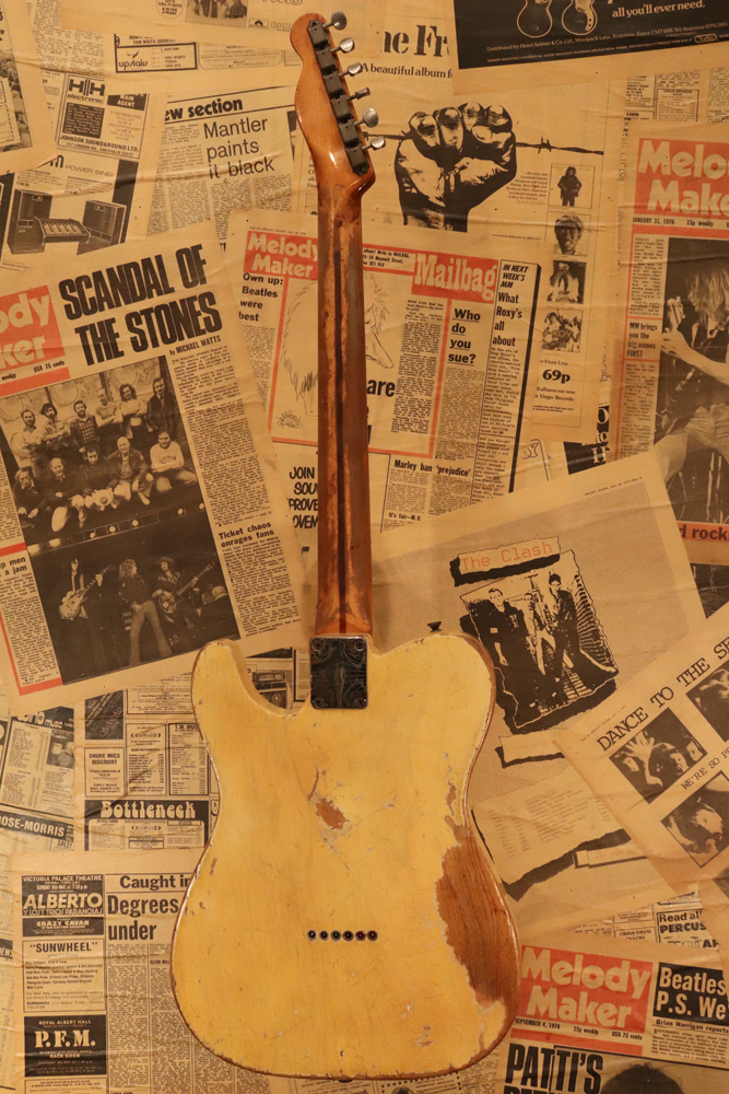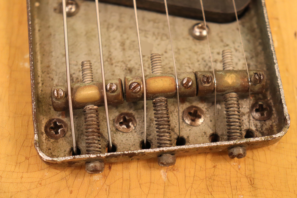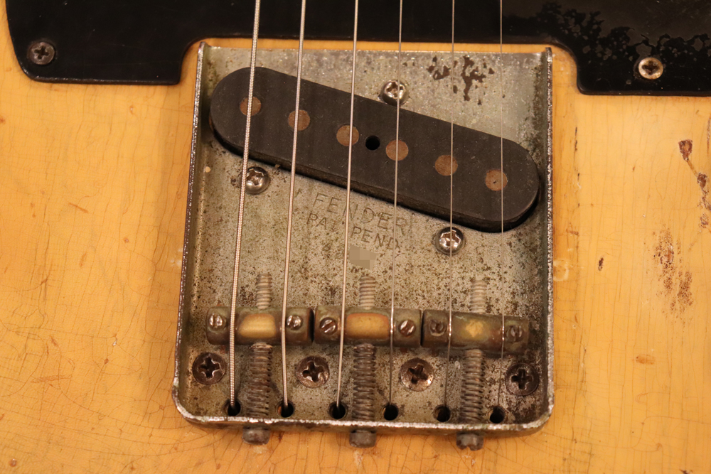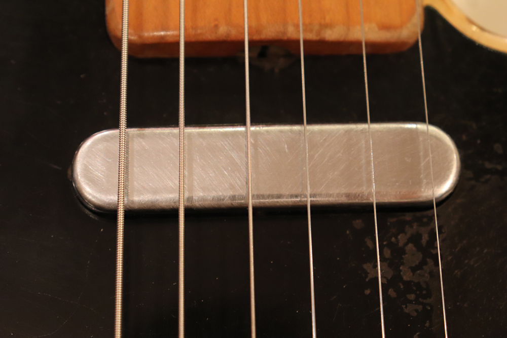 テレキャスター仕様にモディファイされており、セレクターもカレント配線にセットアップされていますサウンドは、同時期のテレキャスターよりもストレートでパンチの効いたエスカイヤー・トーンを持つリアピックアップと合わせ、フロントとのミックス時にはメロウなカッティングも得意としており、オリジナルのブラック・ガード期のみが奏でるグッドトーン!