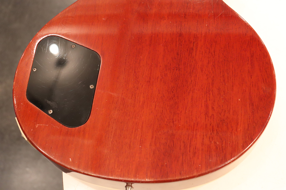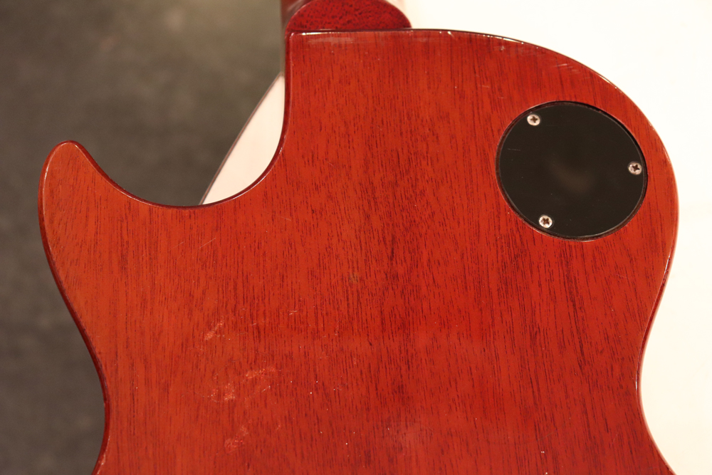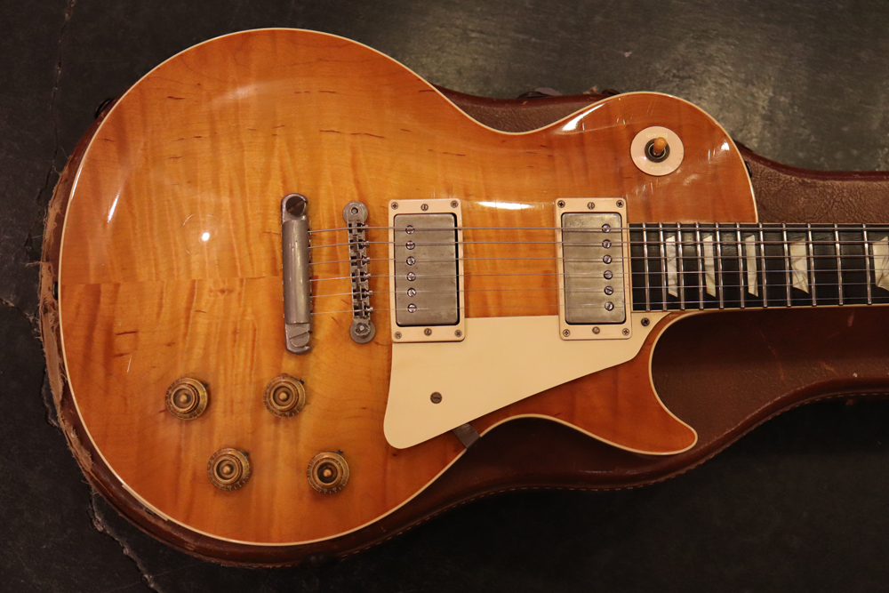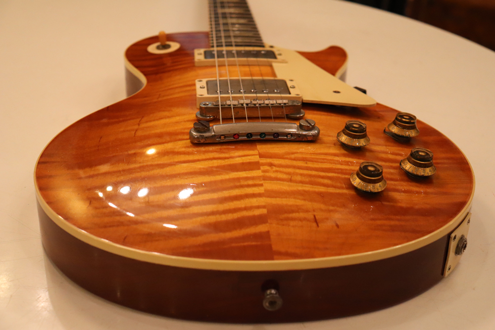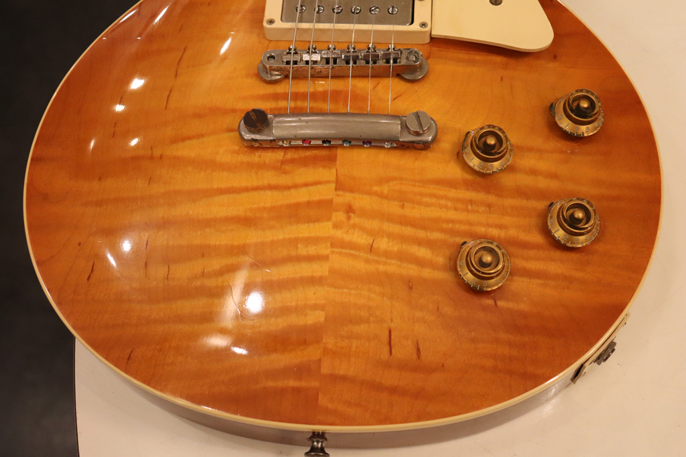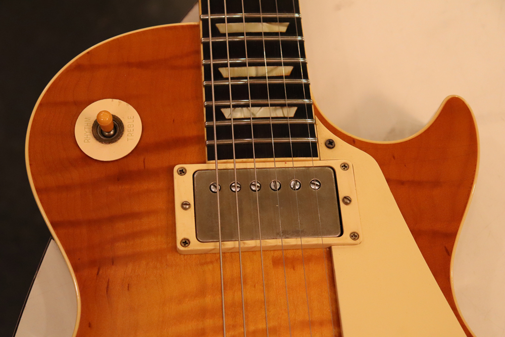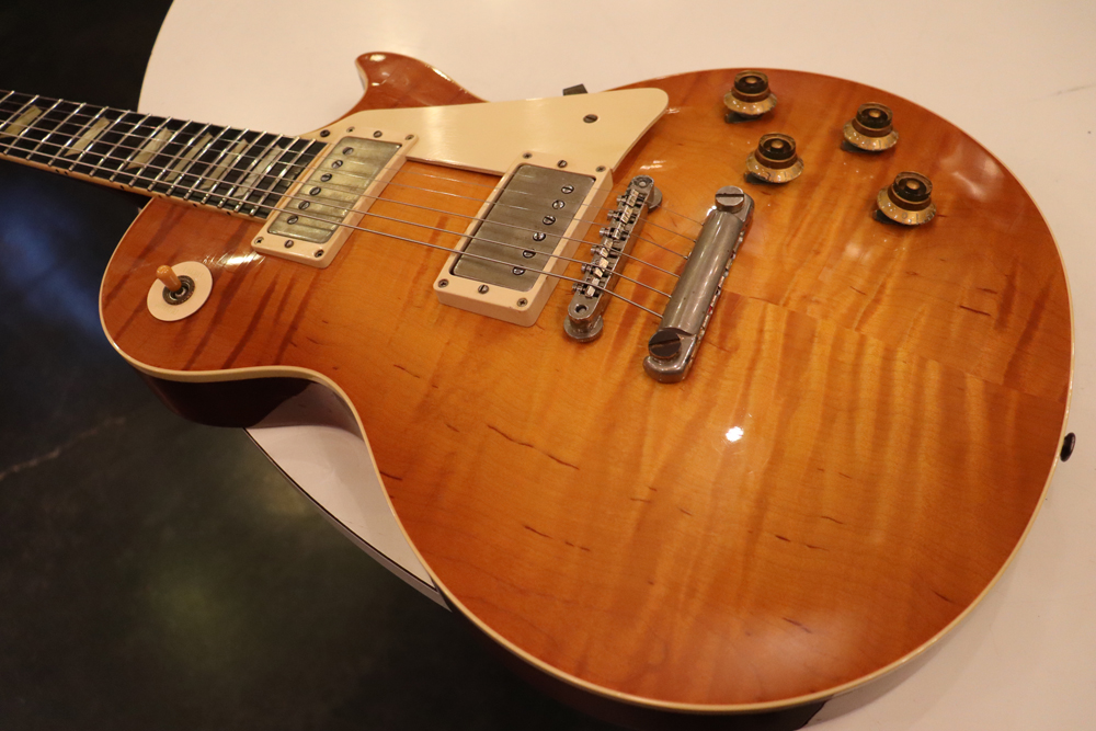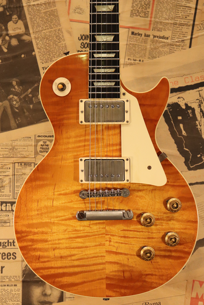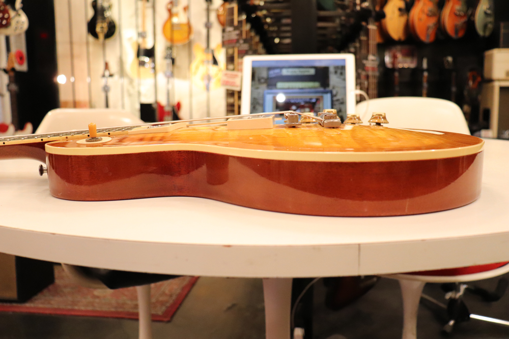 53年頃のゴールド・トップ・スタンダードをベースに、センターシームのワイド・フレームがクールな木目のフィギュアード・メイプル・トップにリトップが施された、59年バースト・レス・ポール・スタイルにコンバージョンが施されています