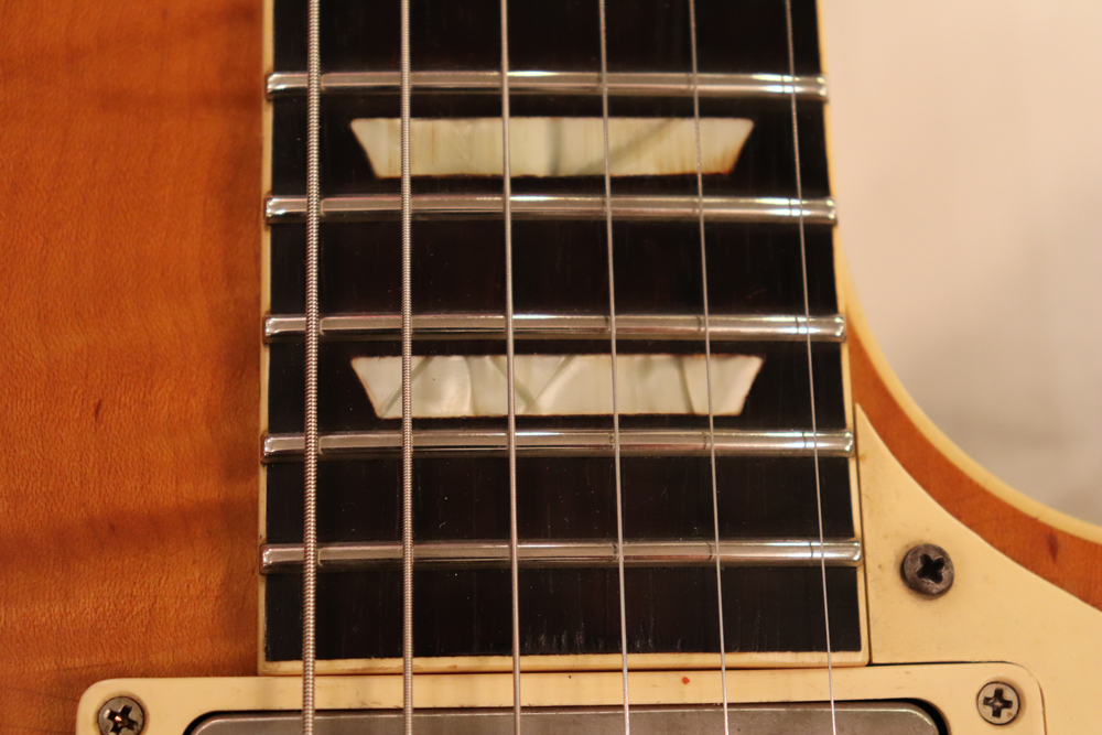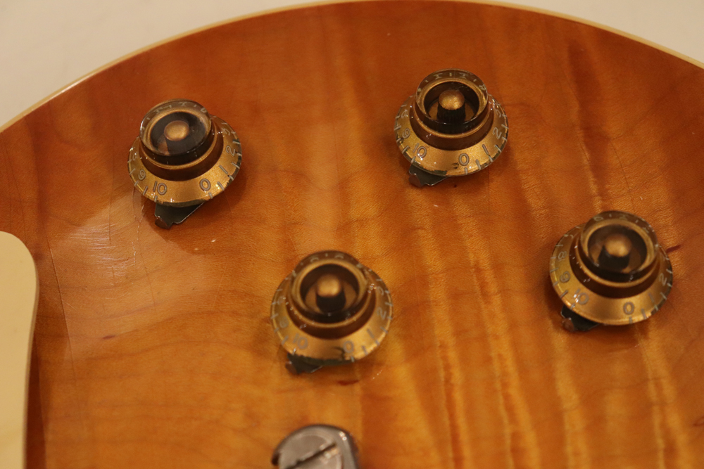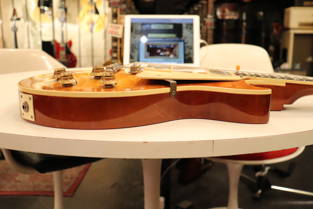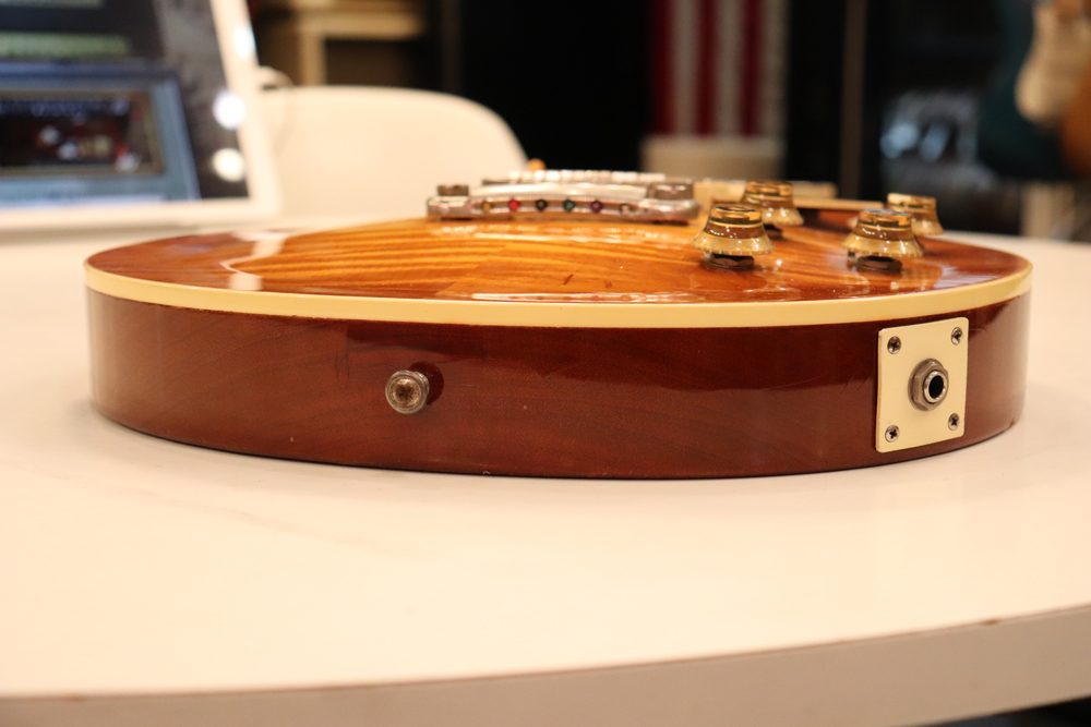 勿論、フィニッシュにはニトロセルロース・ラッカーが使用され、ボディバックやネック、ボディトップのバースト部の着色には、オリジナル・バースト同様に“アリニン・ダイ”が使用されていますまた、リトップからフィニッシュ迄、全てのモディファイは、USAにて、ヴィンテージのレストアやコンバージョン・レス・ポールの製作を専門に行なっている“Jam City Guitars“ の”Jim Weyandt 氏が製作しています