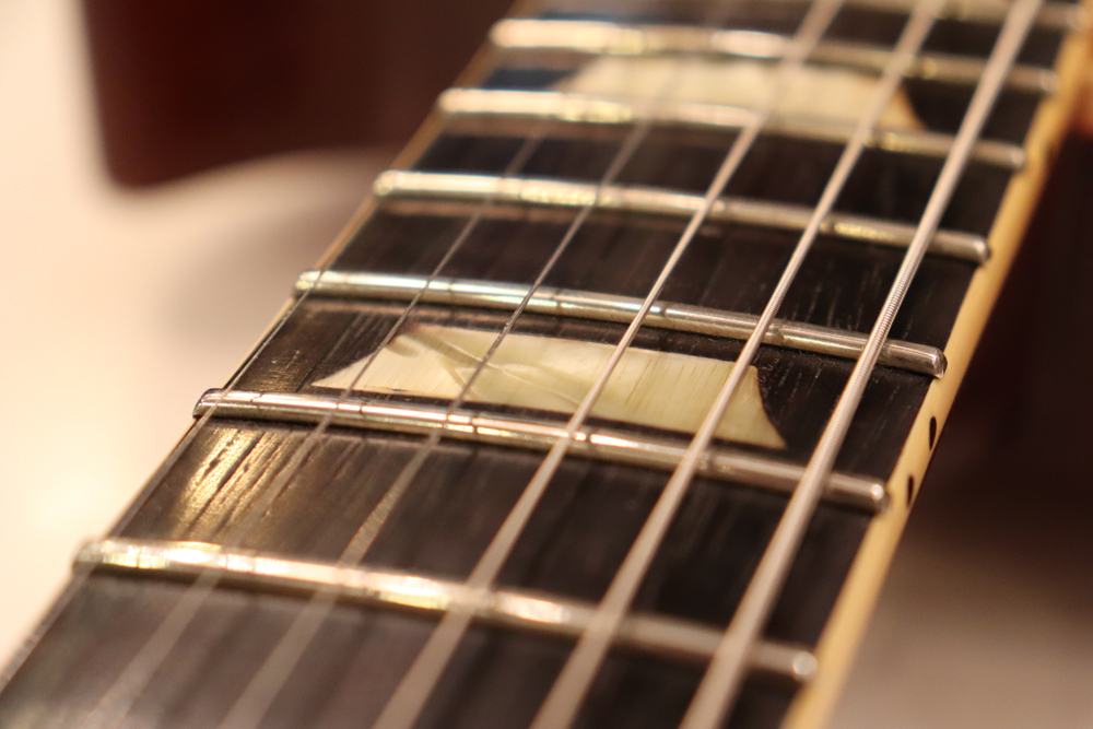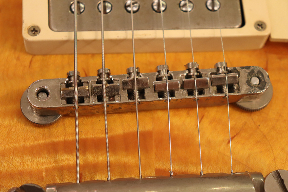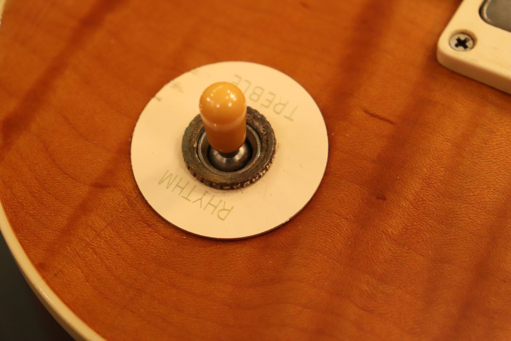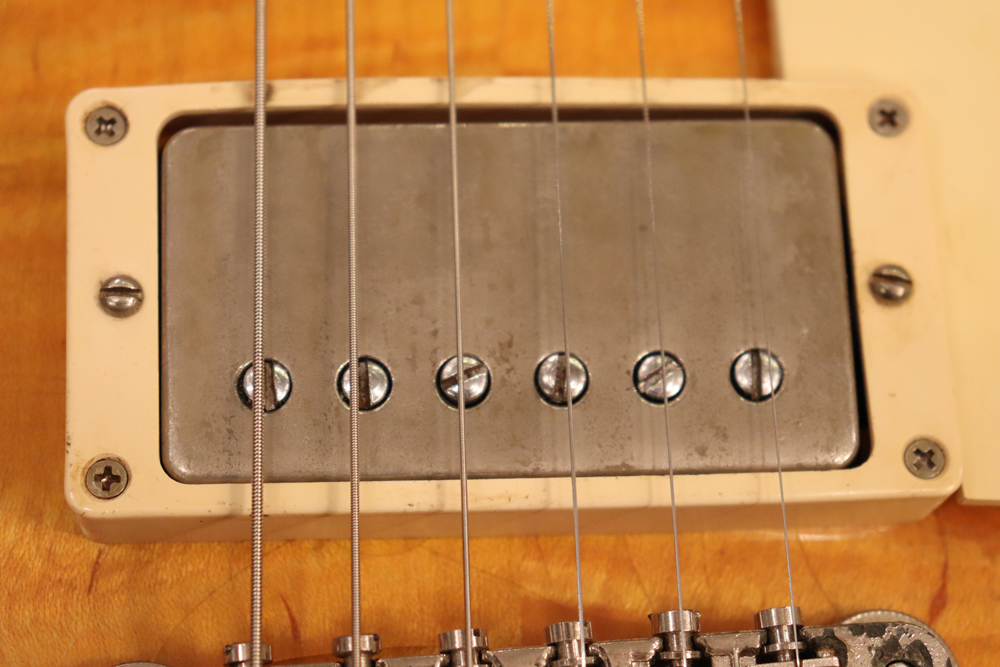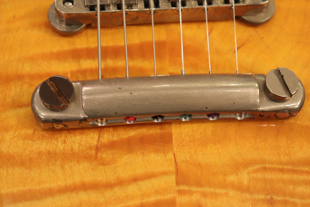 その他、ピックアップ・リングとピックアップ・カバーは、ギブソン社のカラマズー・ファクトリーのピックアップ・ワインダーを使用して製作している、P.A.F・ピックアップのレプリカの製作で著名な“Throbak”製の“M-69”リングとフロント・ピックアップ・カバーを当店にてエイジングを施してあります その他、ジャプレートとセレクターリングはバースト仕様レタリングのリプレイスを、テールピースはDMC製のエイジドパーツが採用されています