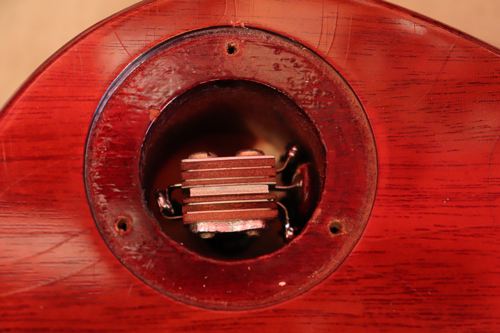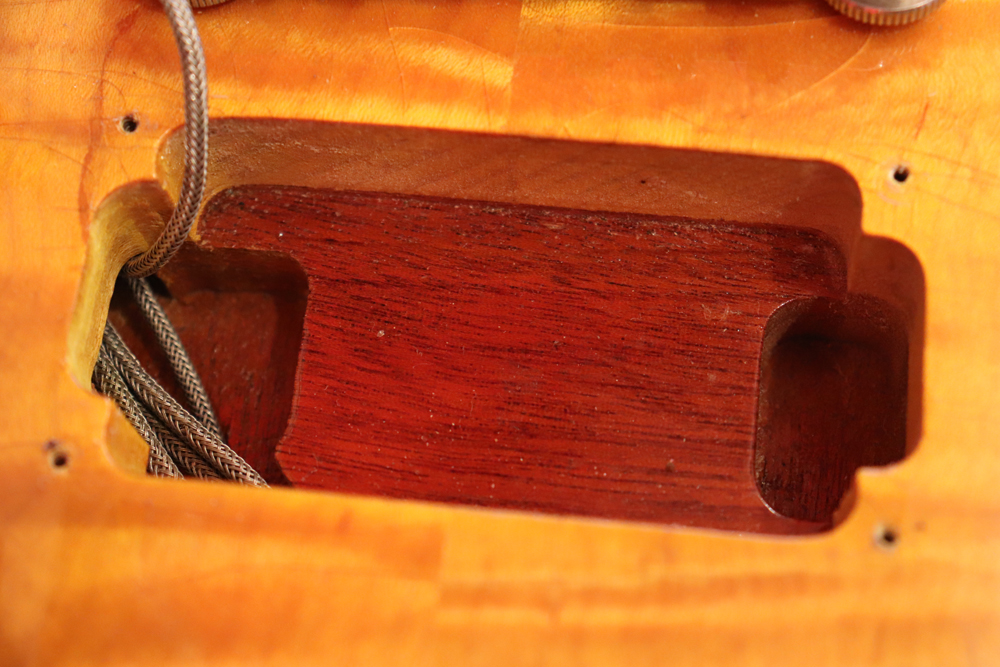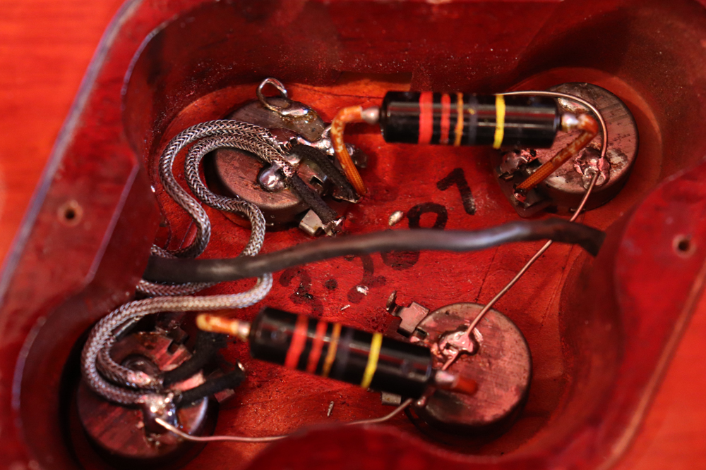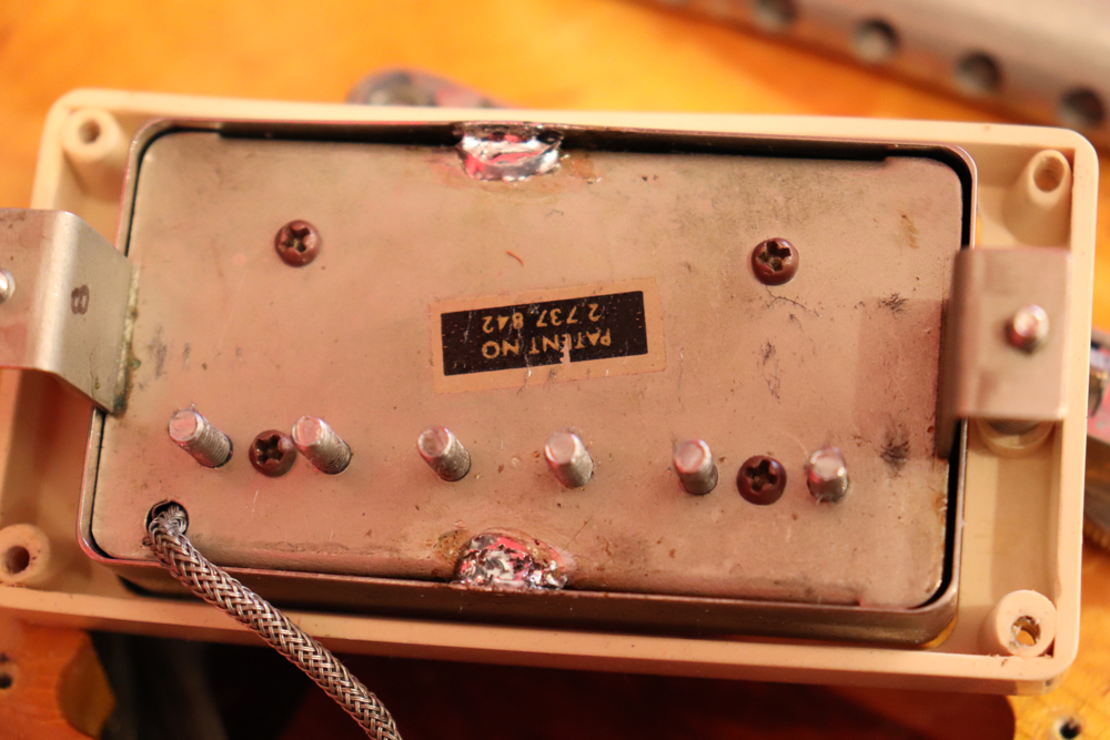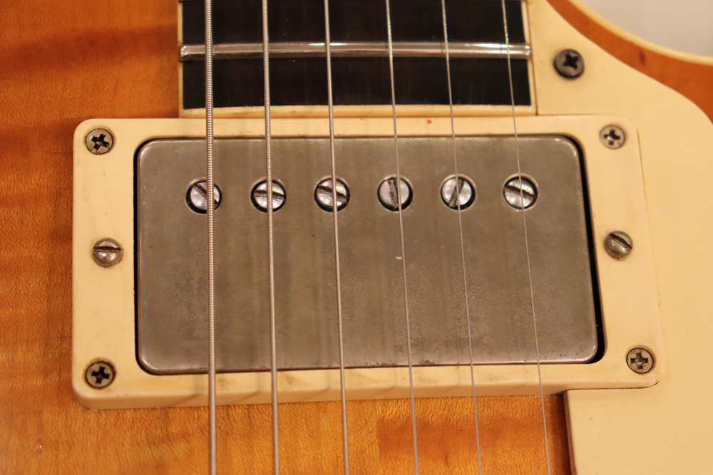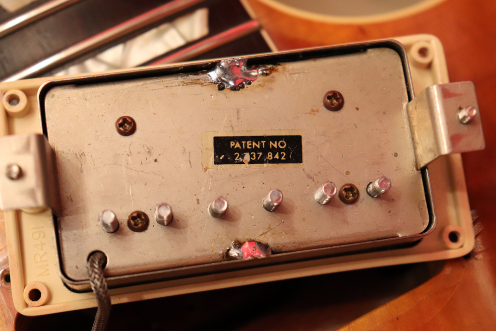 彼の施すコンバージョン・・ワークは多岐に渡りますが、50年代のスタンダード・ベースの場合には、元々のP-90のピックアップキャビティをホンジュラスマホガニーで丁寧に埋め直してから、ハムバッカーのルーティングを施すと言う、非常に手間の掛かる方法を取っており、フィニッシュもニトロセルロース・ラッカーは元より、ウエザーチェッキングも刃物で入れる方法では無く、温度管理により長い時間を掛けて再現している為、製作出来る本数は非常に限られており、コンバージョン・レス・ポールの中でも人気も高く、入手が困難なモデルですピックアップは、フロント、リア共に、60年代前半のナンバード・P.A.F・ピックアップに、50年代のロング・マグネットを装着した、コンバージョン・P.A.F・ピックアップを搭載しています ハーネスを含むポット類も58年デイトの物を、キャパシターもヴィンテージのスプラグ・バンブルビー・キャパシタを搭載しています