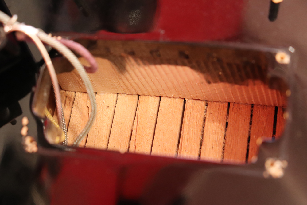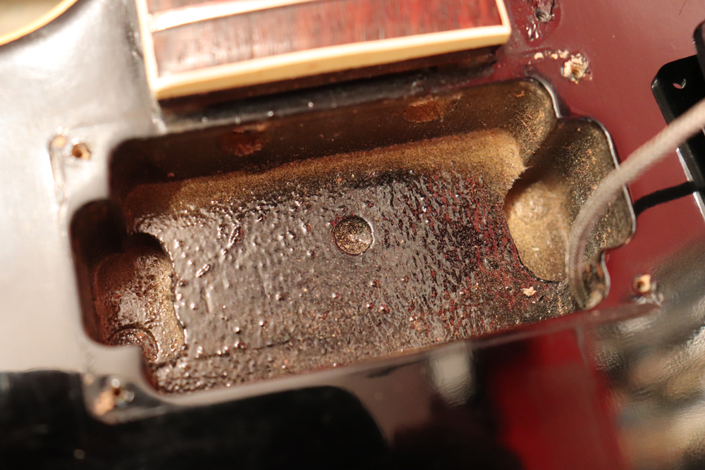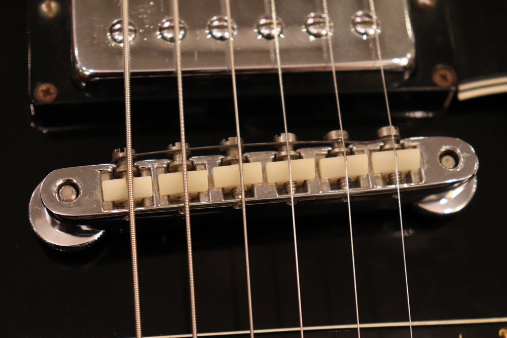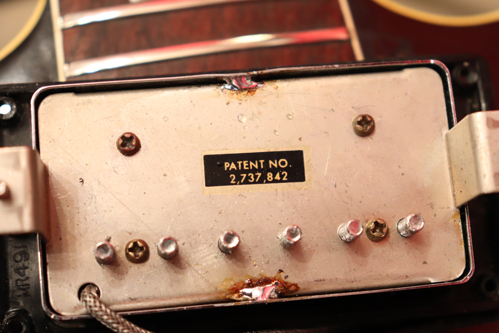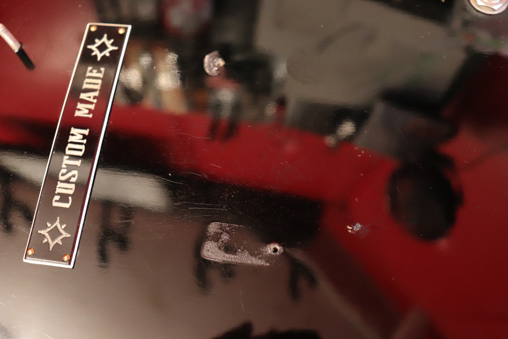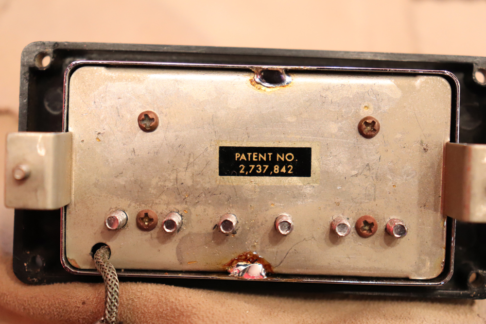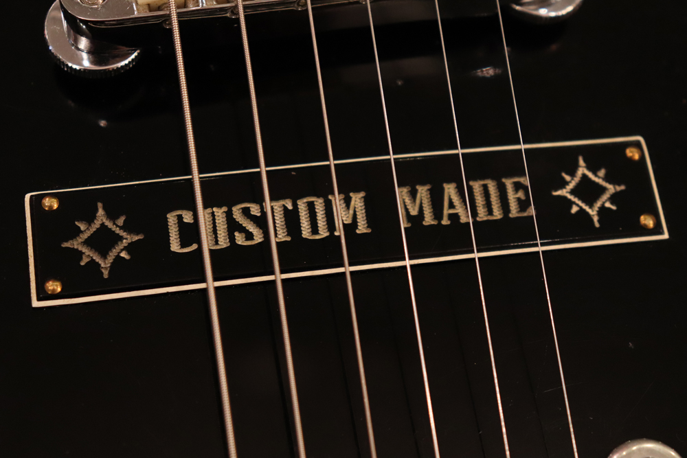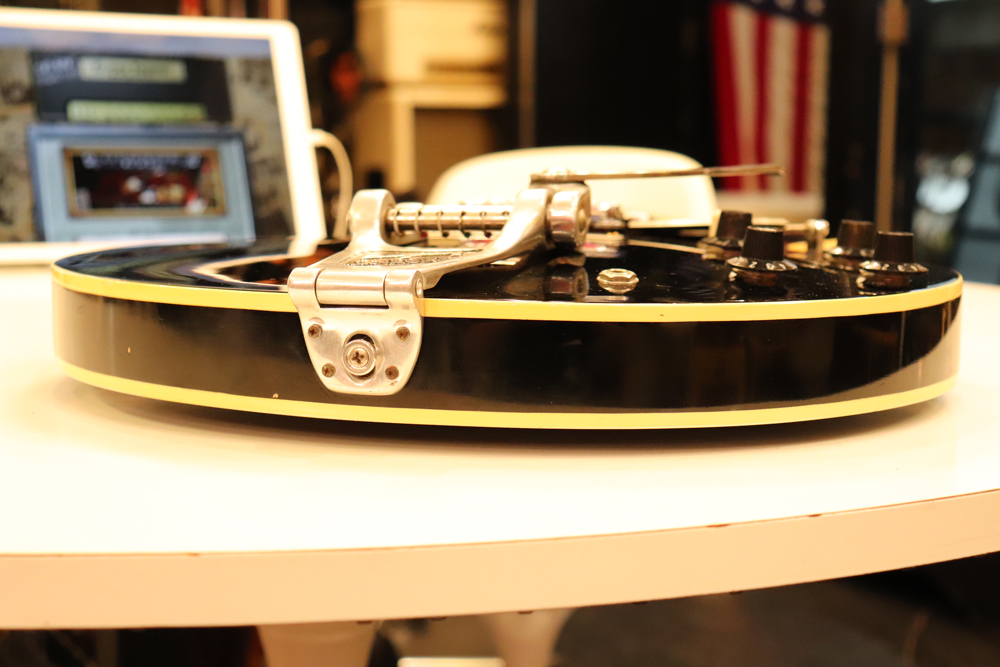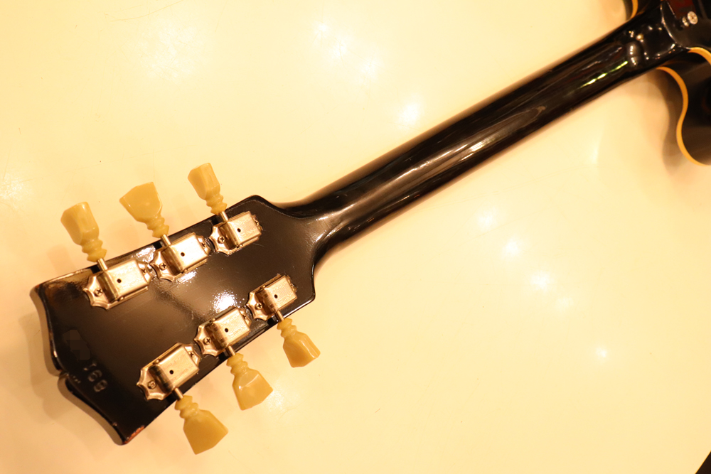 トラスロッド・カバーの刻印からも判る様に、ブラック・カラーを含めカスタム・オーダーで製作されたファクトリー・ビグスビー・モデルですが、一時期ストップ・テールピース仕様で使用されていた様で、現在はスタッドアンカー部にヴィンテージ60年代に使用されてる、“Custom Made“ プレートが装着されています アンカー自体は残っていますので、再びストップ・テールピース仕様としてご使用も可能です