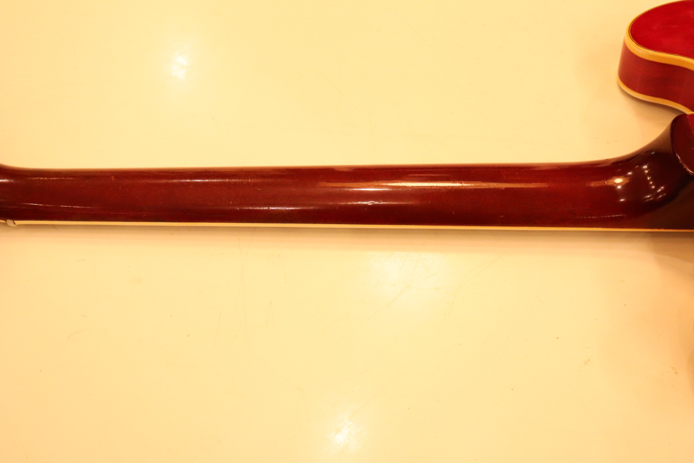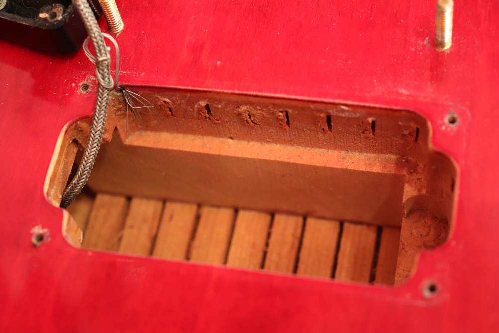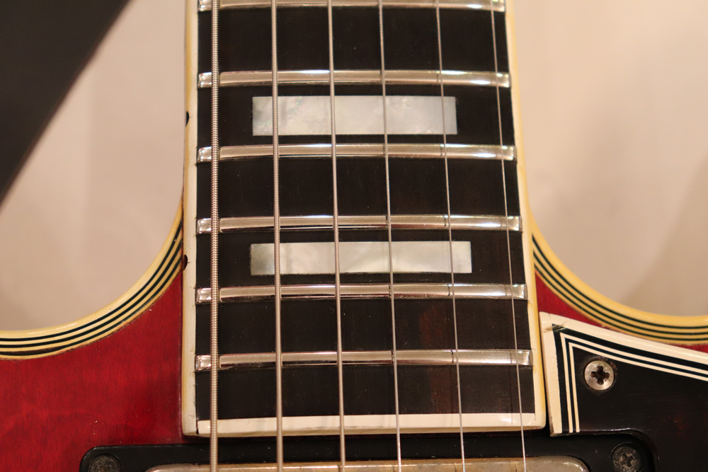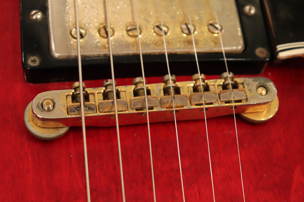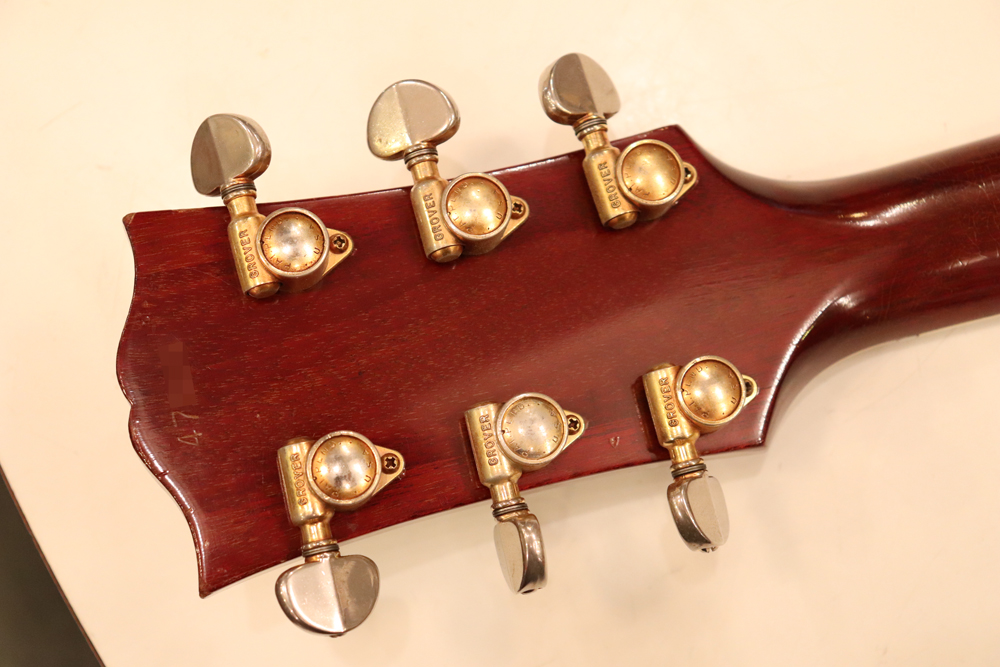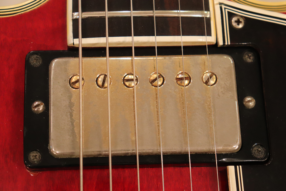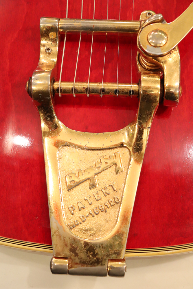 内容は、この時期のスタンダードなトレモロユニットは“SG”シリーズにも採用された“サイドウエィ・トレモロ“ですが、現状は同時期60年代製の“Bigsby B7G“が搭載されています