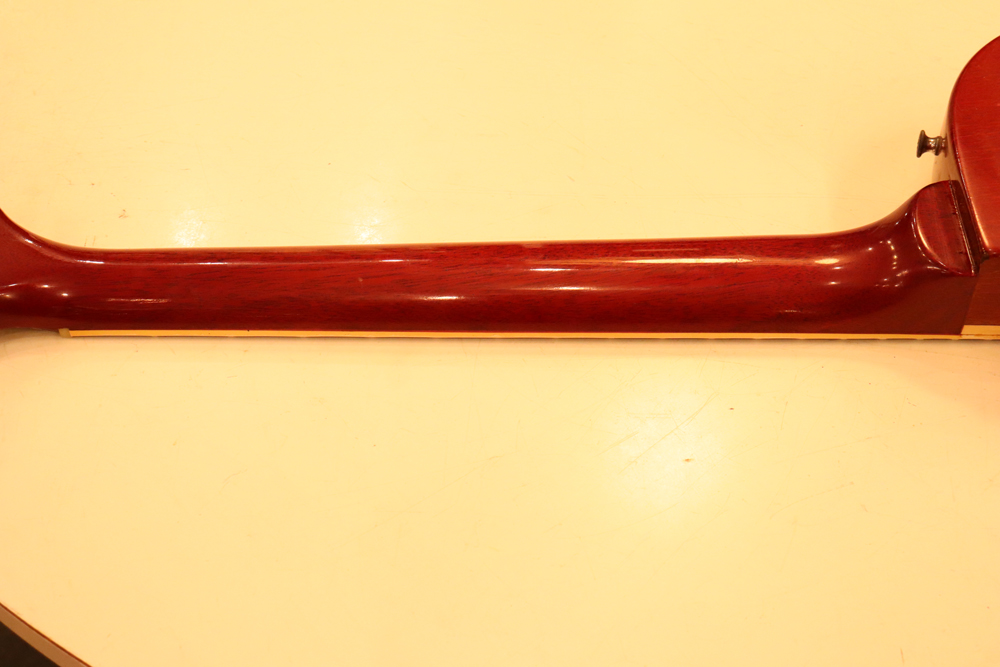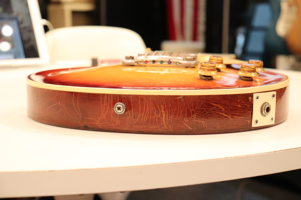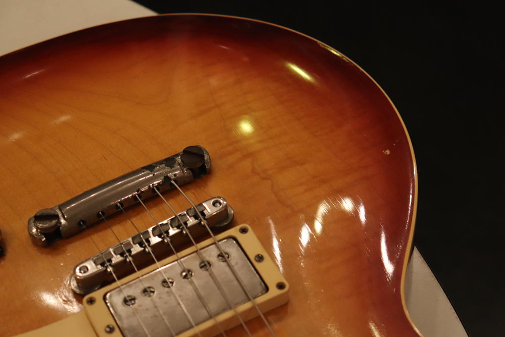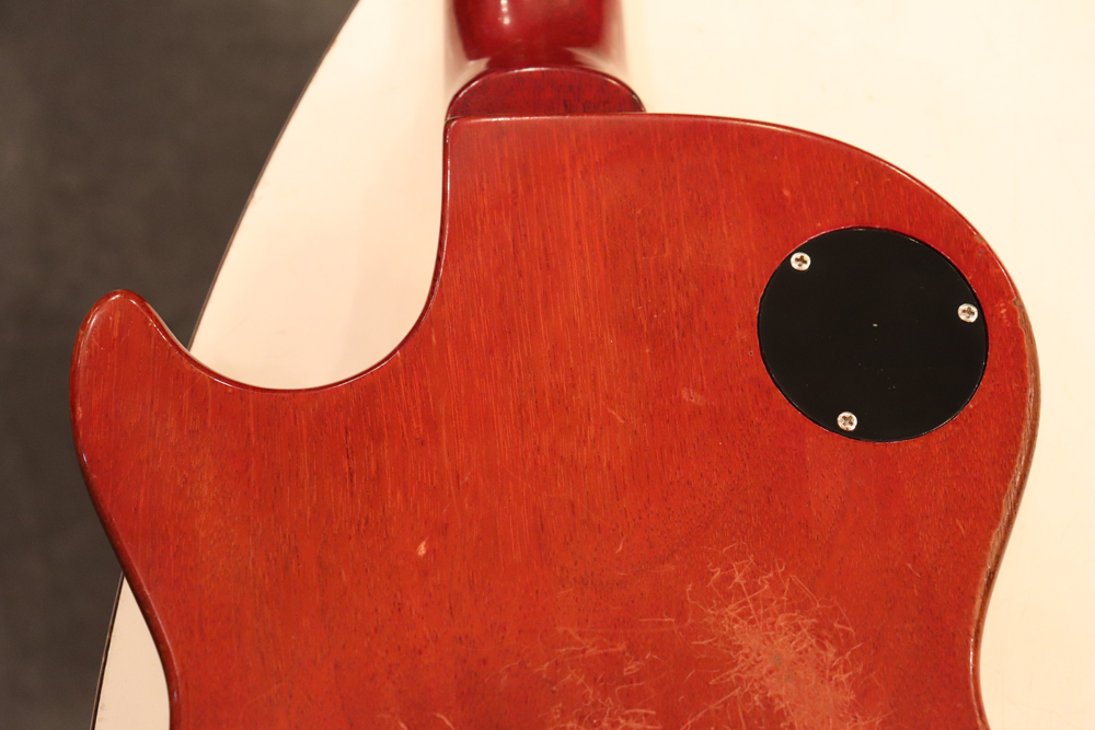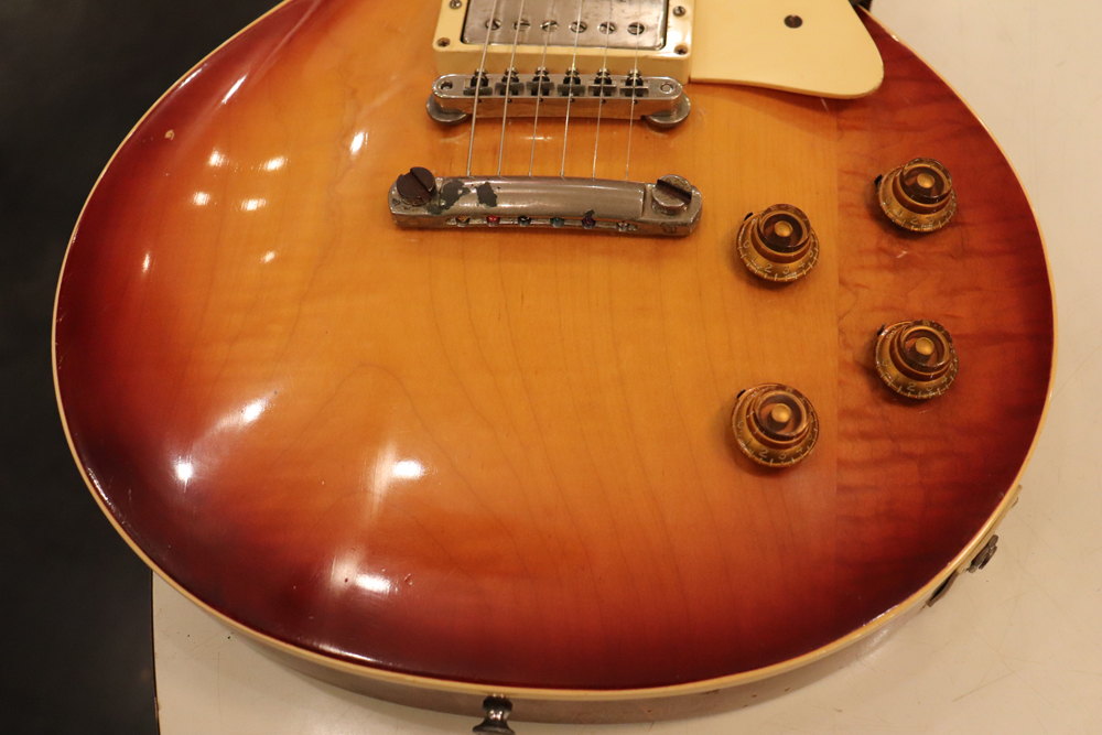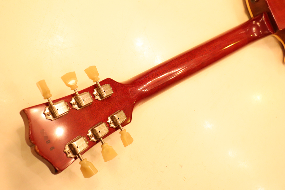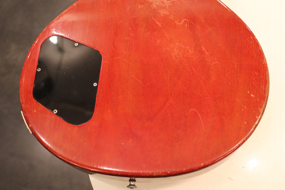 フィニッシュも59年バーストスタイルのチェーリーがフェイドした、ティーバースト系のカラーにリフィニッシュが施され、ボディバックも同様に、バースト・チェリーカラーにフィニッシュされており、既にフェイディングが進みオリジナル・バーストの様なルックスです またリフィニッシュから既にかなりの時間が経過していますので、オリジナル・フィニッシュと同様なウエザーチェックや経年変化が進んでおります