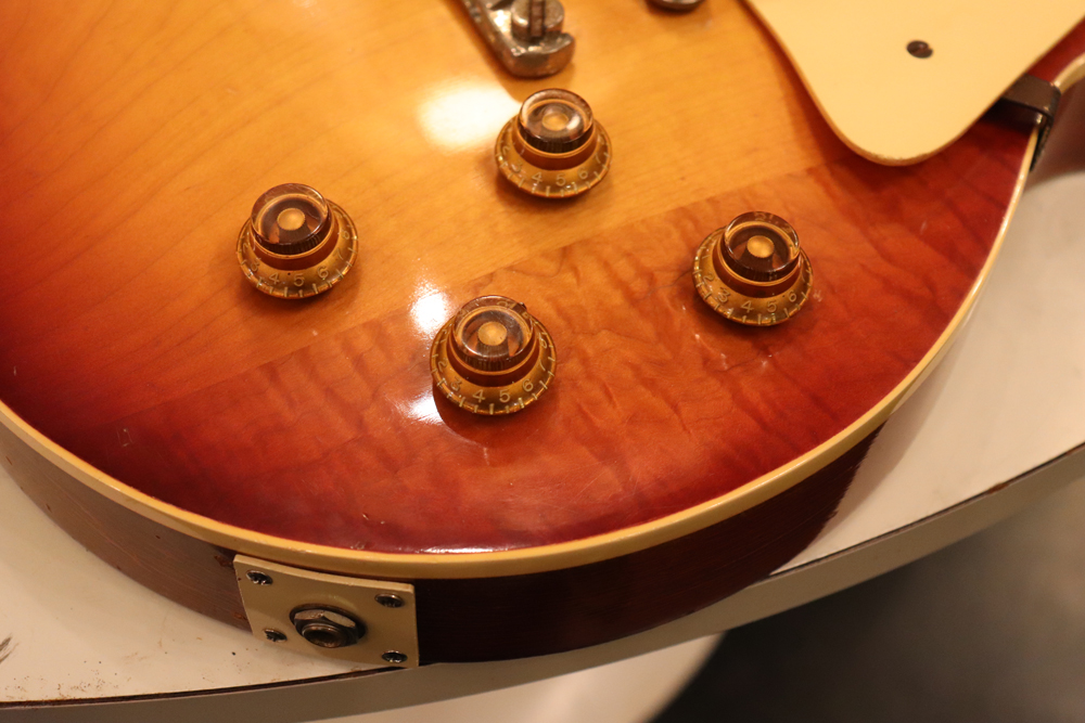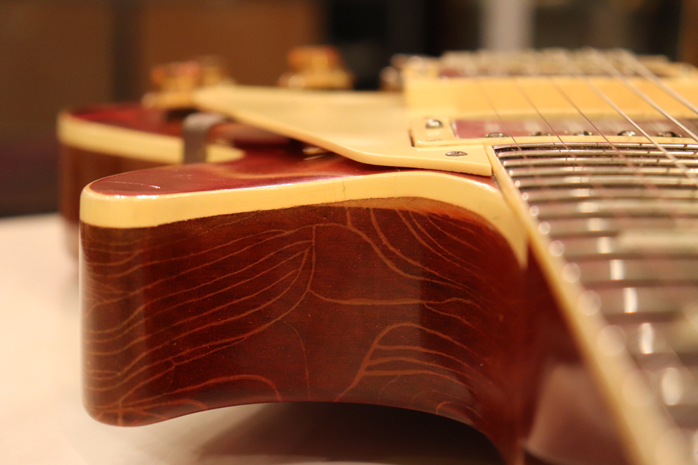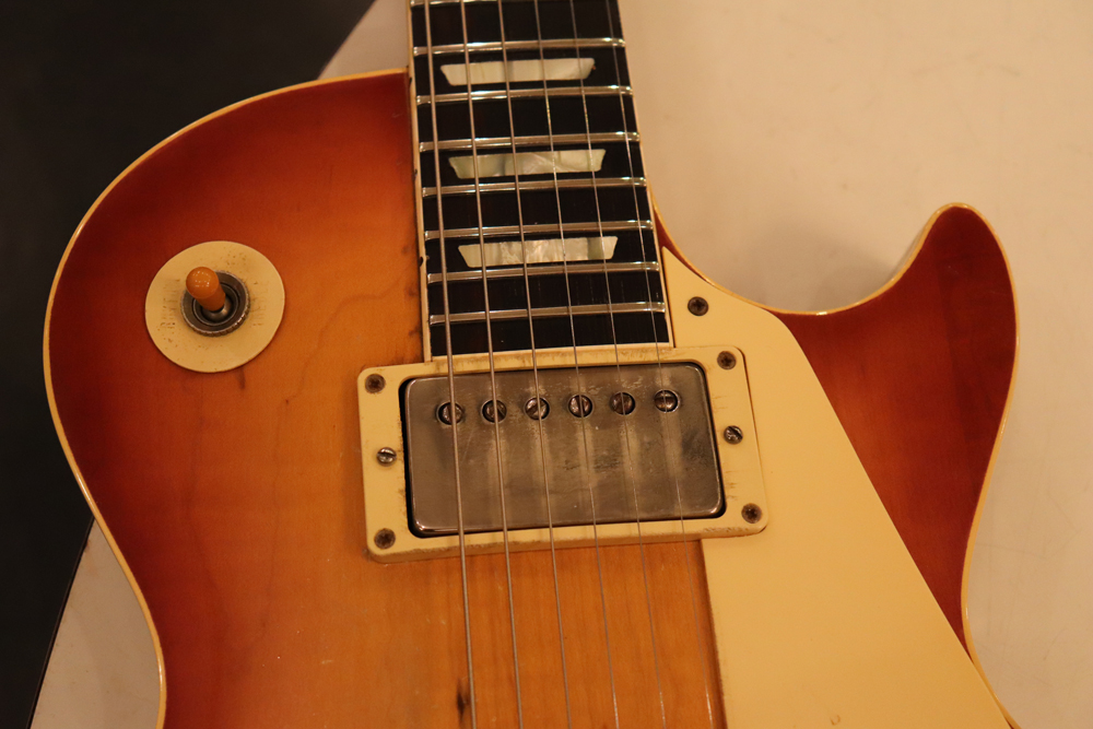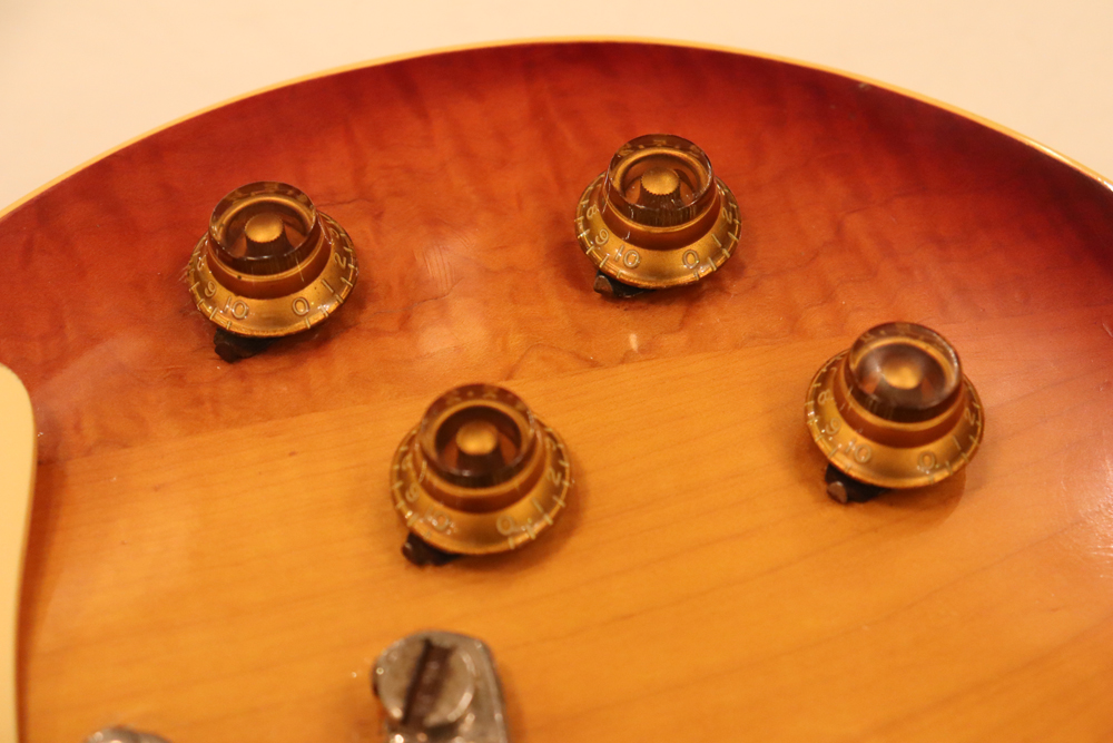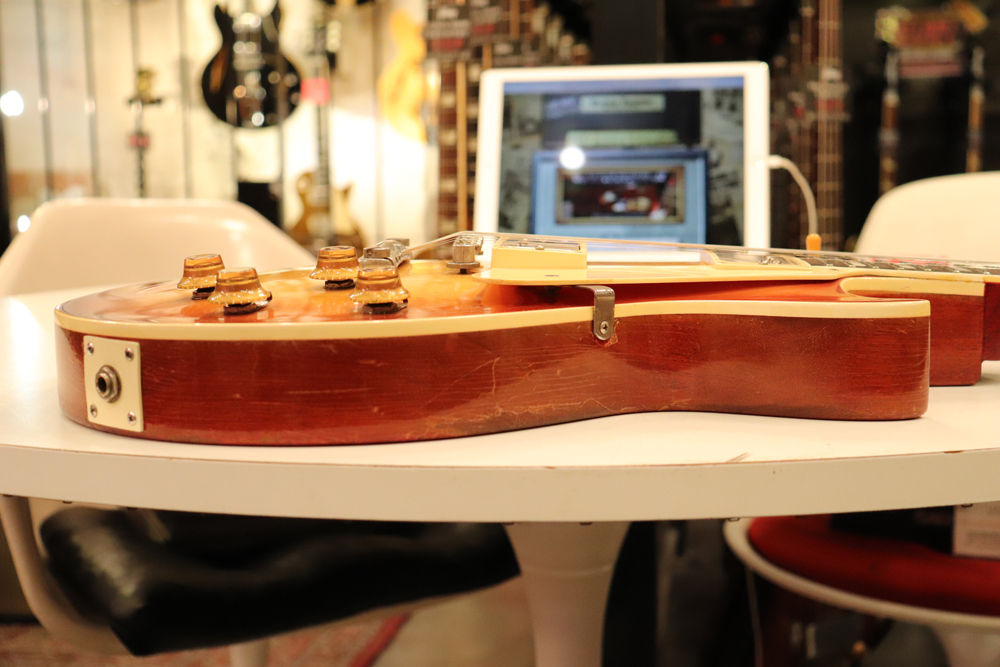 オリジナル・チューン・オー・マチック・ブリッジ仕様の、55〜56年製ゴールド・トップ・レス・ポールをベースに、バースト・スタイルにしたコンバージョン・レスポール!