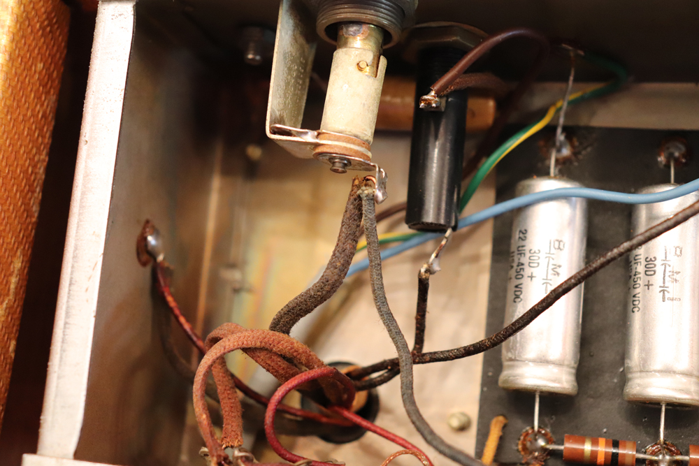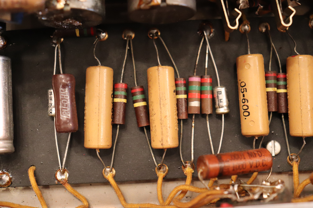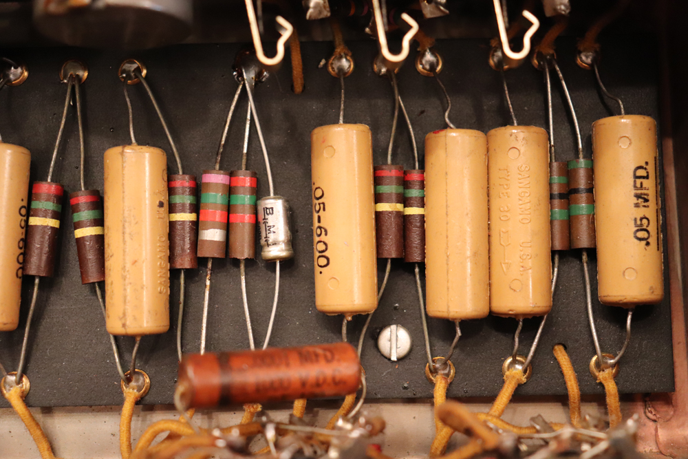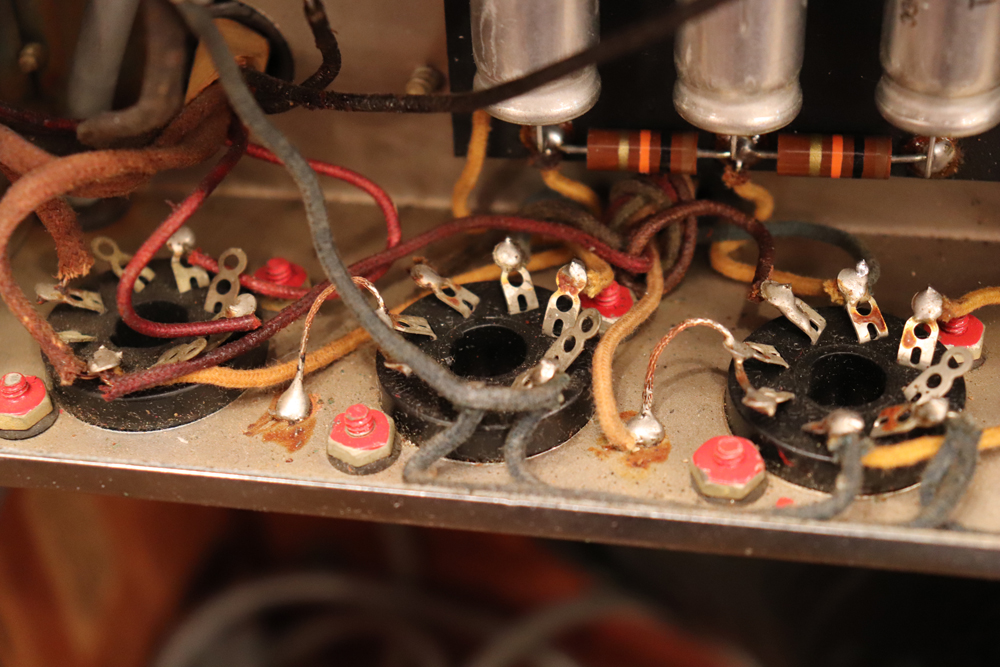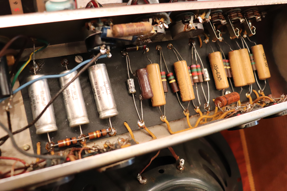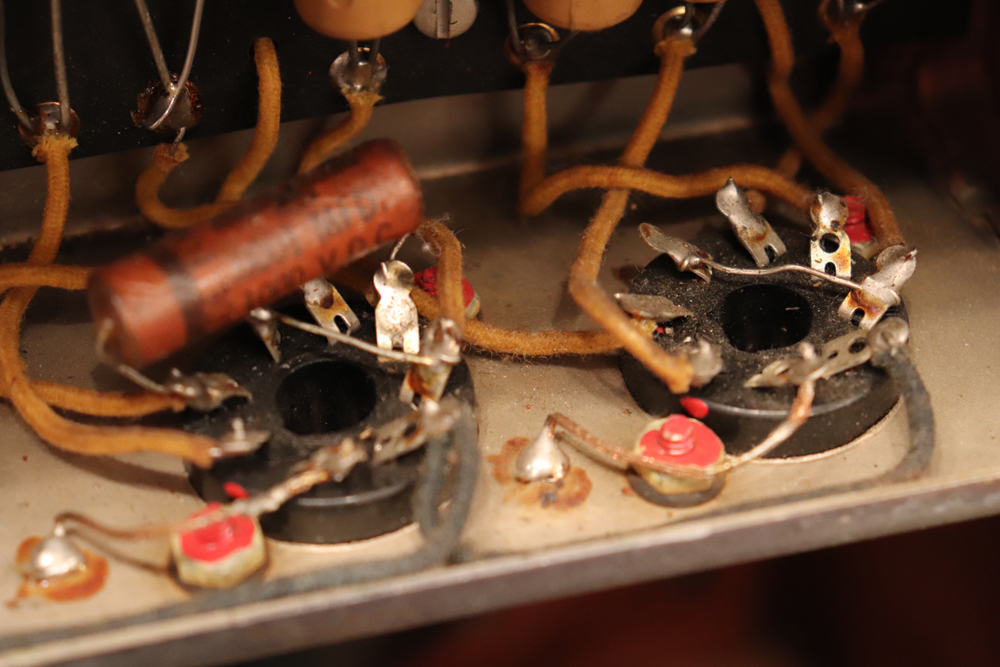 外観は年式也の使用感がありますが、既に70年前に生産されたアンプと考えますと、良いコンディションをキープしており、“TVフロント“ と呼ばれるギターアンプとしてはキュートなルックスはリヴィング・ルームにもとてもマッチします